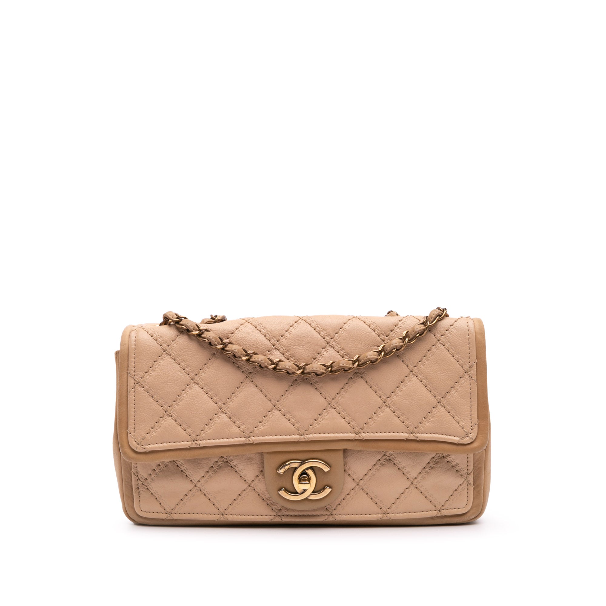 This shoulder bag features a quilted calfskin leather body, leather woven chain link straps, a front flap with turn lock closure, and an interior zip pocket. Inclusion: authenticity card. Retail Price: 3300.00