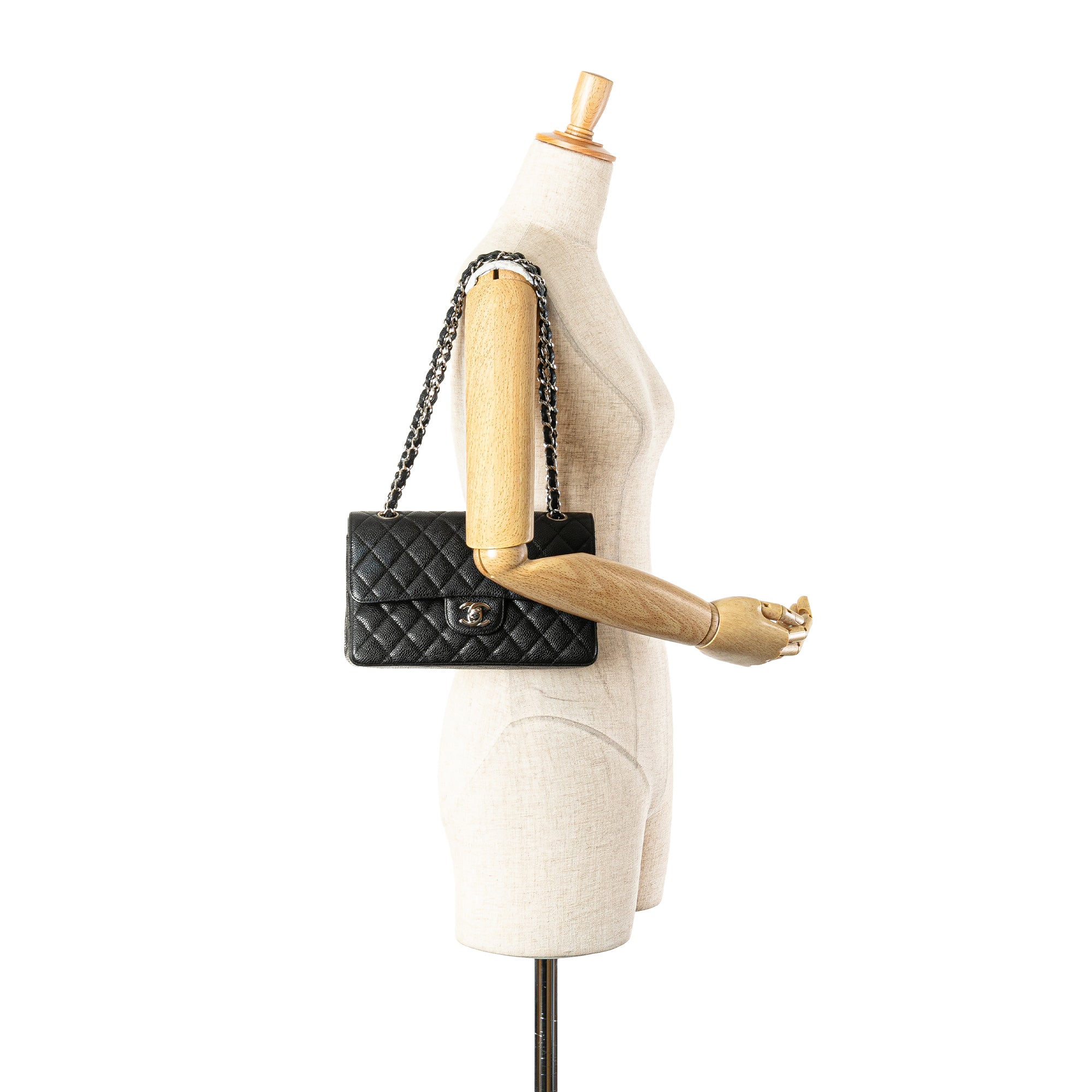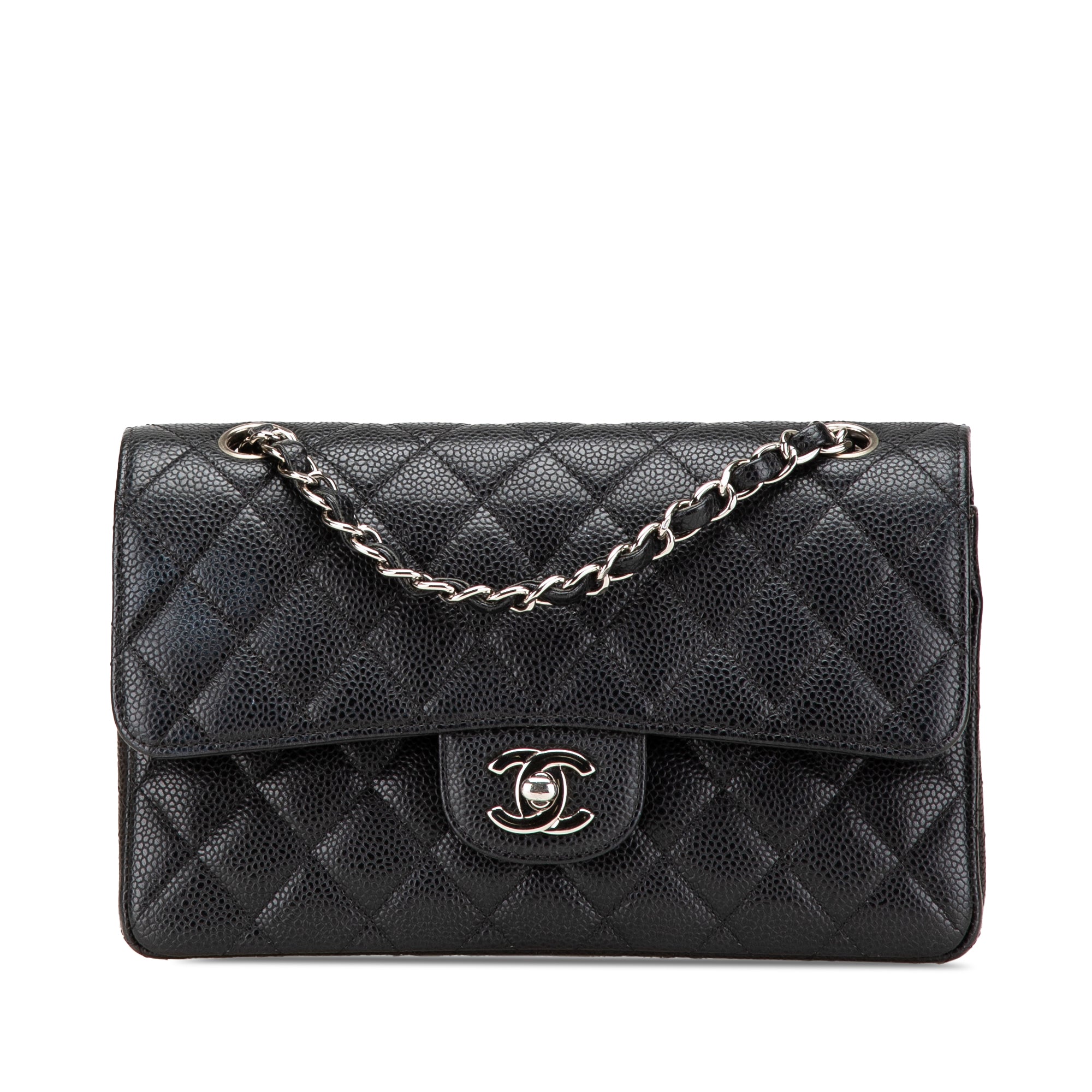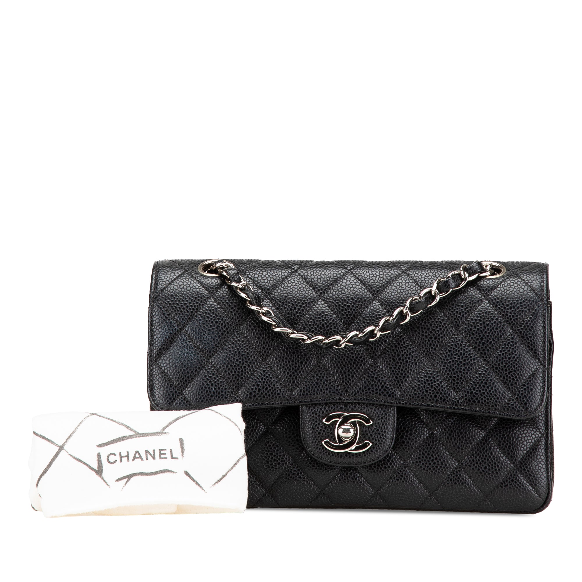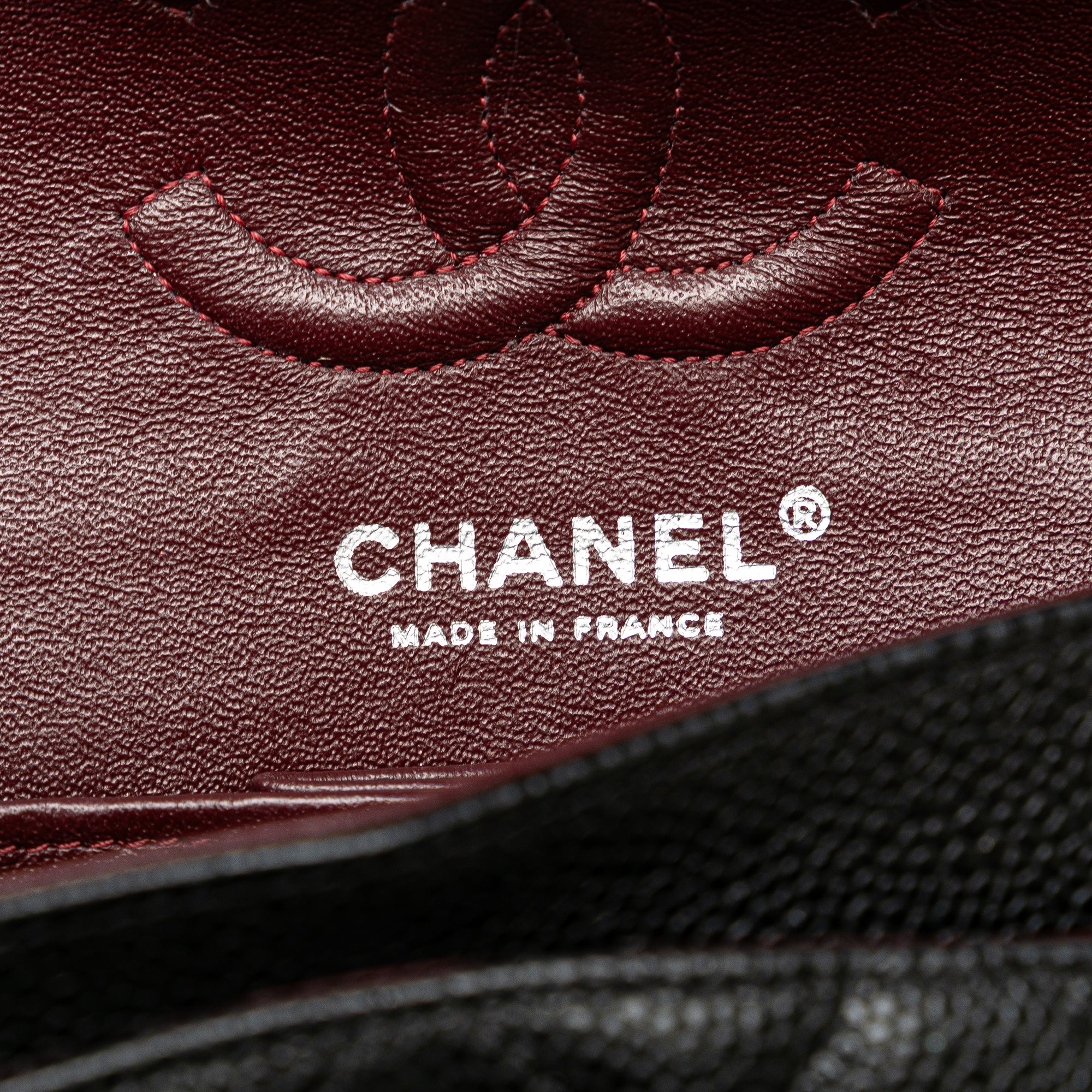 This shoulder bag features a quilted caviar leather body, leather woven chain straps, double front flaps with interlocking Cs and a twist lock closure, an exterior back slip pocket, and interior zip and slip pockets. Inclusion: Dust bag. Retail Price: 10200.00