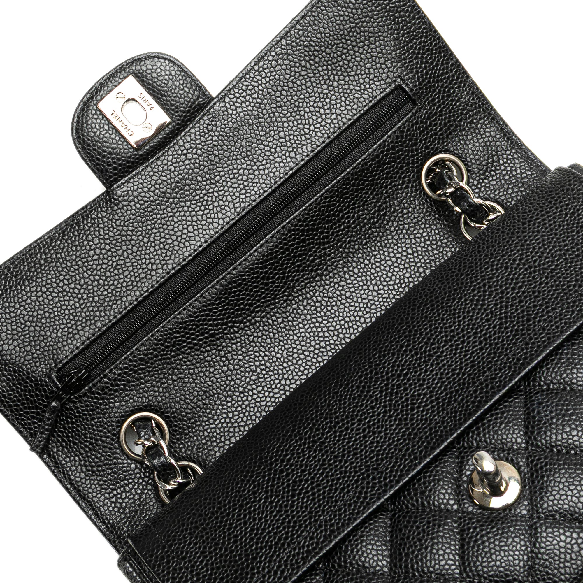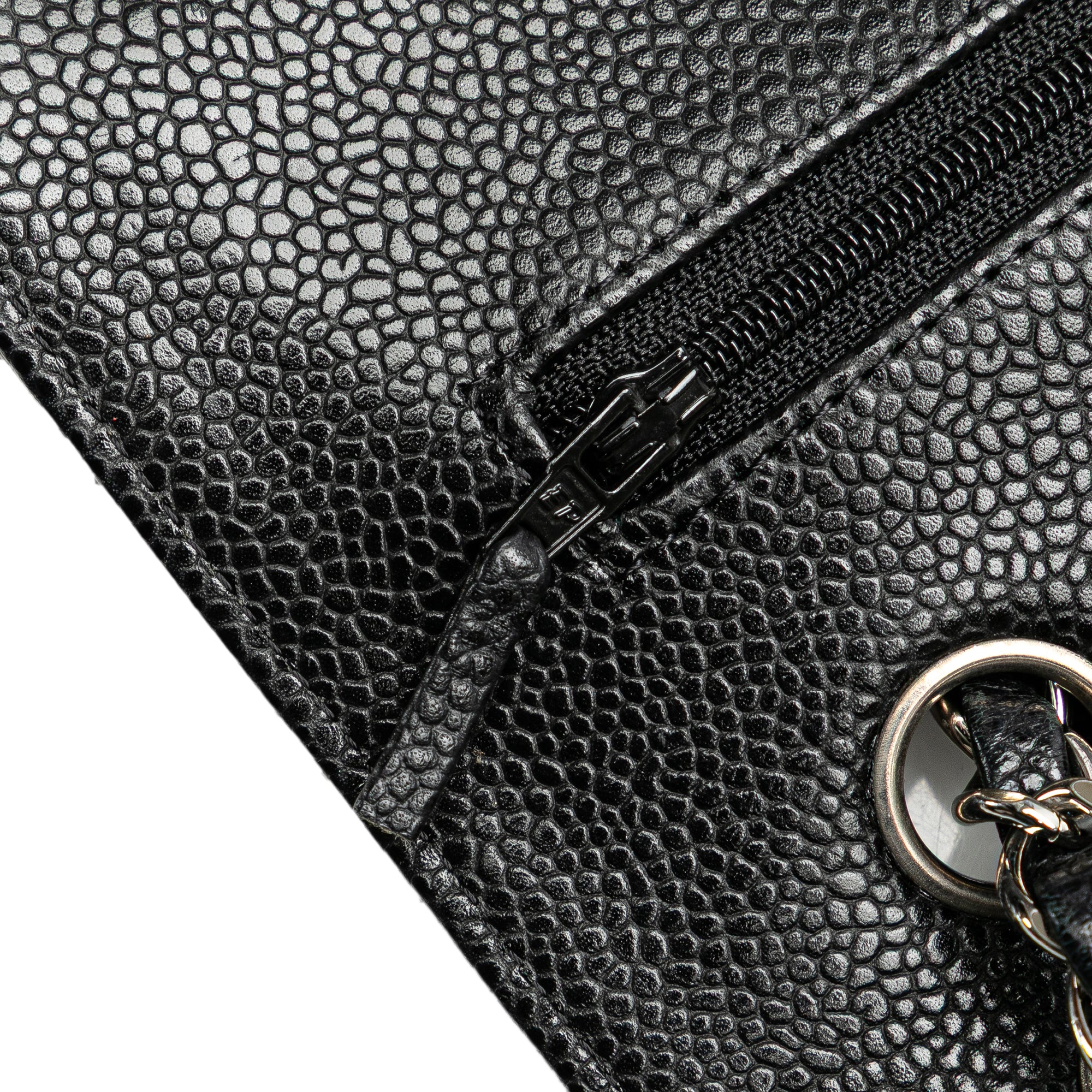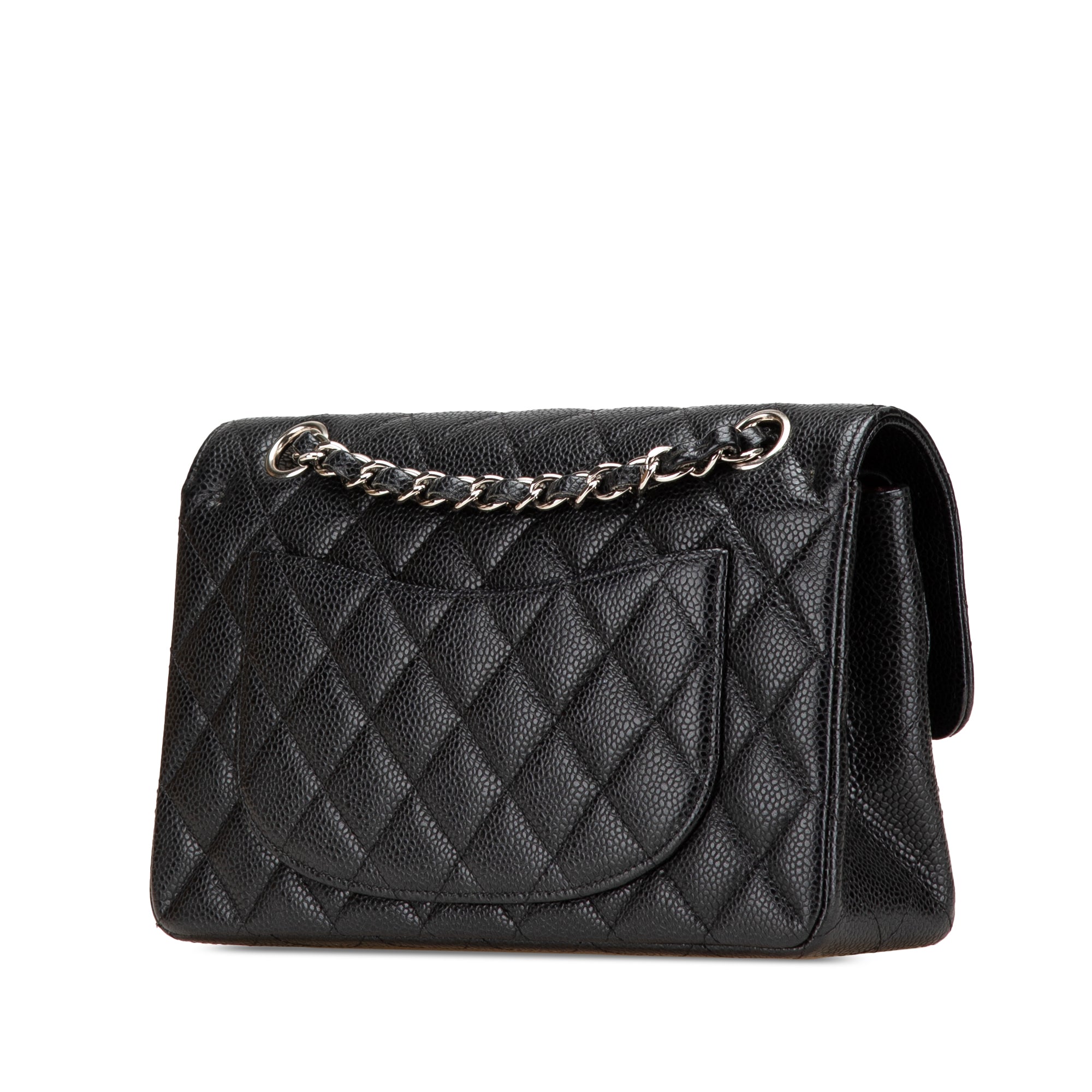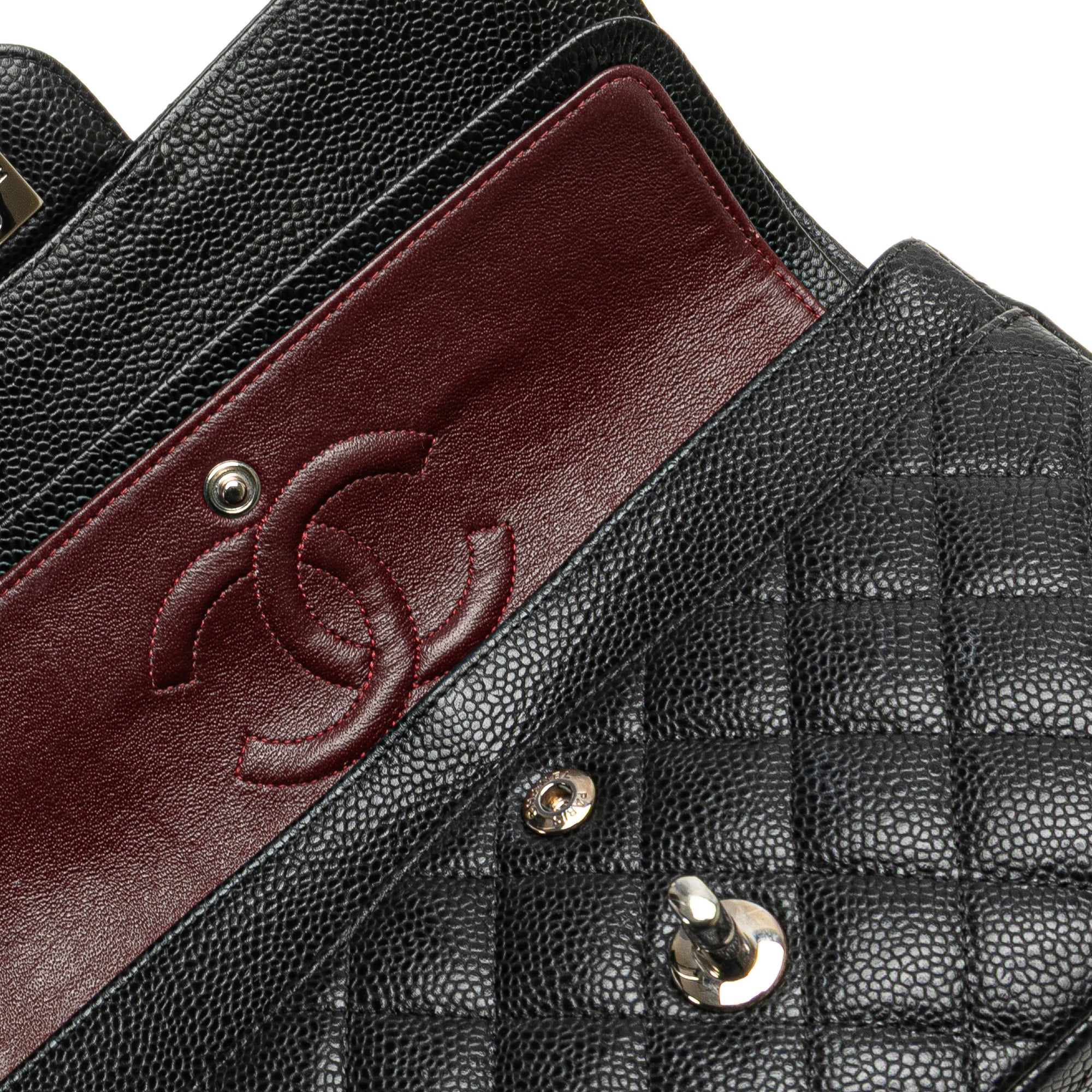 This shoulder bag features a quilted caviar leather body, leather woven chain straps, double front flaps with interlocking Cs and a twist lock closure, an exterior back slip pocket, and interior zip and slip pockets. Inclusion: Dust bag. Retail Price: 10200.00