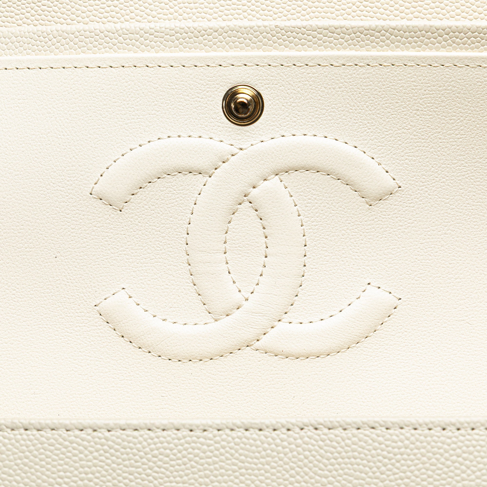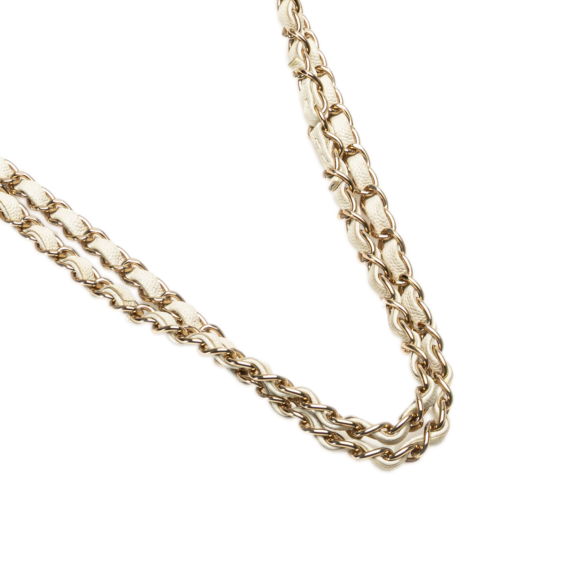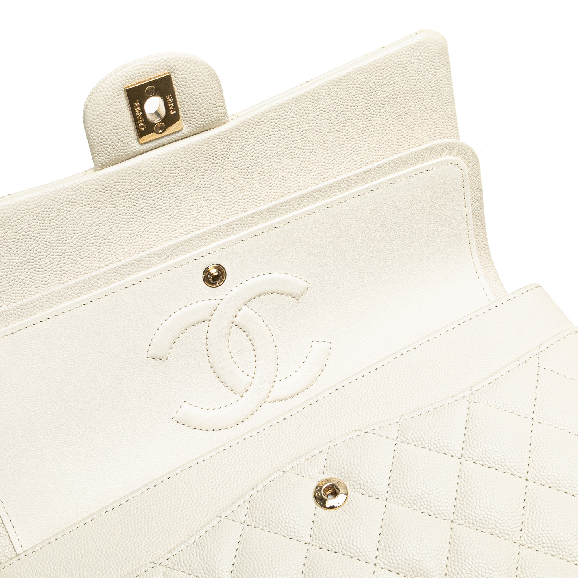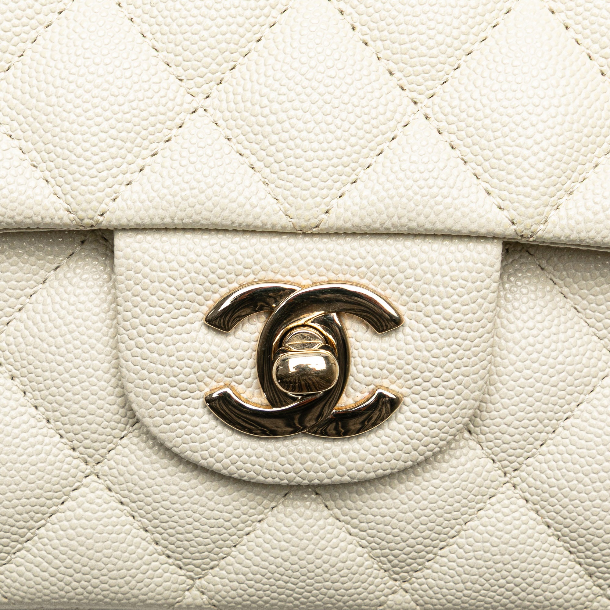 This shoulder bag features a quilted caviar body, leather woven chain straps, double front flaps with interlocking Cs and a twist lock closure, an exterior back slip pocket, and interior zip and slip pockets. Inclusion: Dust bag. Retail Price: 10500.00