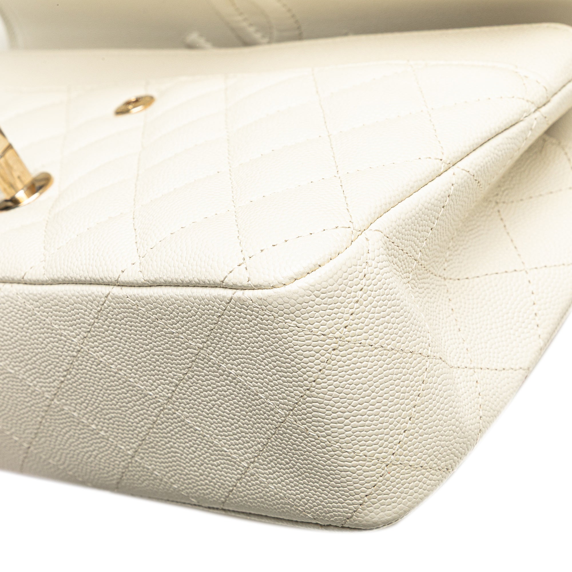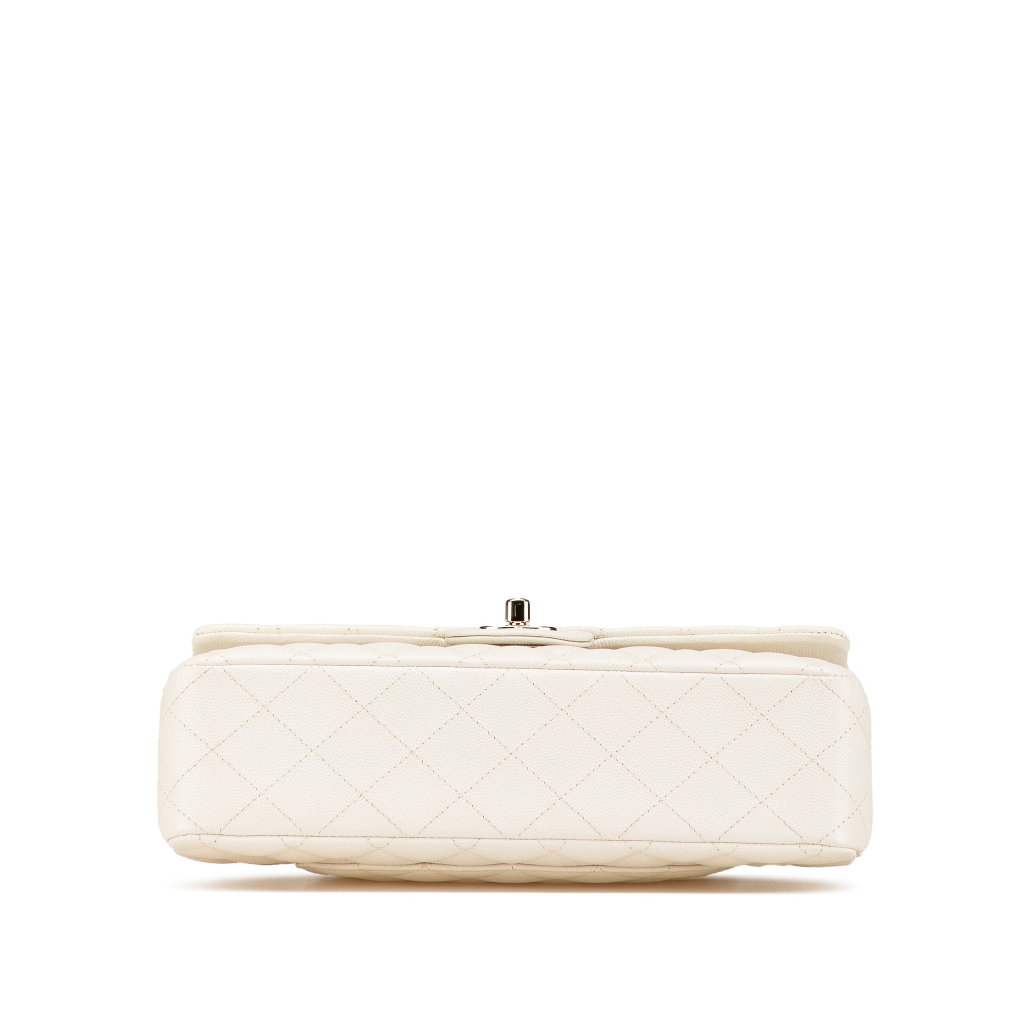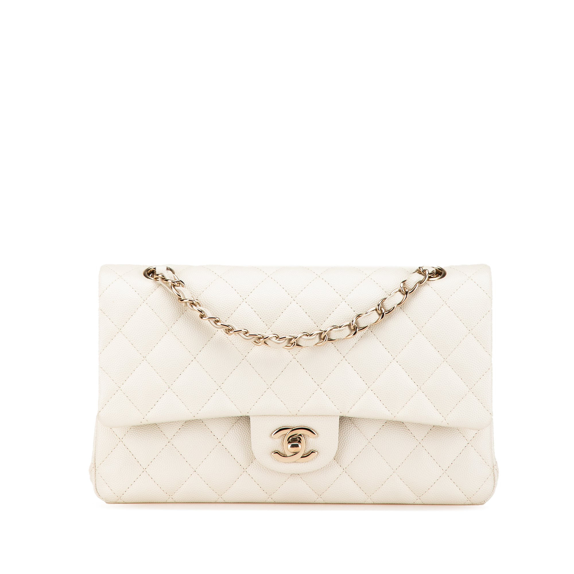 This shoulder bag features a quilted caviar body, leather woven chain straps, double front flaps with interlocking Cs and a twist lock closure, an exterior back slip pocket, and interior zip and slip pockets. Inclusion: Dust bag. Retail Price: 10500.00