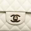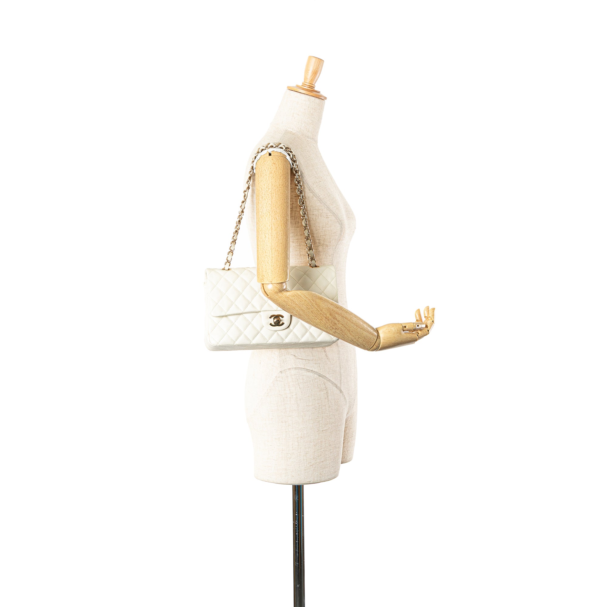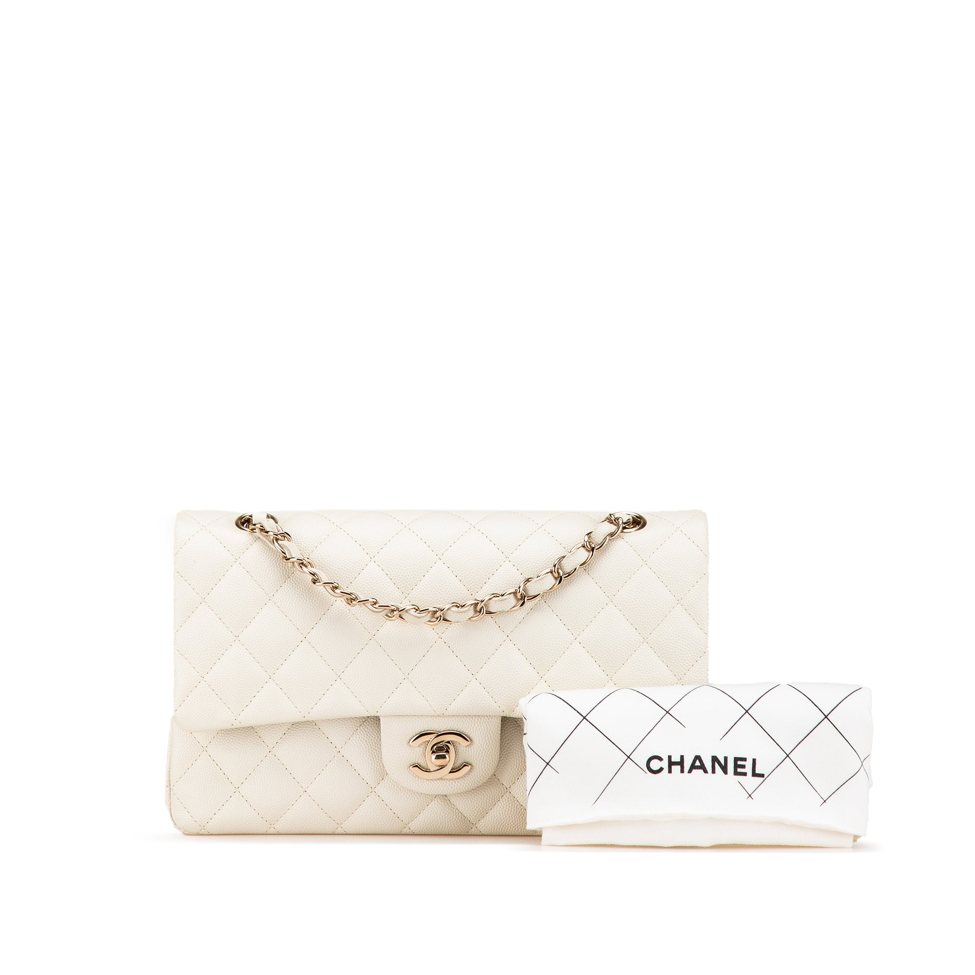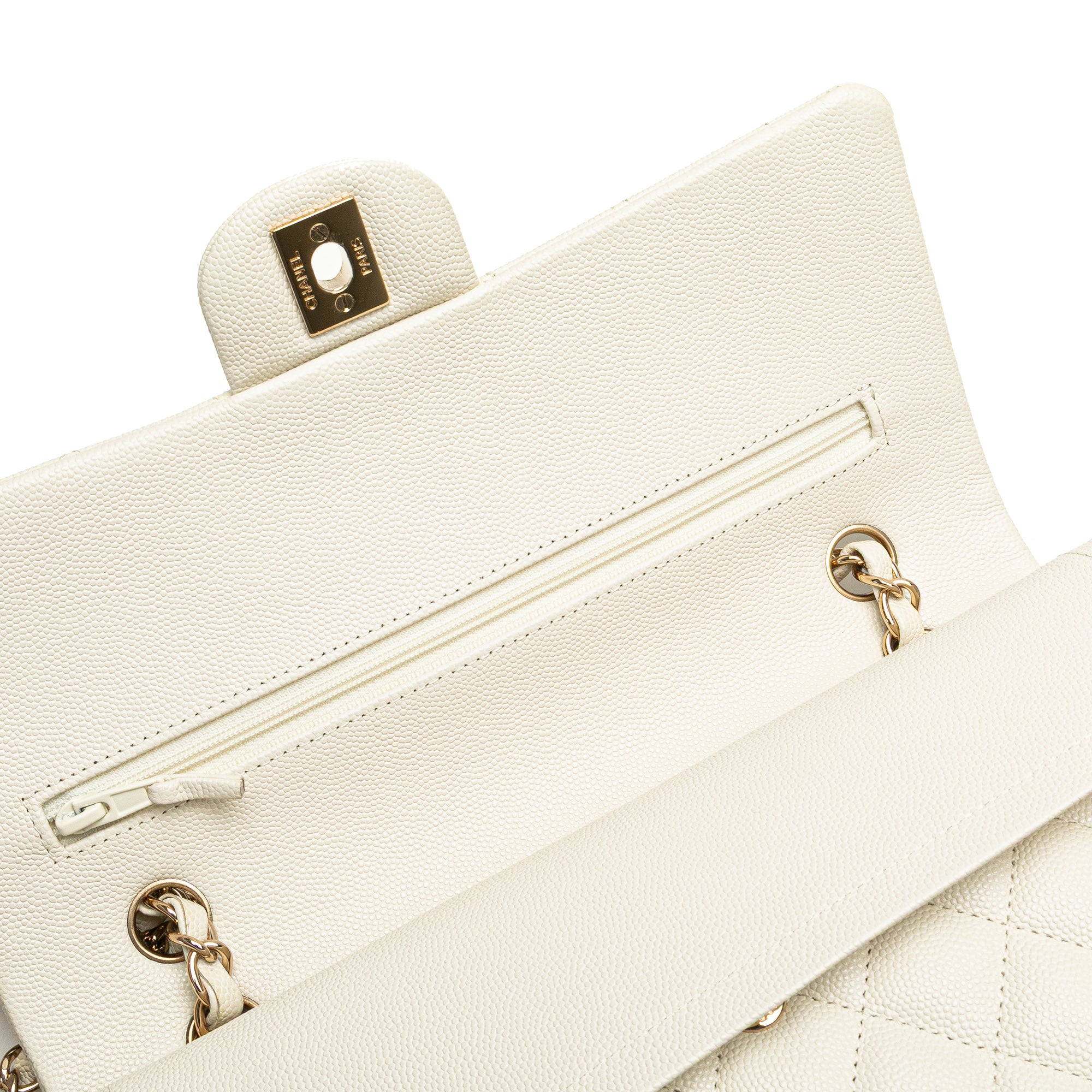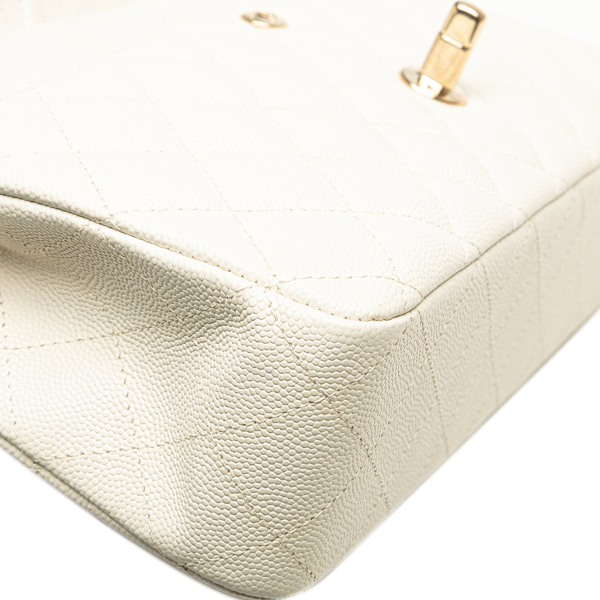This shoulder bag features a quilted caviar body, leather woven chain straps, double front flaps with interlocking Cs and a twist lock closure, an exterior back slip pocket, and interior zip and slip pockets. Inclusion: Dust bag. Retail Price: 10500.00