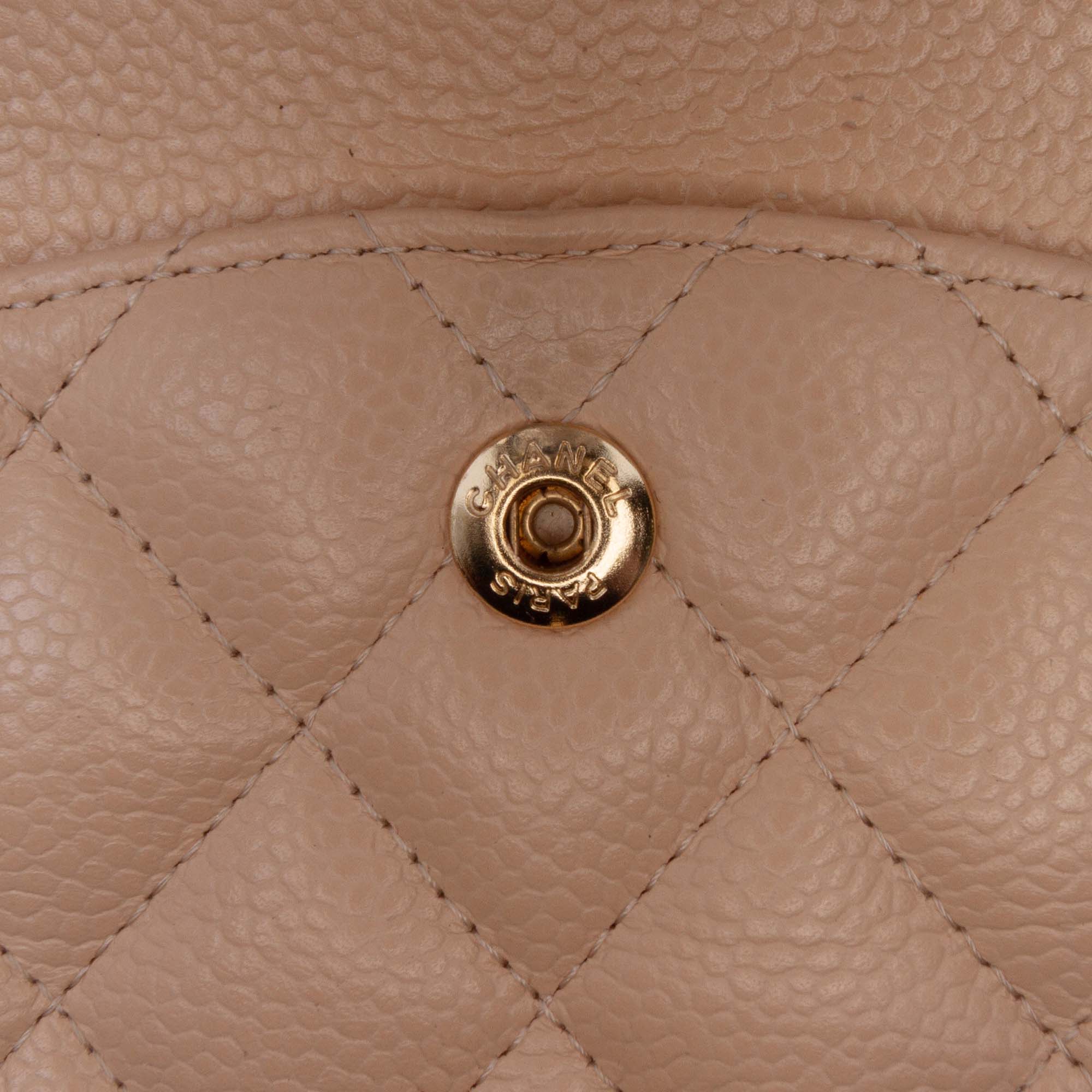 This shoulder bag features a quilted caviar leather body, a leather woven chain strap, double front flaps with CC turn-lock closure, an exterior back slip pocket, and interior slip pockets. Retail Price: 10200.00