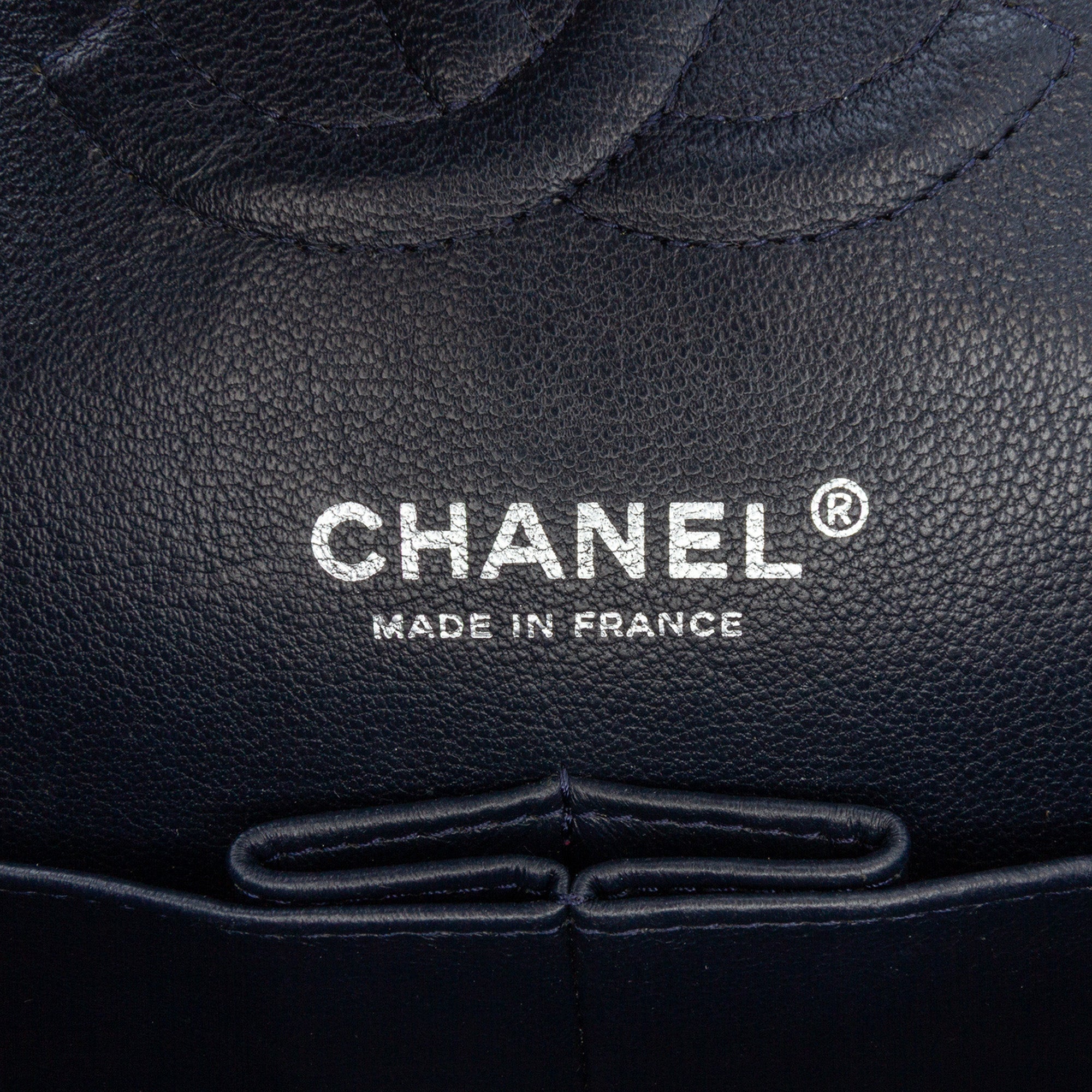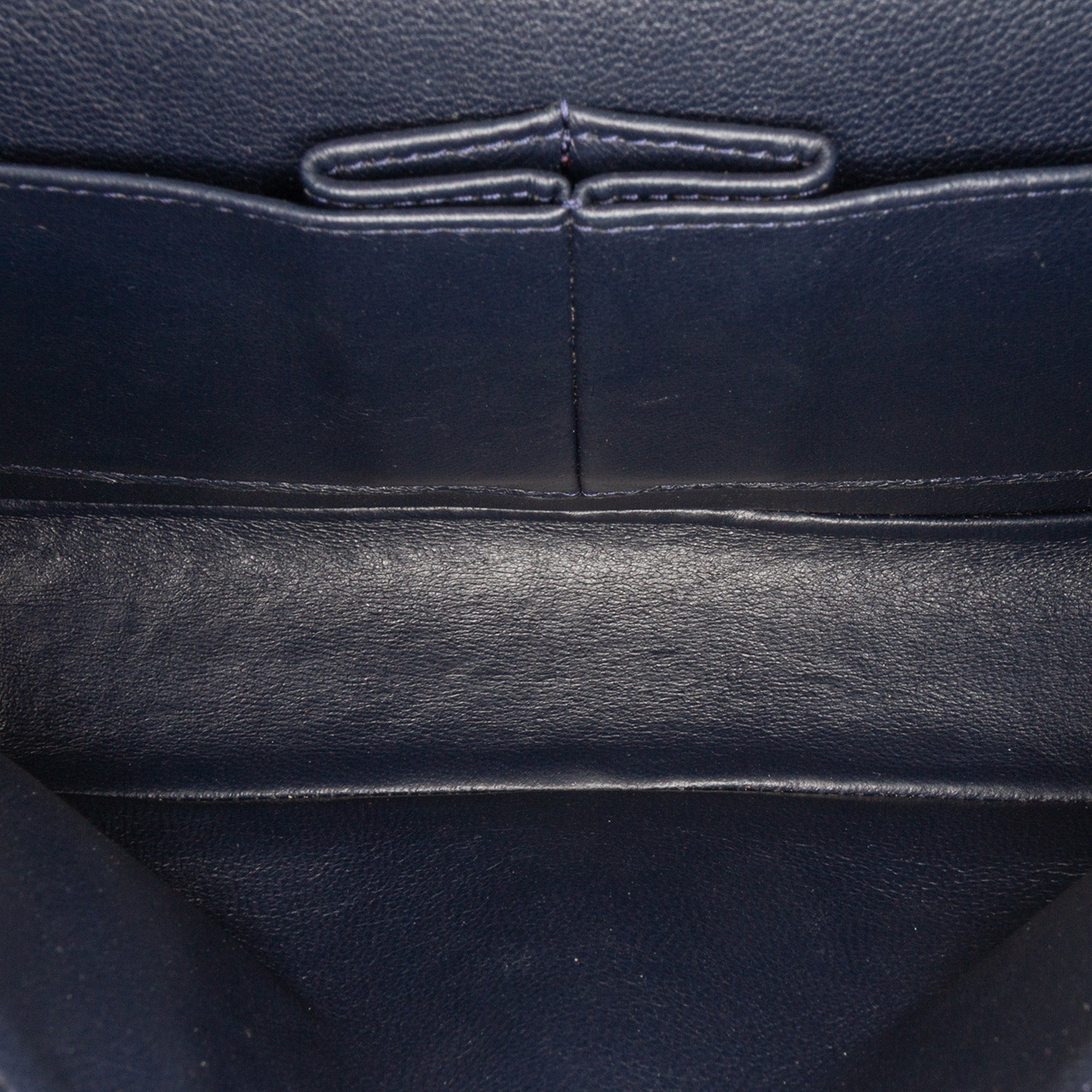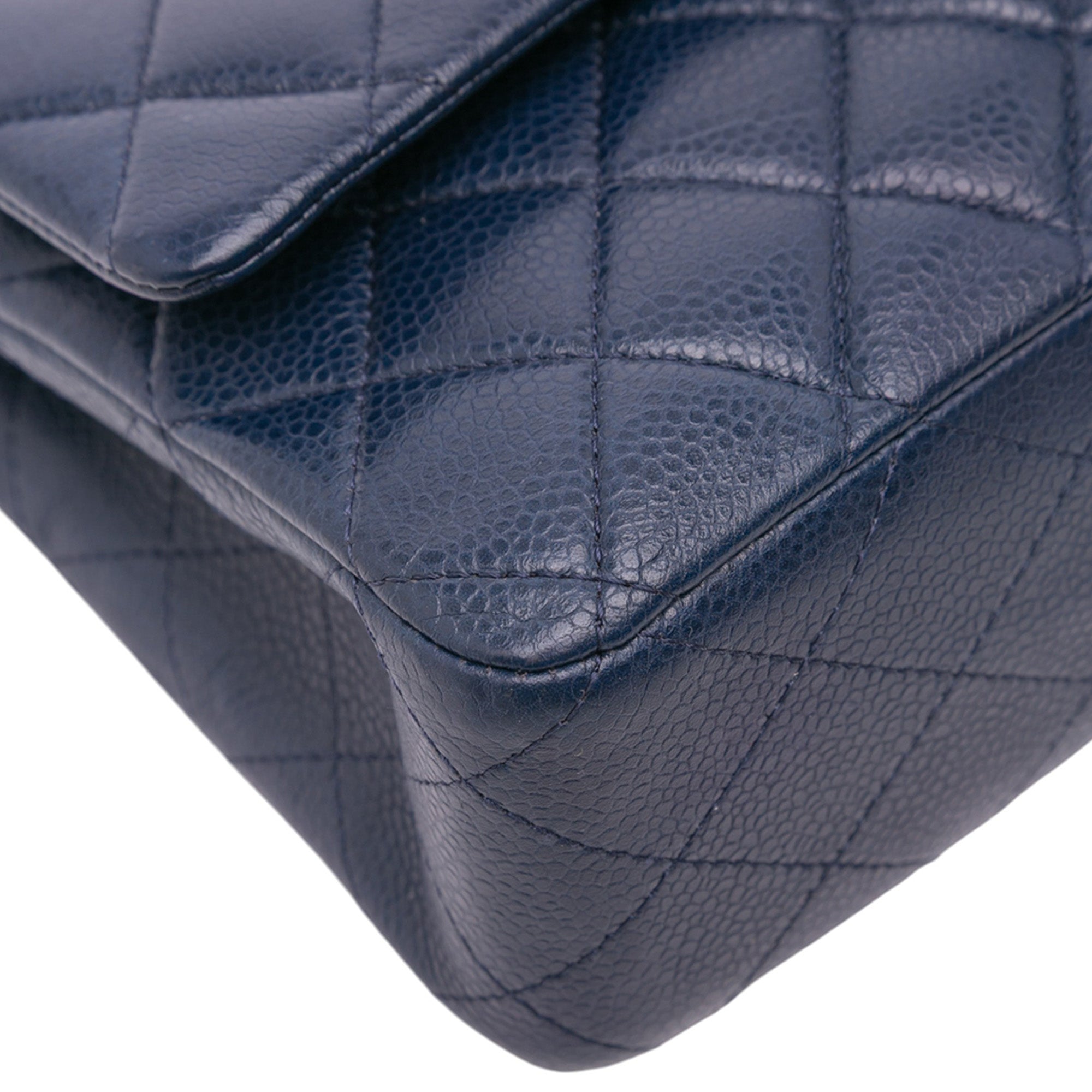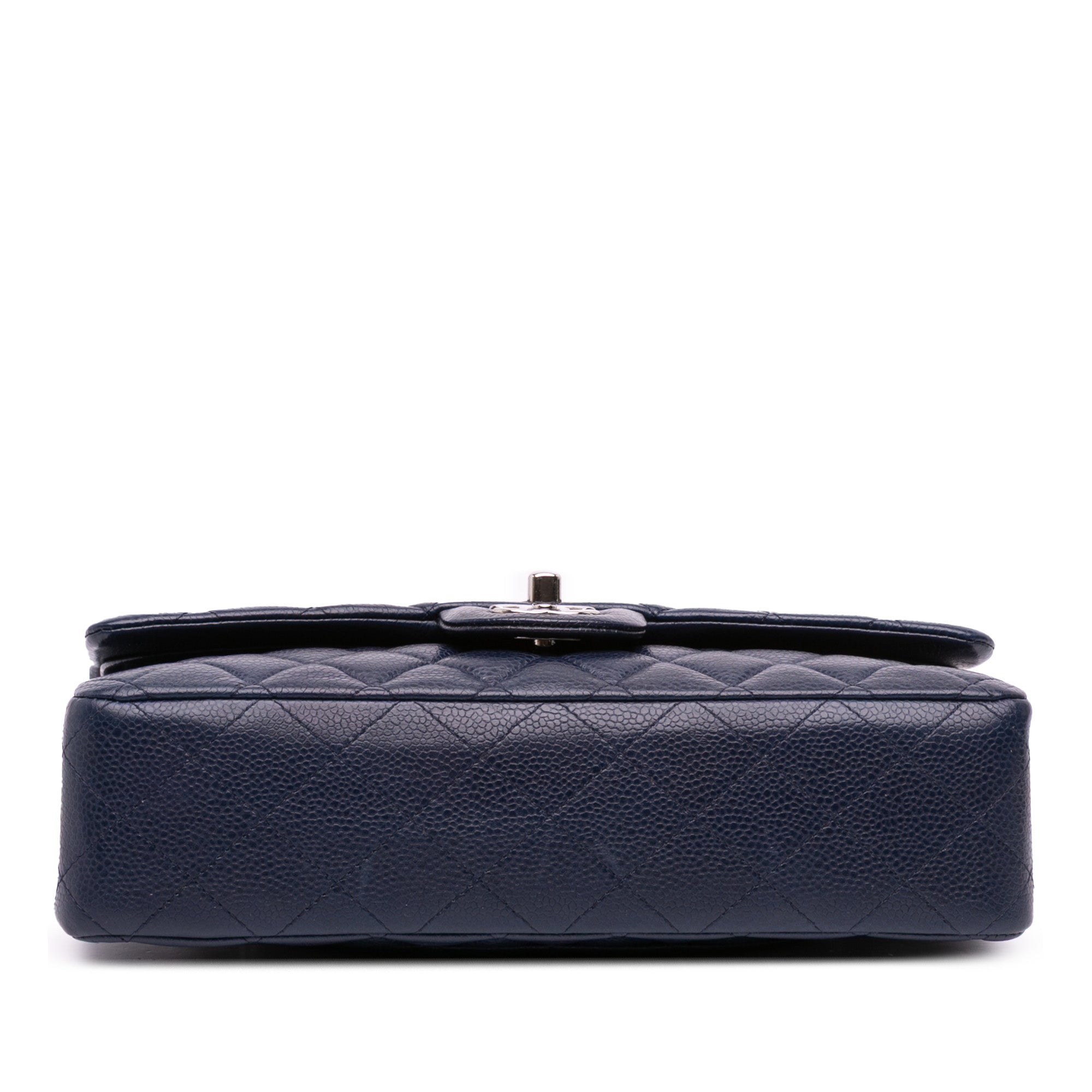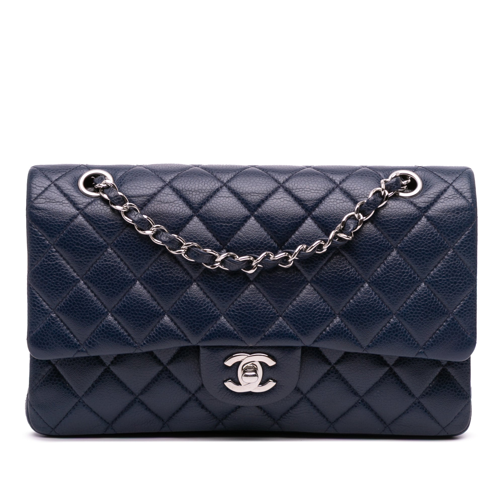 This shoulder bag features a quilted caviar leather body, silver-tone leather woven chain link shoulder straps, a double top flap with CC turn-lock closure, an exterior back slip pocket, and interior zip and slip pockets. Retail Price: 10500.00