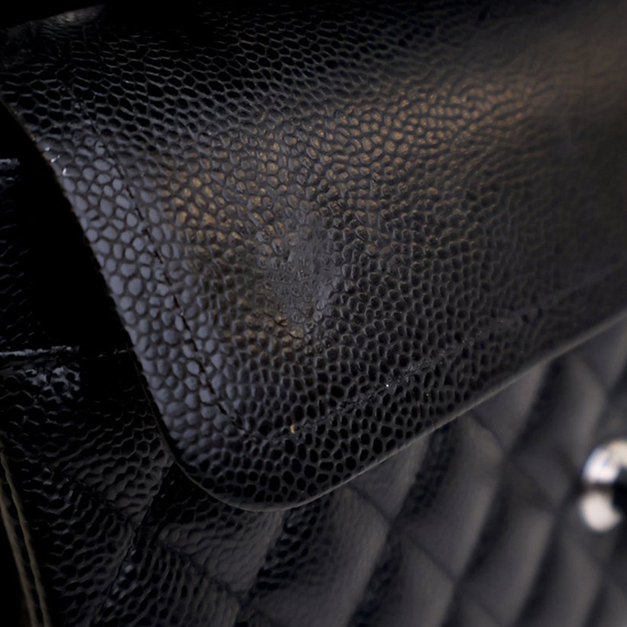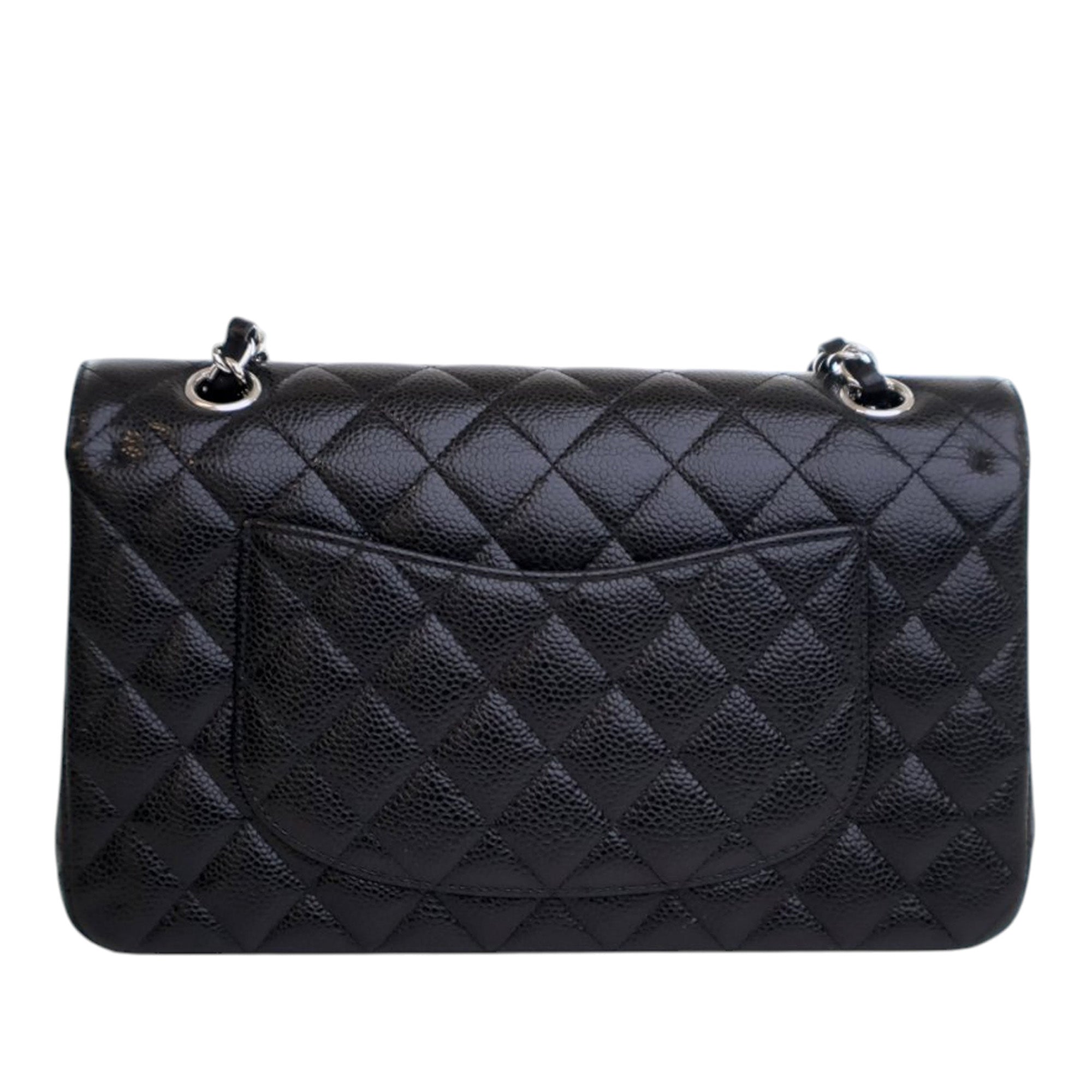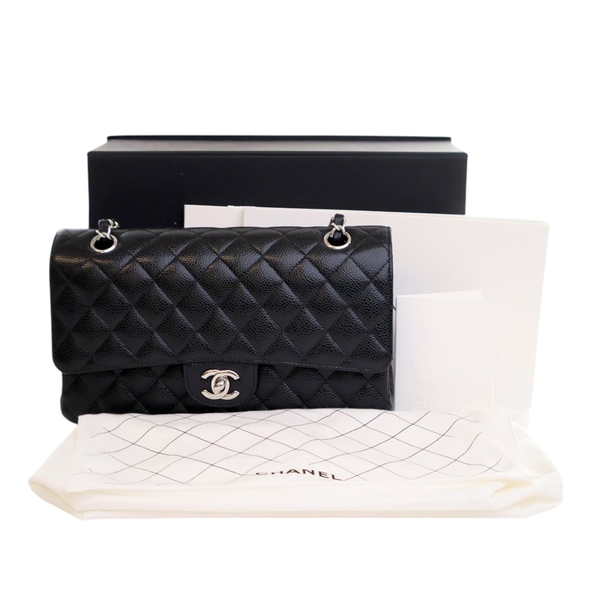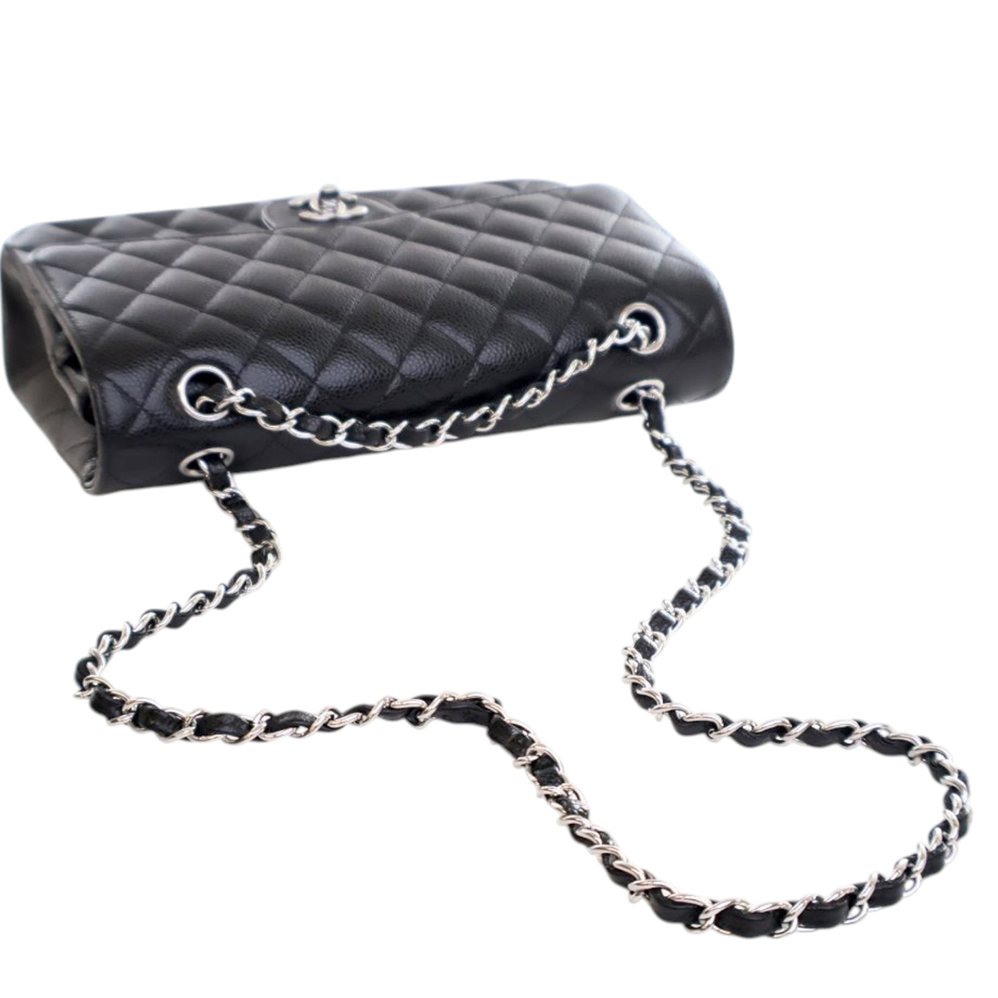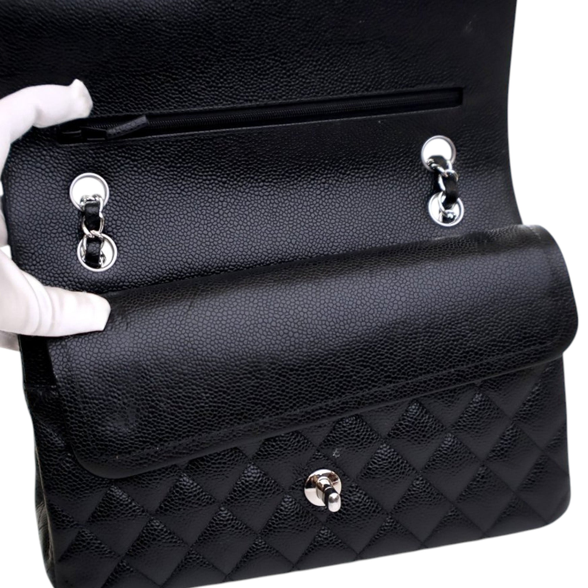 This shoulder bag features a quilted caviar leather body, a silver-tone leather woven chain link shoulder straps, double front flaps with interlocking Cs and a twist lock closure, an exterior back slip pocket, and interior zip and slip pockets. Inclusion: Dust bag, box. Retail Price: 10200.00