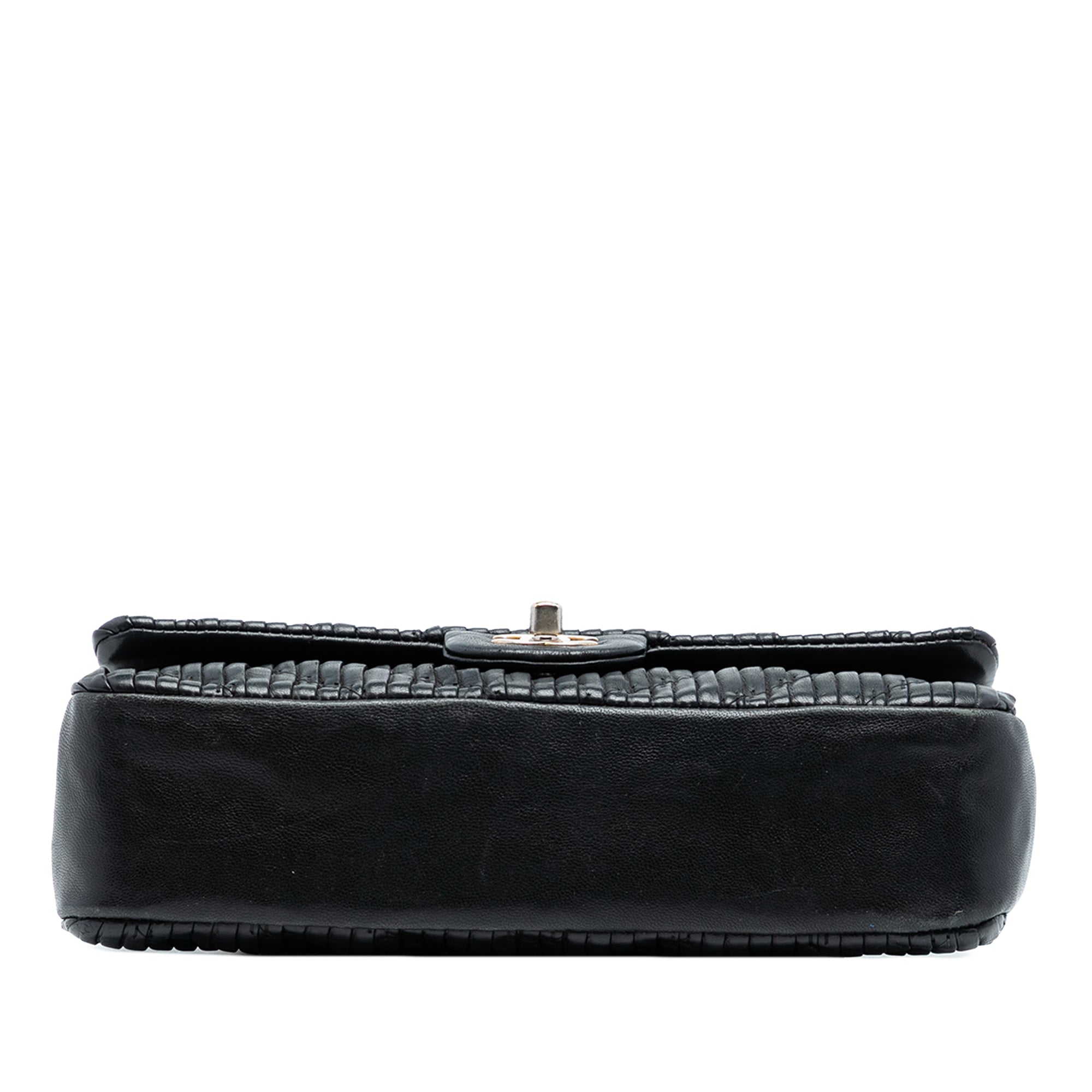 This shoulder bag features a quilted leather body, leather woven chain link shoulder straps, front flaps with interlocking Cs and twist lock closure, an exterior back slip pocket, and interior zip and slip pockets. Retail Price: 8300.00