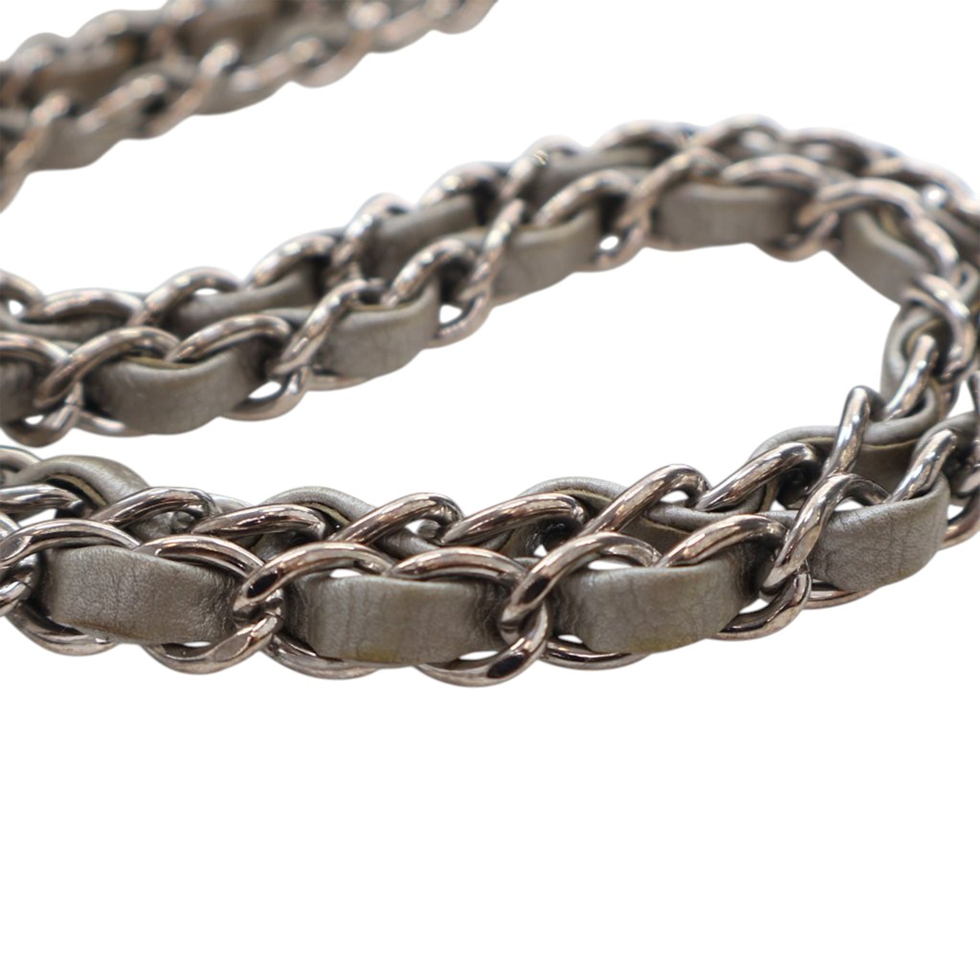 This shoulder bag features a quilted caviar leather body, leather-woven chain shoulder straps, double front flaps with interlocking Cs and twist lock closure, an exterior back slip pocket, and interior zip and slip pockets. Inclusion: Dust bag. Retail Price: 10500.00
