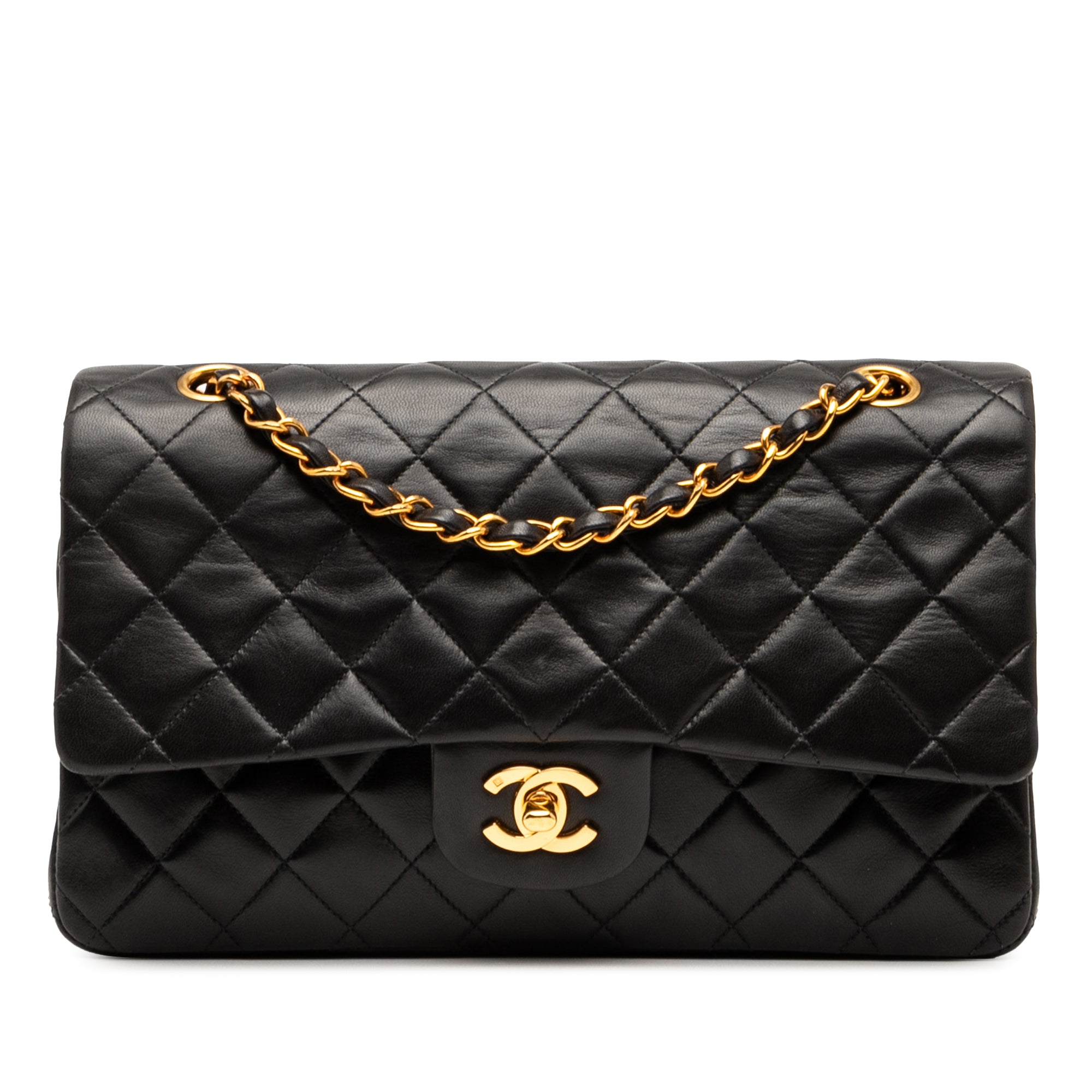 This shoulder bag features a quilted lambskin body, leather woven chain straps, double front flaps with interlocking Cs and a twist lock closure, an exterior back slip pocket, and interior slip pockets. Inclusion: authenticity card. Retail Price: 10200.00