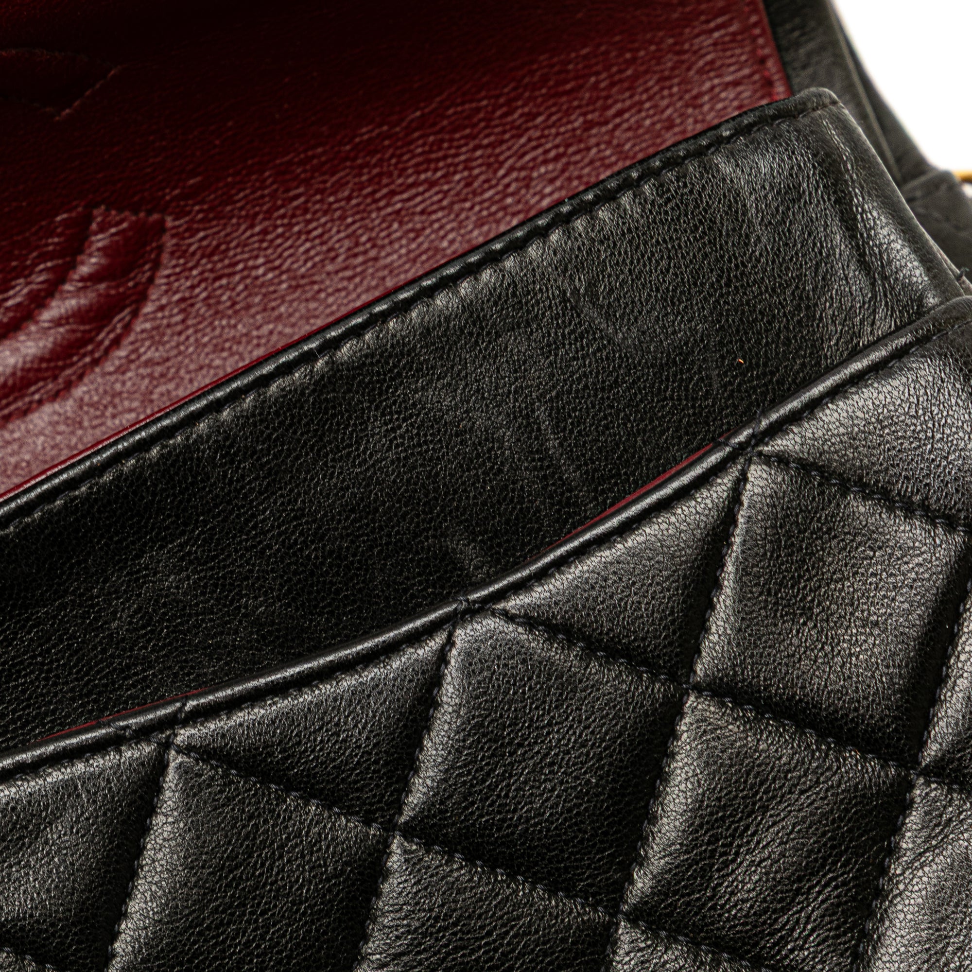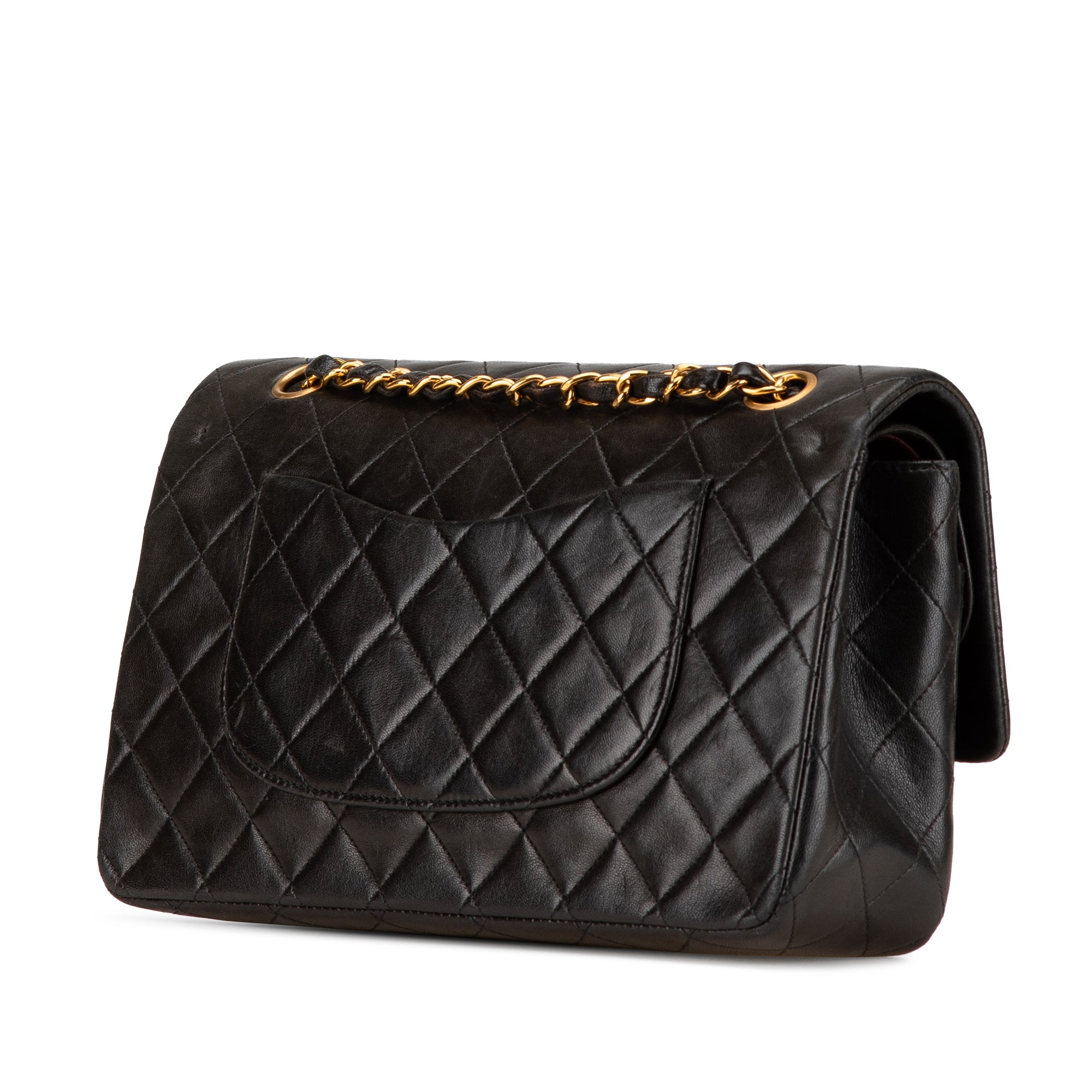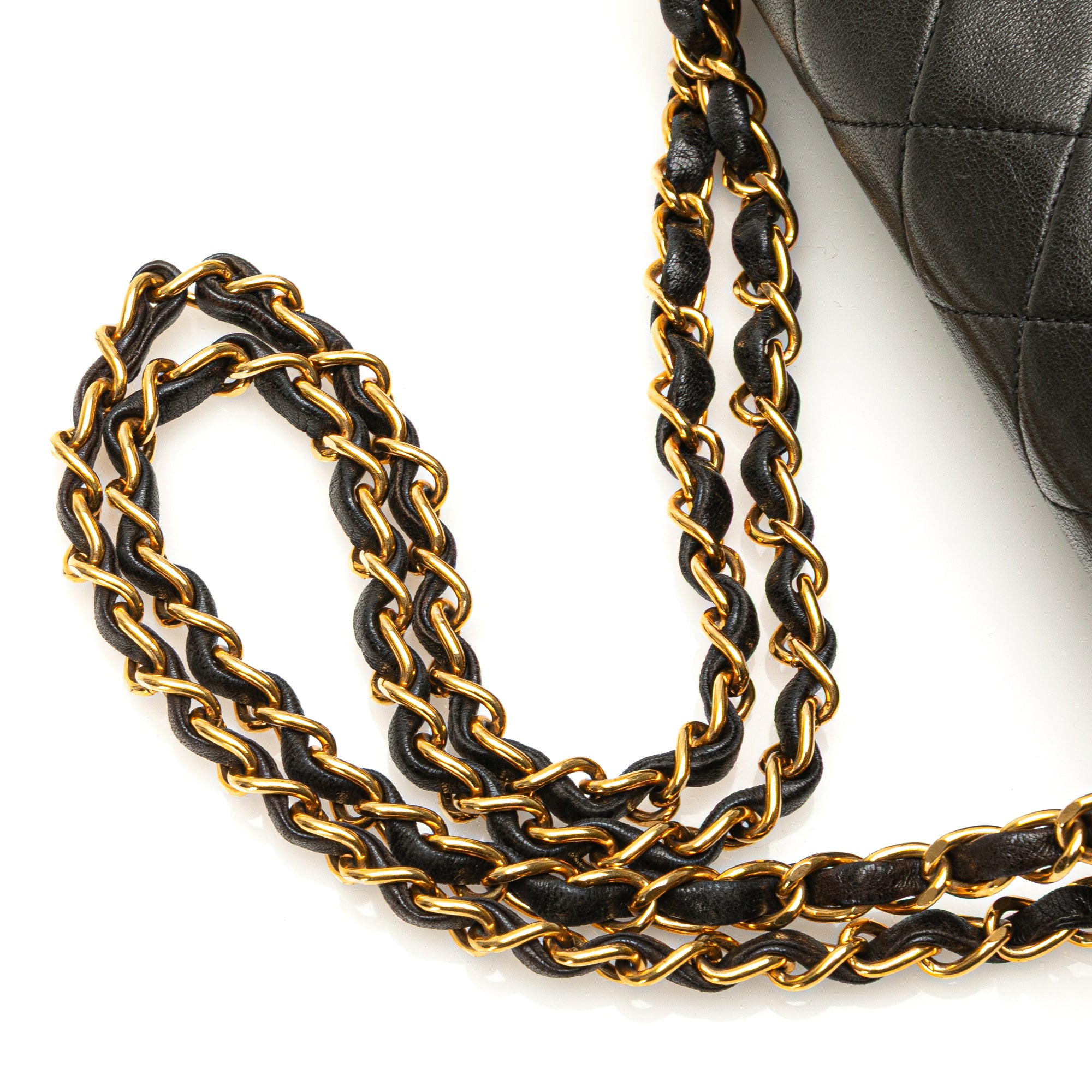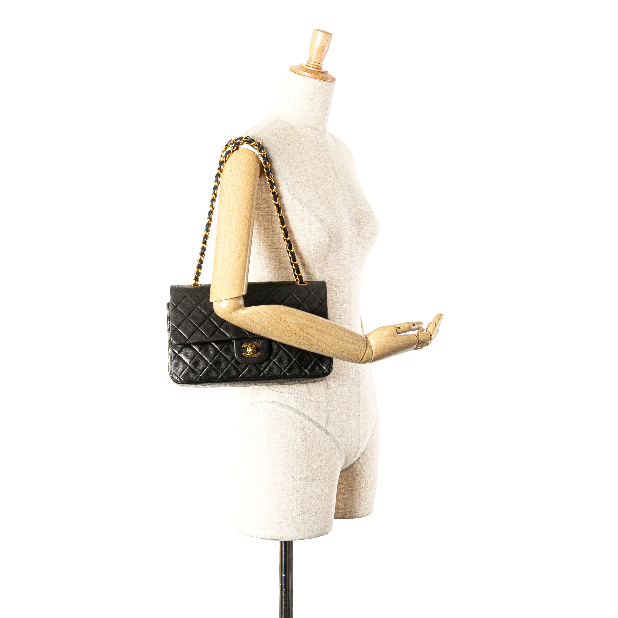 This shoulder bag features a quilted lambskin body, an exterior back slip pocket, leather woven chain straps, double front flaps with interlocking Cs and a twist lock closure, and interior zip and slip pockets. Retail Price: 10200.00