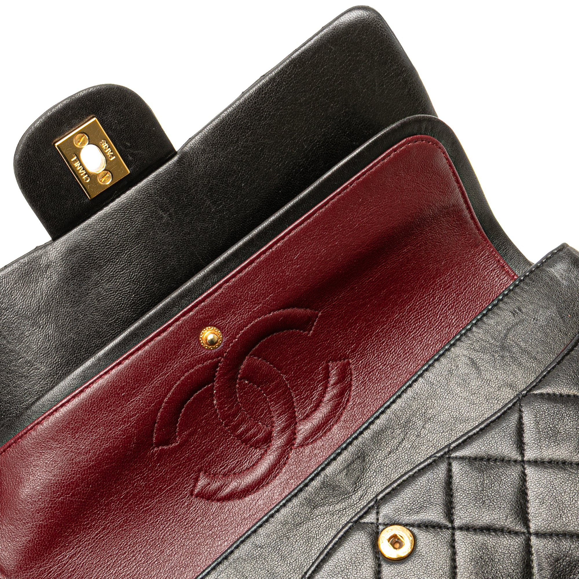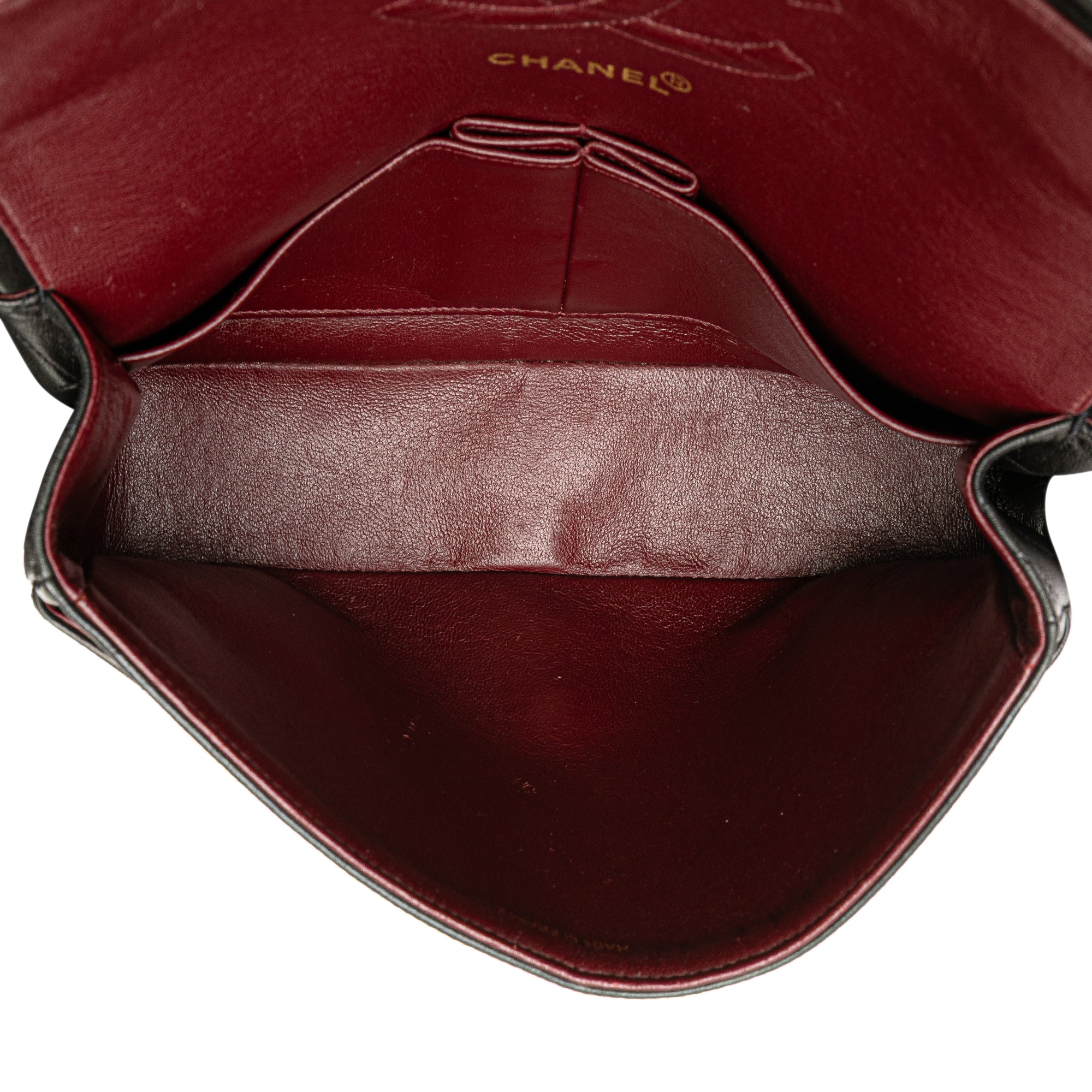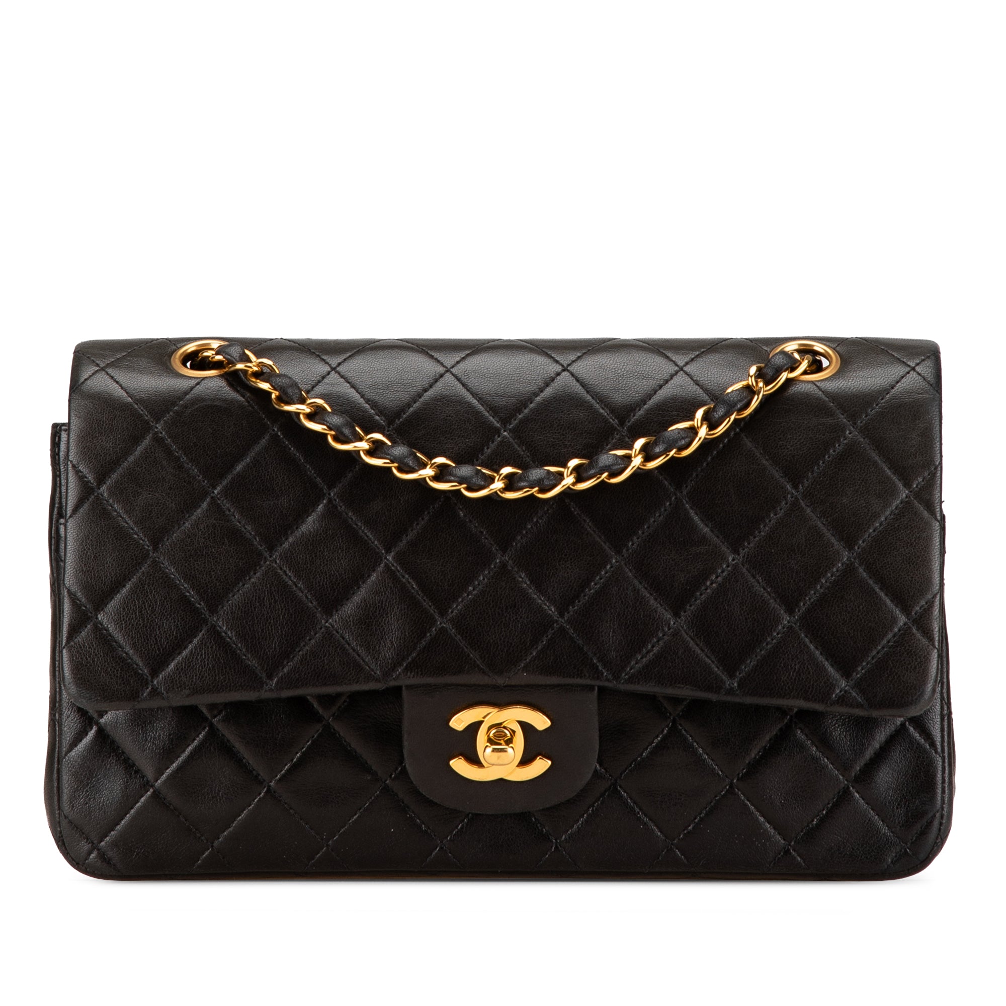 This shoulder bag features a quilted lambskin body, an exterior back slip pocket, leather woven chain straps, double front flaps with interlocking Cs and a twist lock closure, and interior zip and slip pockets. Retail Price: 10200.00