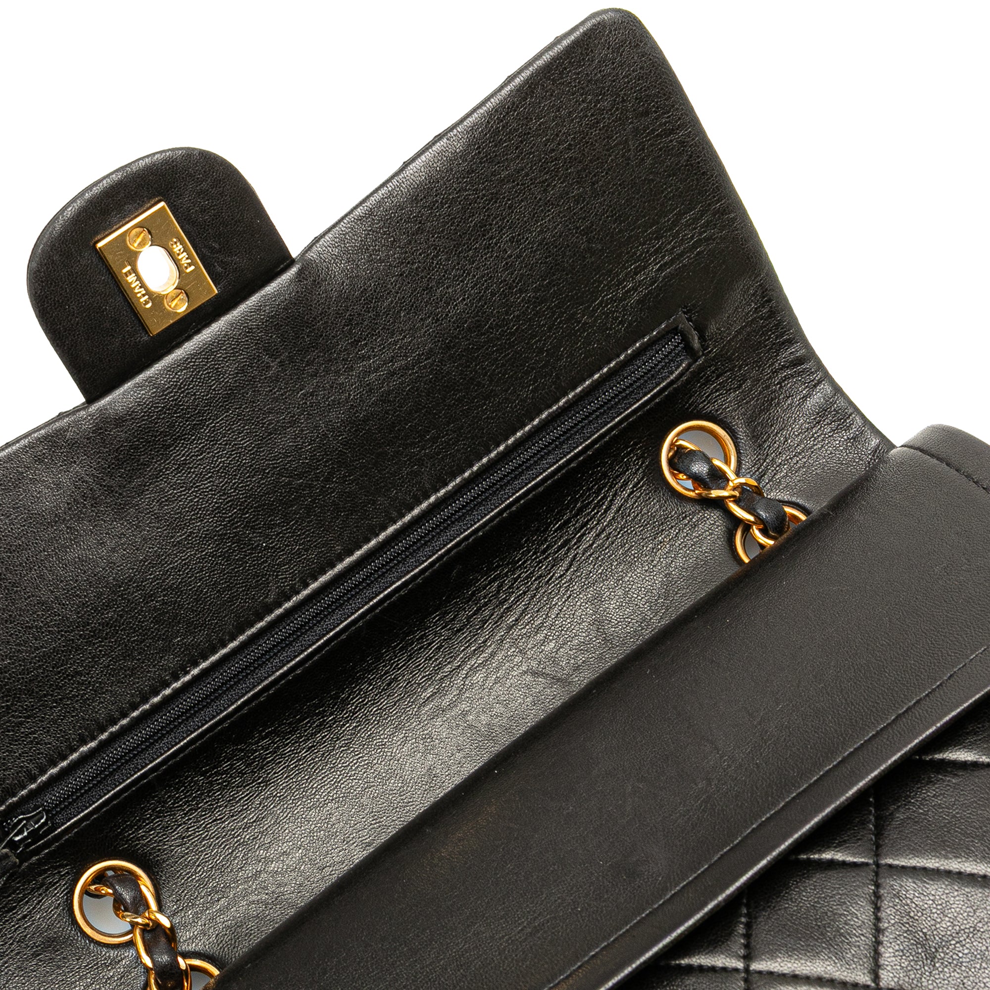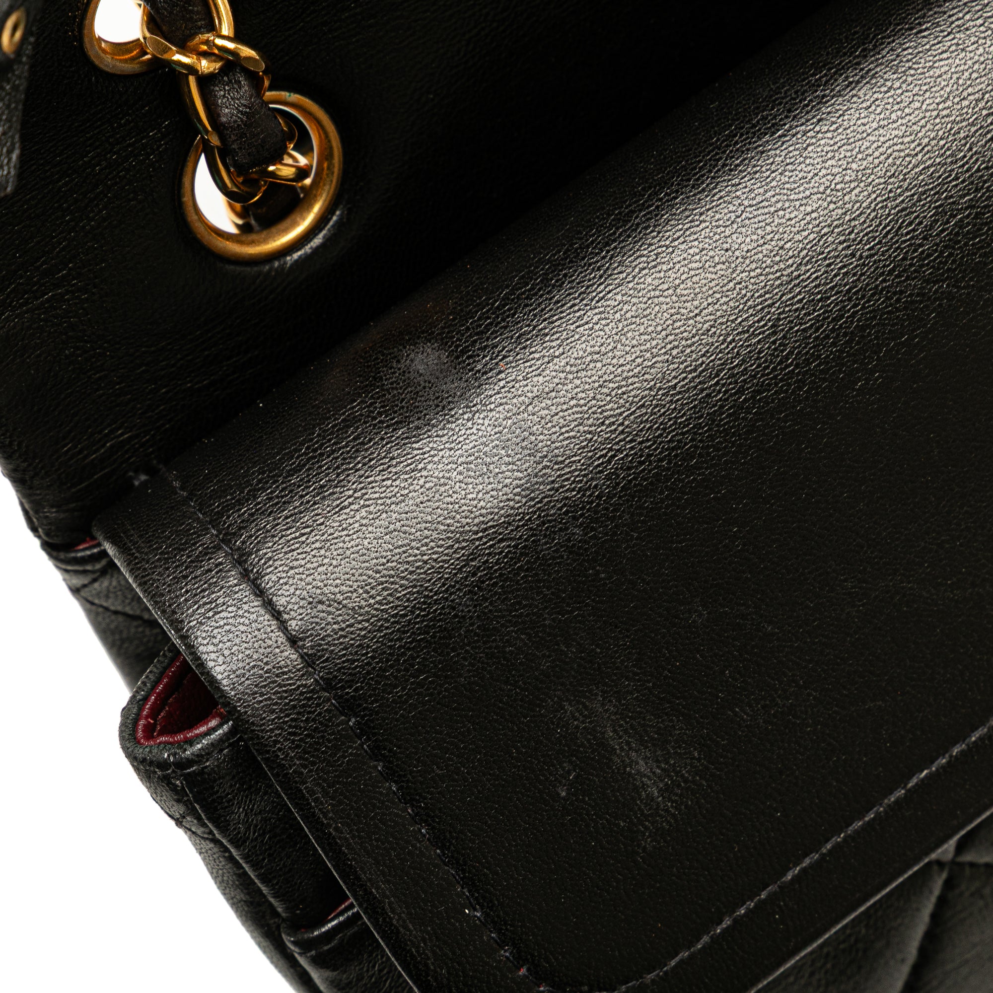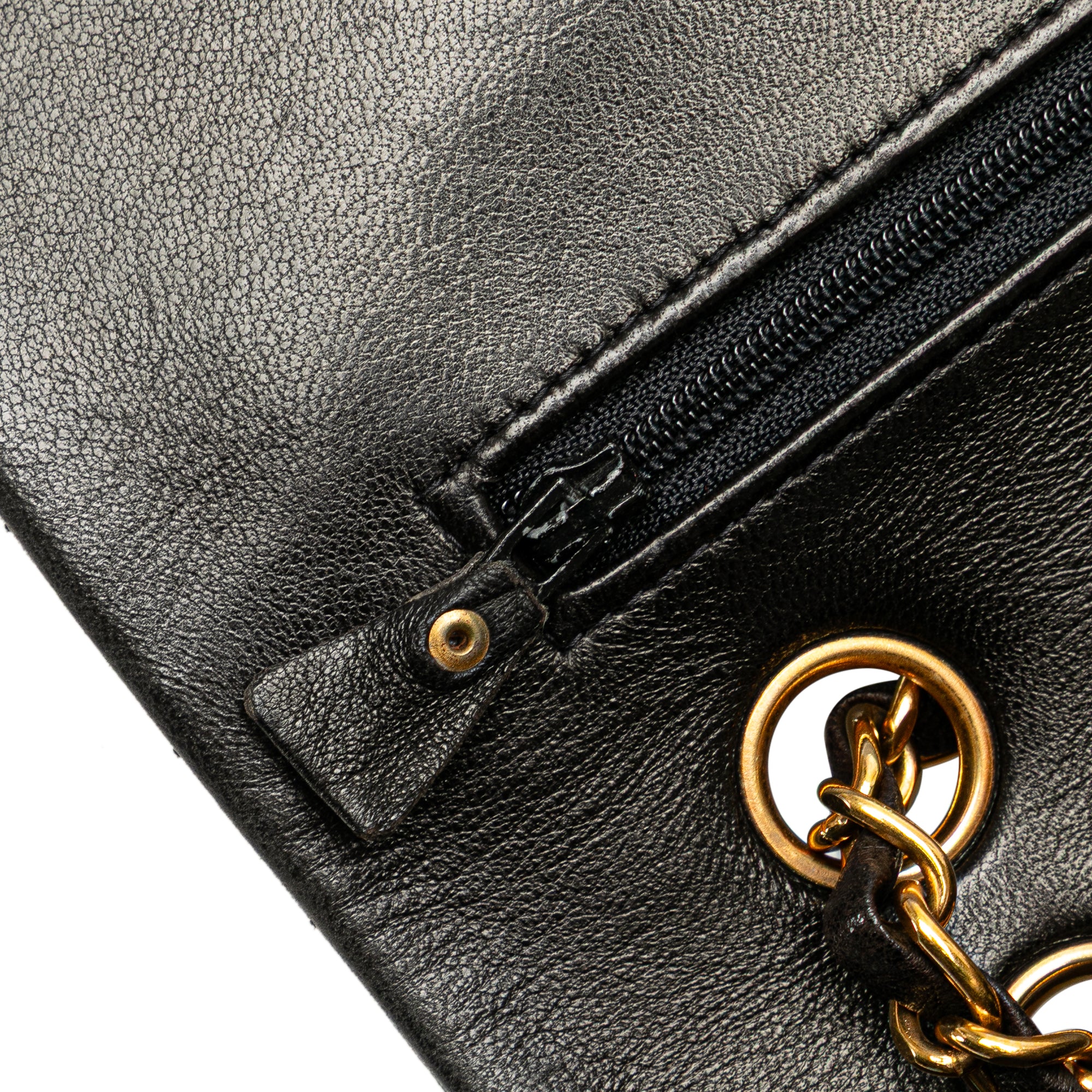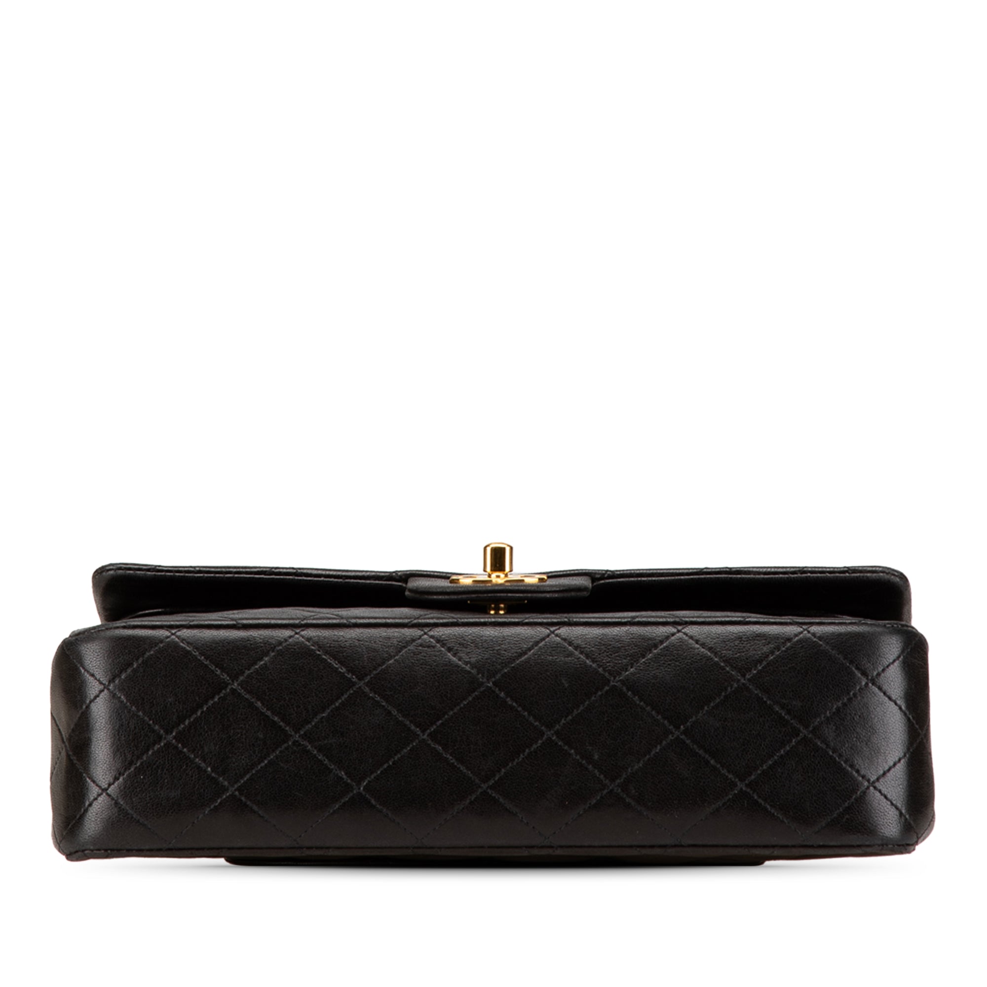 This shoulder bag features a quilted lambskin body, an exterior back slip pocket, leather woven chain straps, double front flaps with interlocking Cs and a twist lock closure, and interior zip and slip pockets. Retail Price: 10200.00