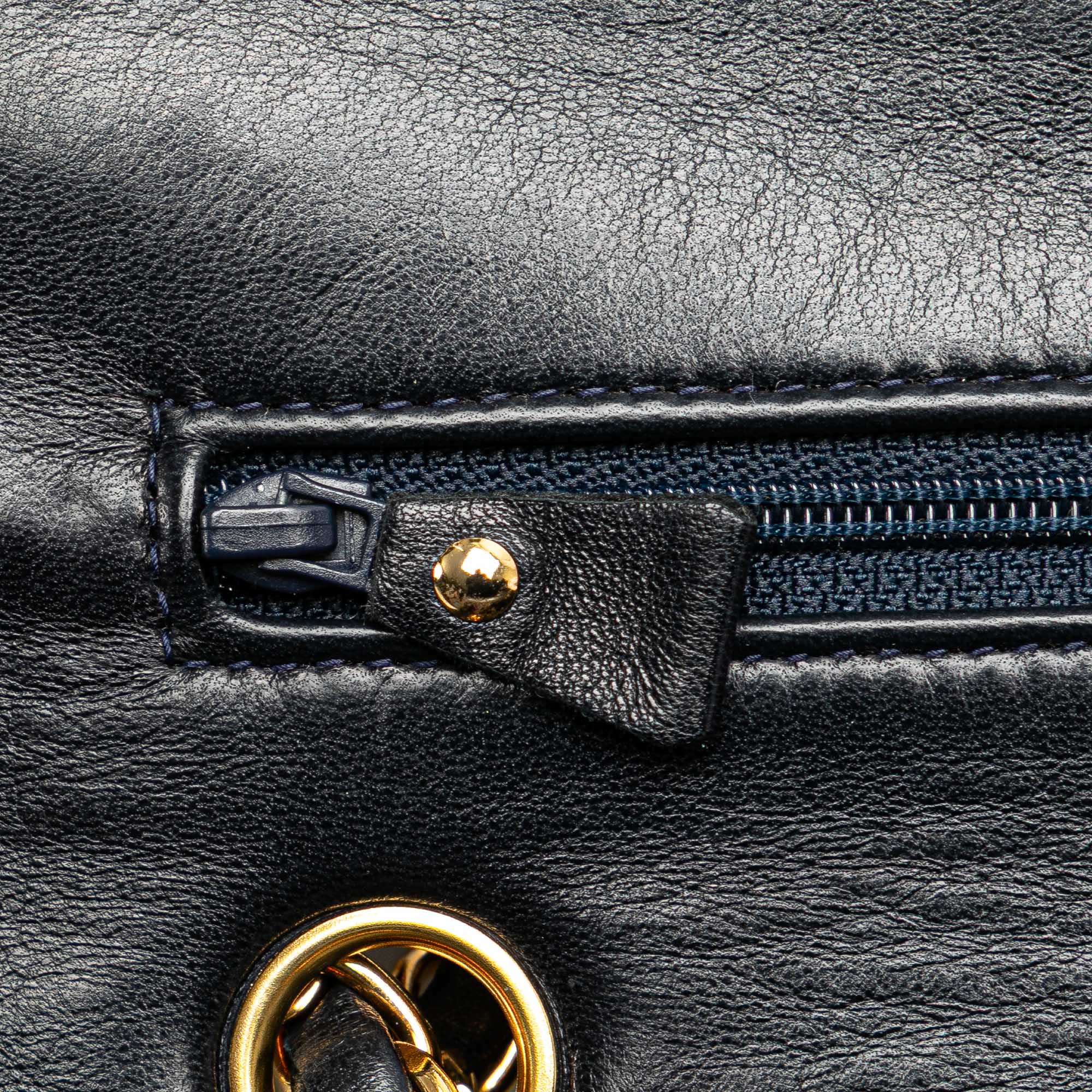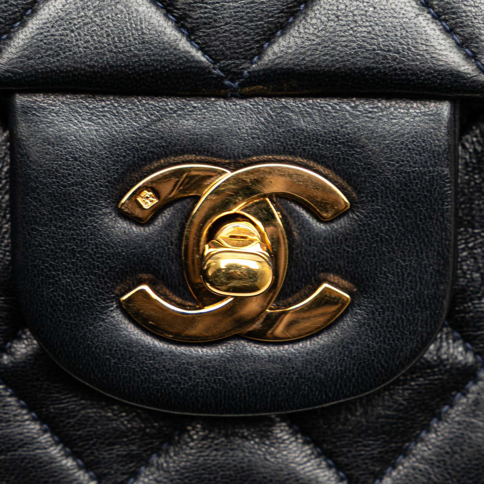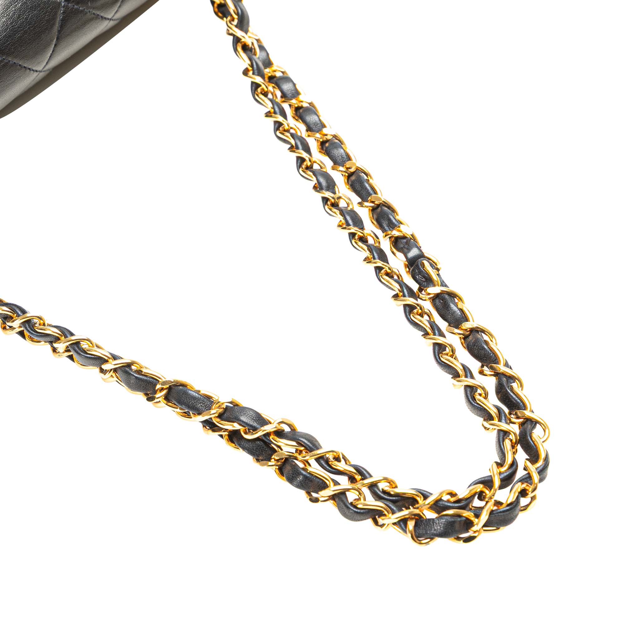 This shoulder bag features a quilted lambskin leather body, leather woven chain straps, double front flaps with interlocking Cs and a twist lock closure, an exterior back slip pocket, and interior zip and slip pockets. Inclusion: authenticity card. Retail Price: 10200.00