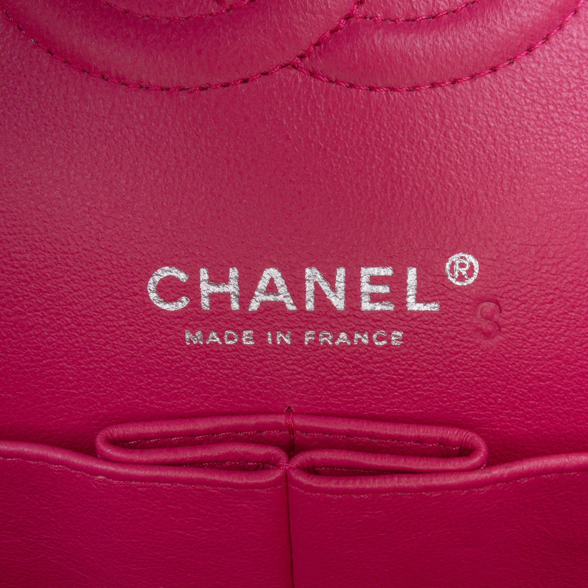 This shoulder bag features a quilted lambskin body, leather woven chain link straps, double front flaps with interlocking Cs and a twist lock closure, an exterior back slip pocket, and interior zip and slip pockets. Retail Price: 10450.00