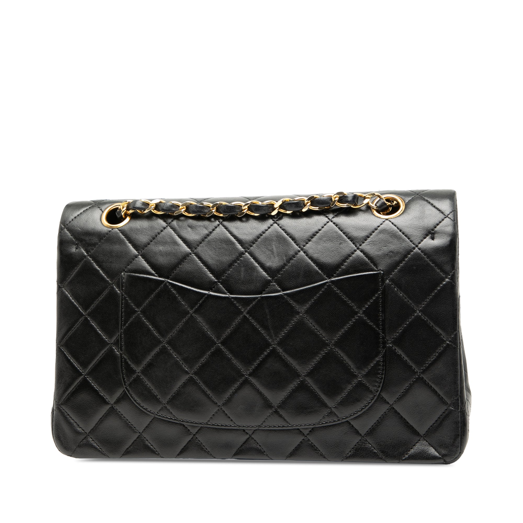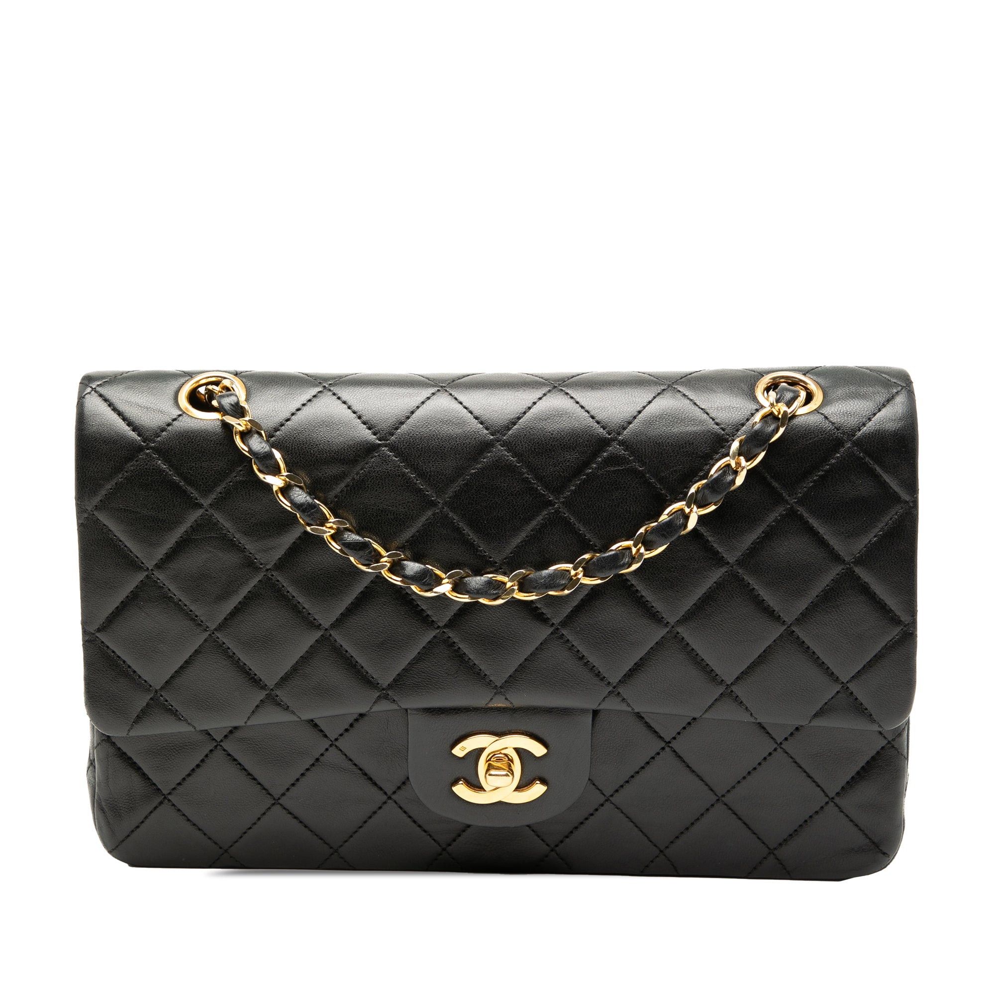 This shoulder bag features a quilted lambskin body, an exterior back slip pocket, leather woven chain straps, double front flaps with interlocking Cs and a twist lock closure, and interior zip and slip pockets. Retail Price: 10200.00