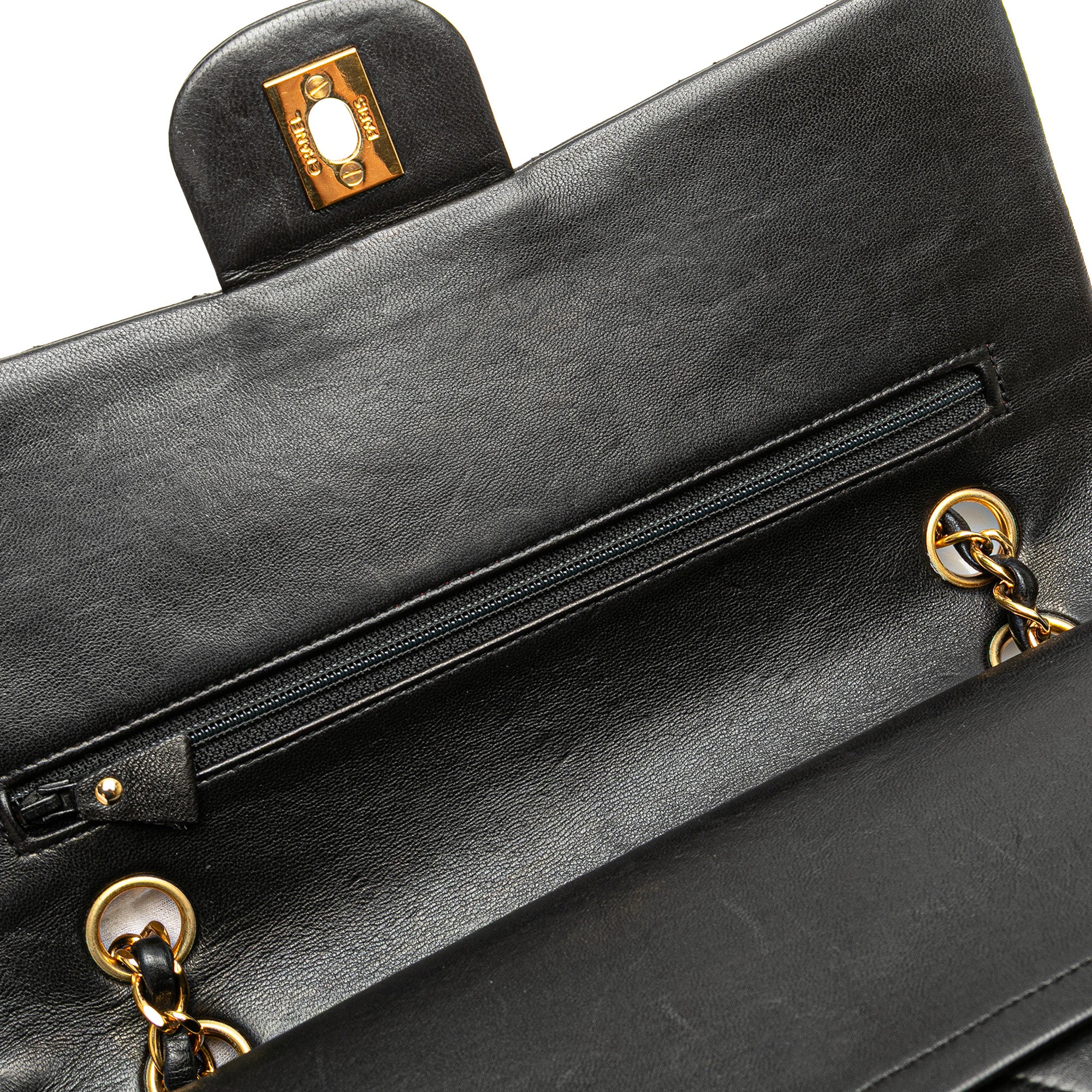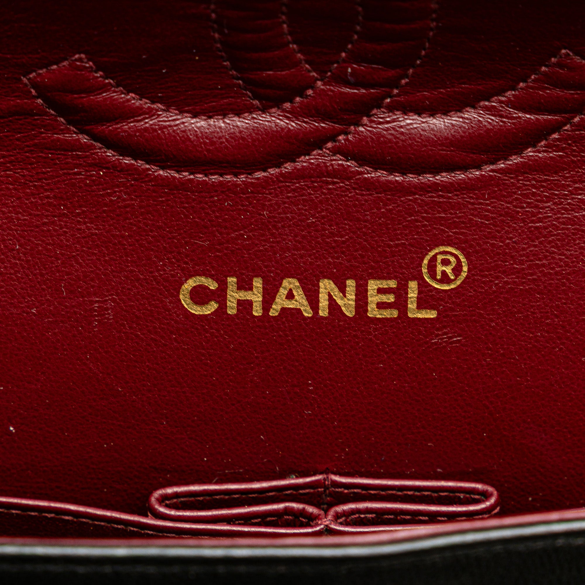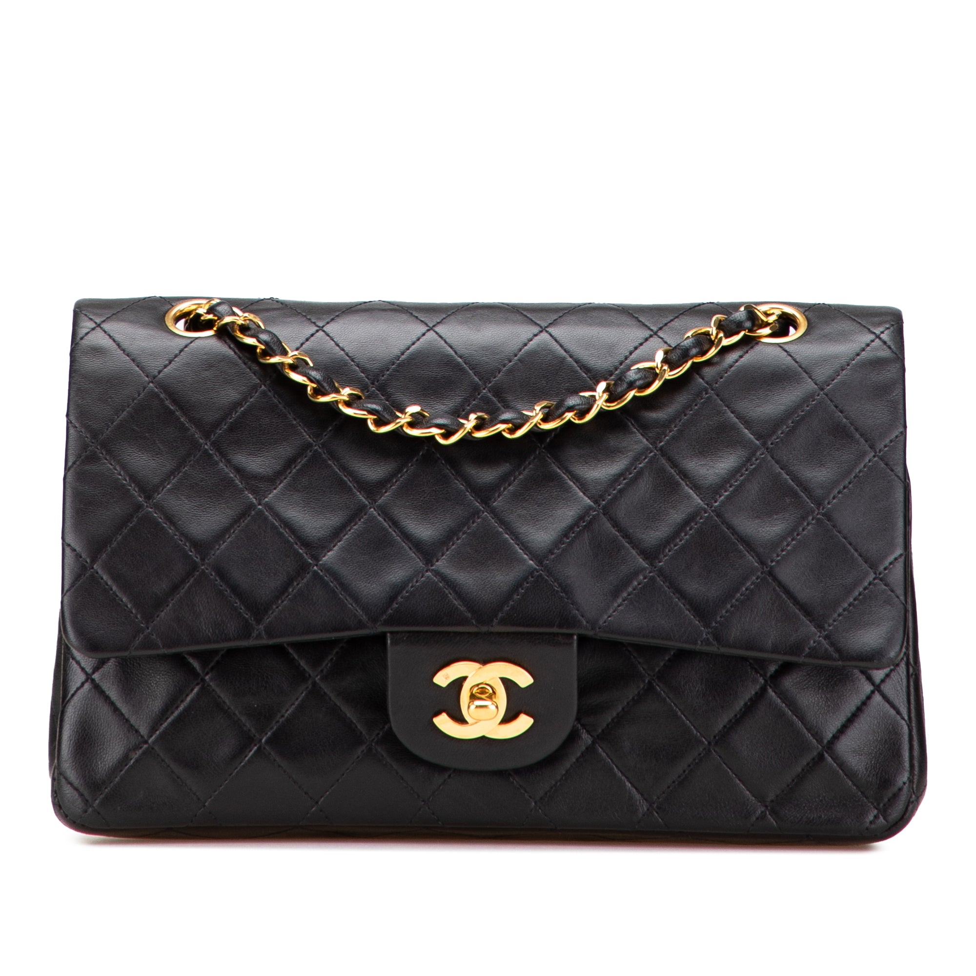 This shoulder bag features a quilted lambskin body, leather woven chain straps, double front flaps with interlocking Cs and a twist lock closure, an exterior back slip pocket, and interior zip and slip pockets. Retail Price: 10200.00
