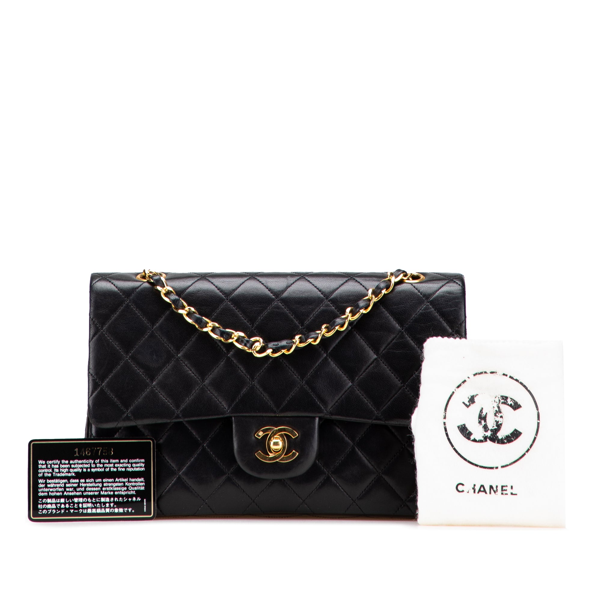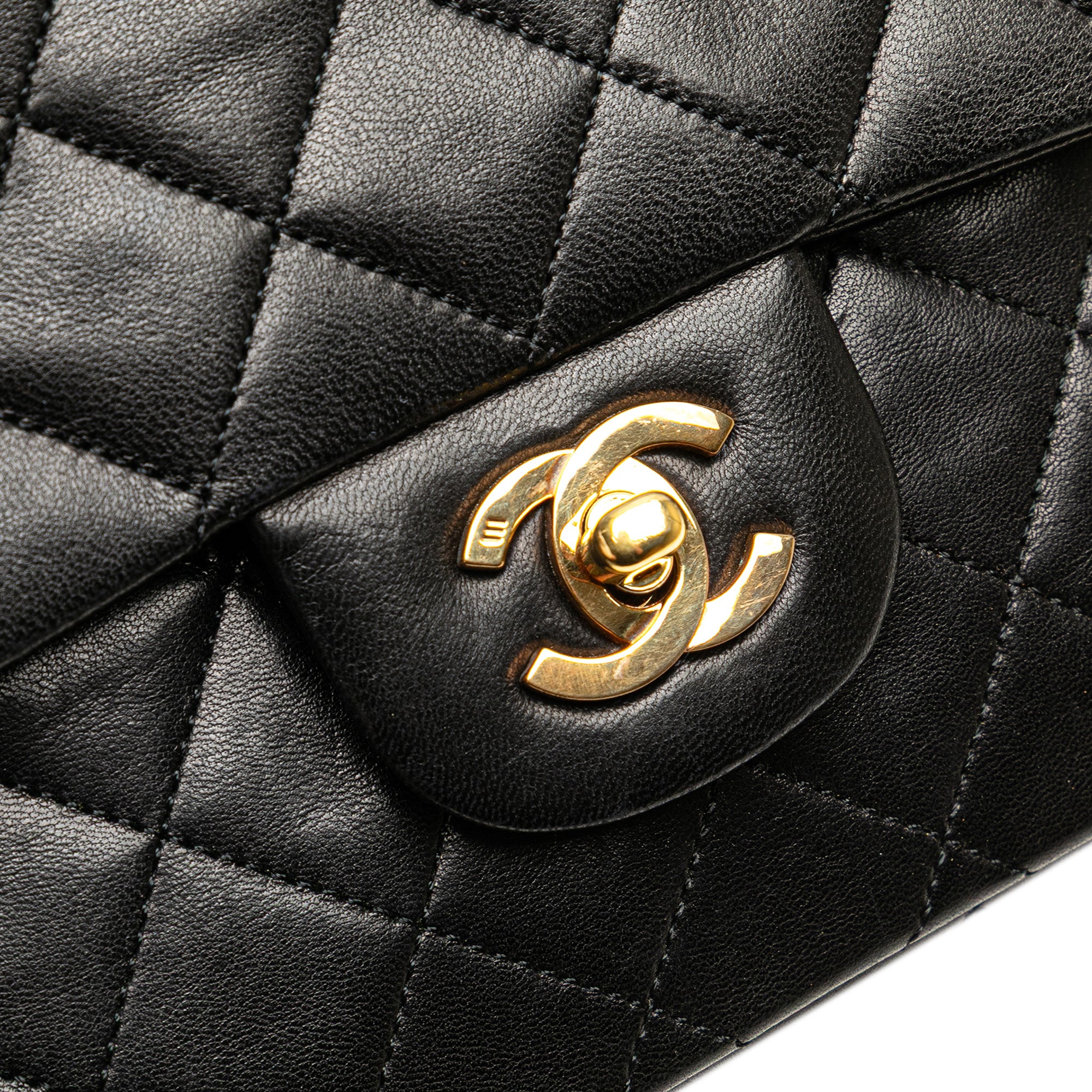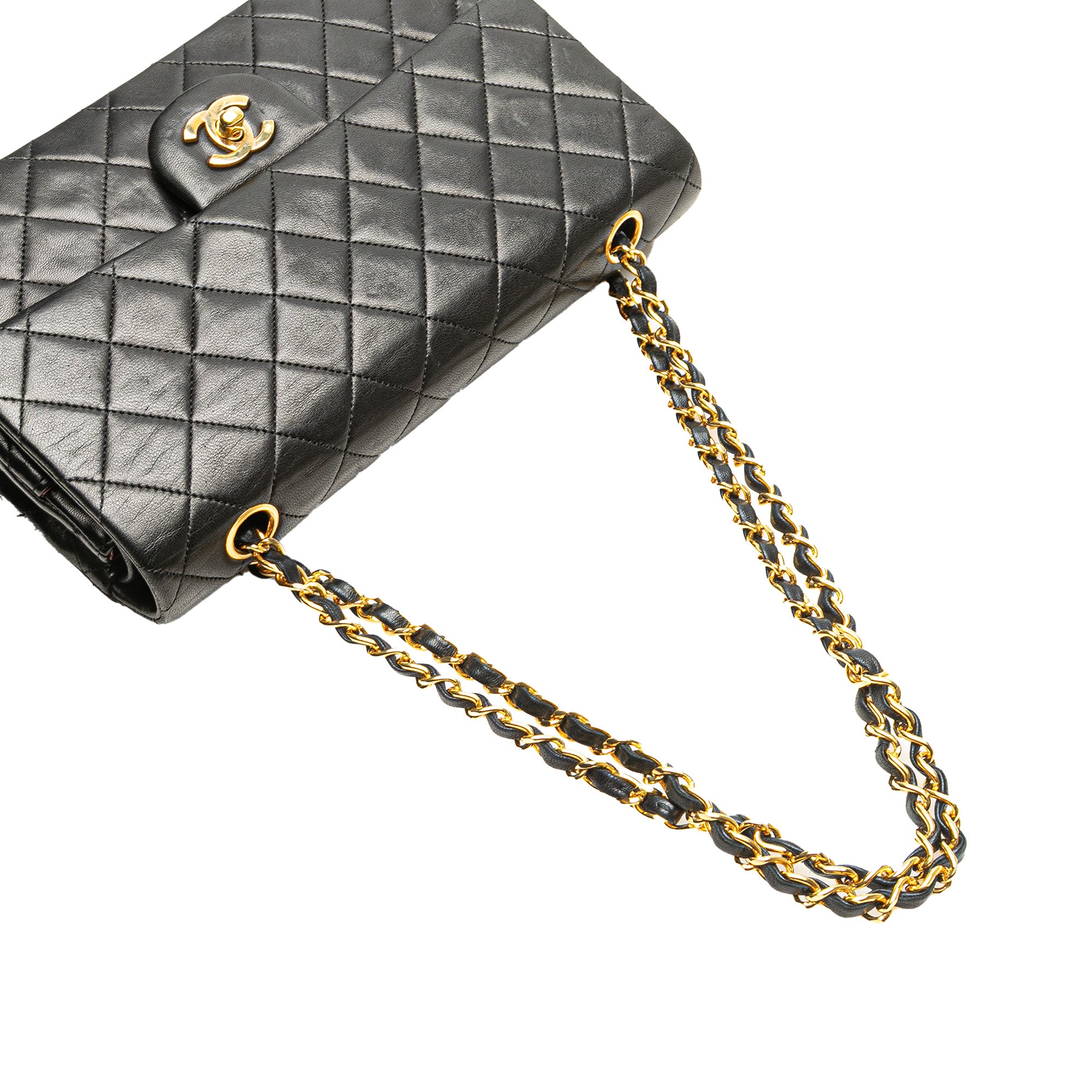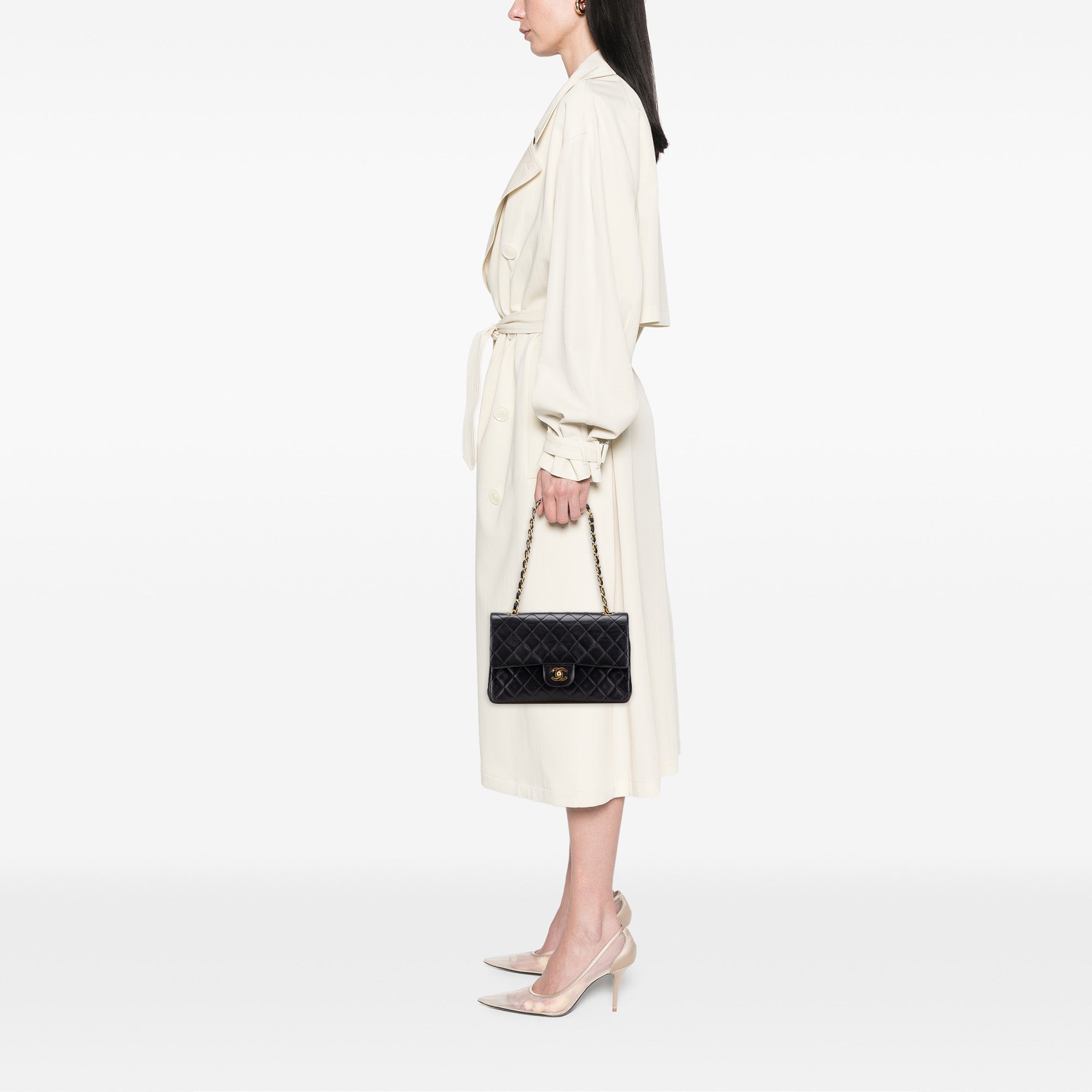 This shoulder bag features a quilted lambskin body, an exterior back slip pocket, leather woven chain straps, double front flaps with interlocking Cs and a twist lock closure, and interior zip and slip pockets. Inclusion: Dust bag, authenticity card. Retail Price: 10800.00