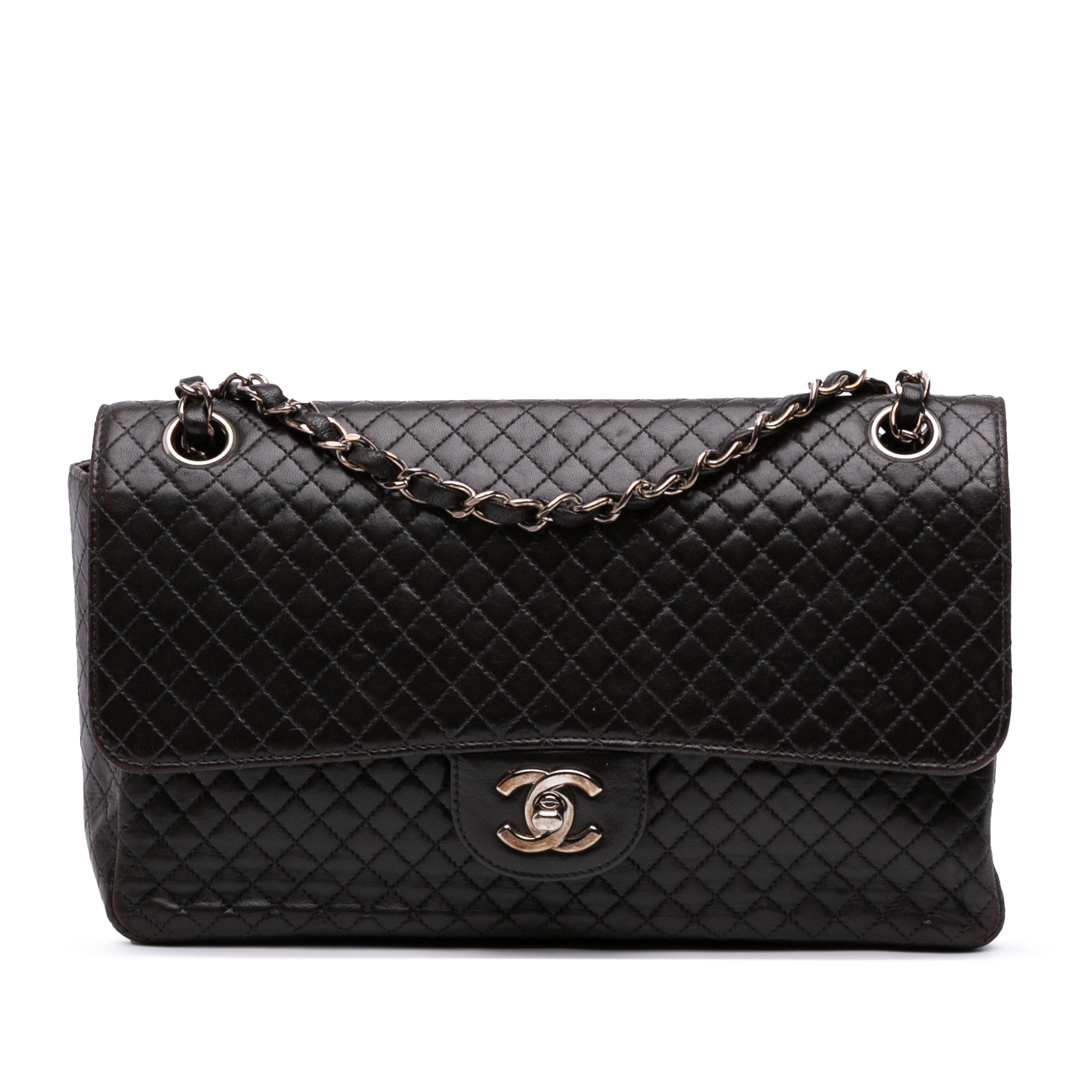This shoulder bag features micro quilted leather body, leather woven chain link straps, a front flap with CC turn lock closure, an exterior back slip pocket, and interior zip and slip pockets. Inclusion: authenticity card. Retail Price: 6125.00