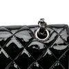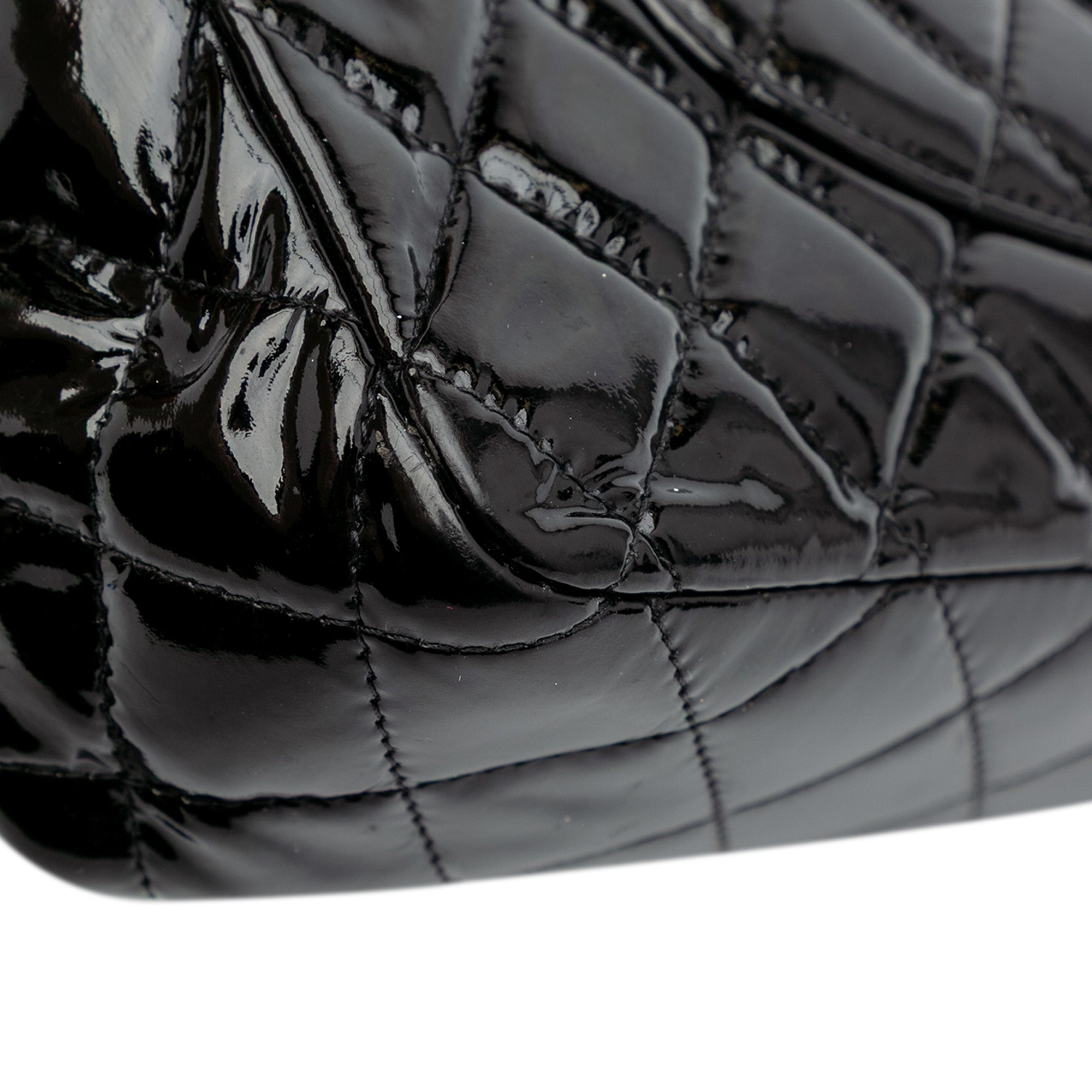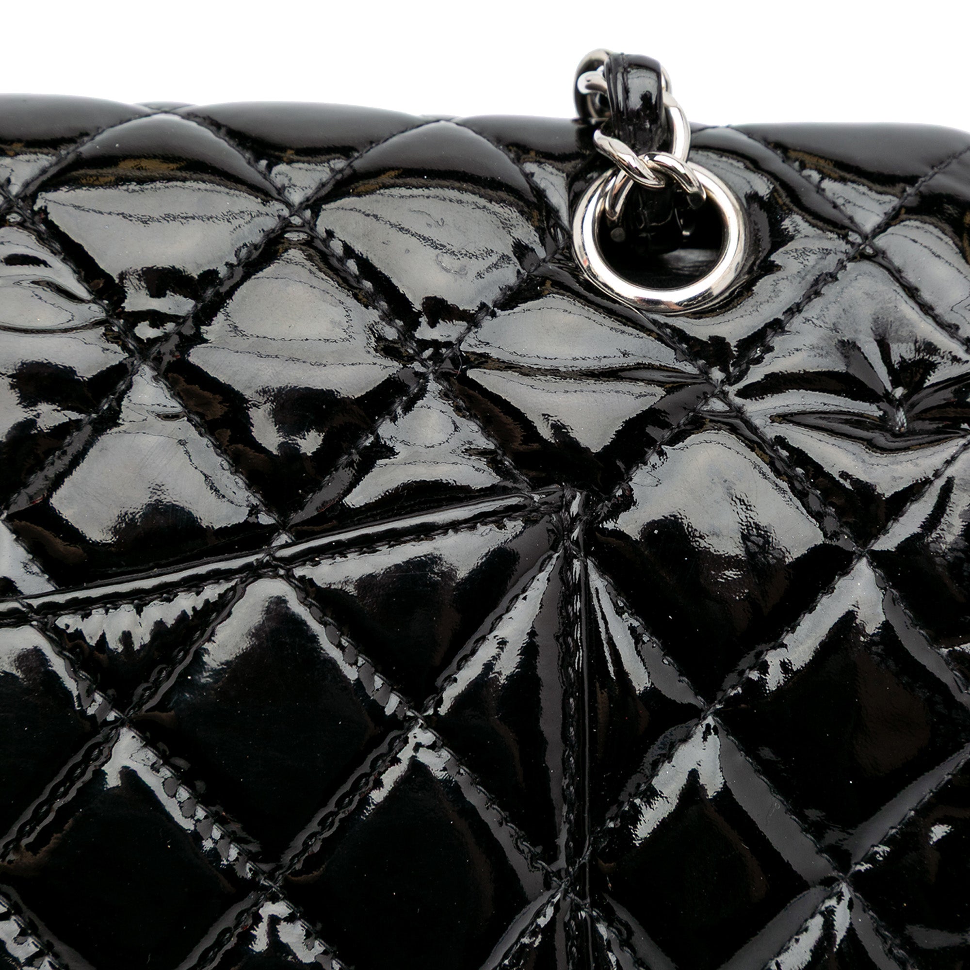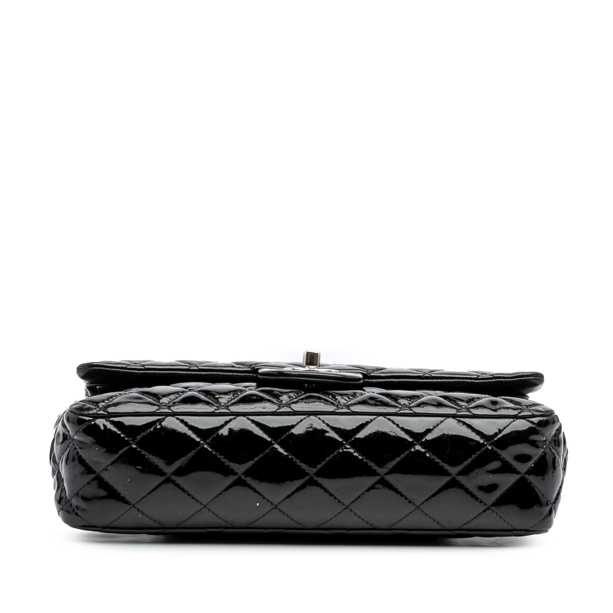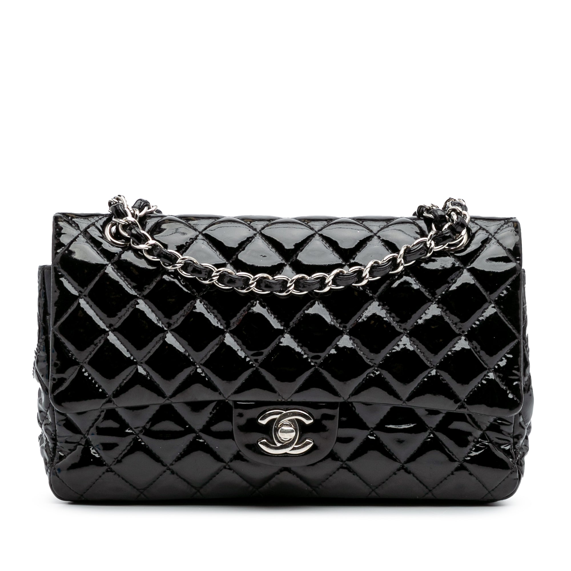 This shoulder bag features a quilted patent leather body, leather woven chain shoulder straps, double front flaps with CC turn-lock closure, an exterior back slip pocket, and interior zip and slip pockets. Retail Price: 10200.00