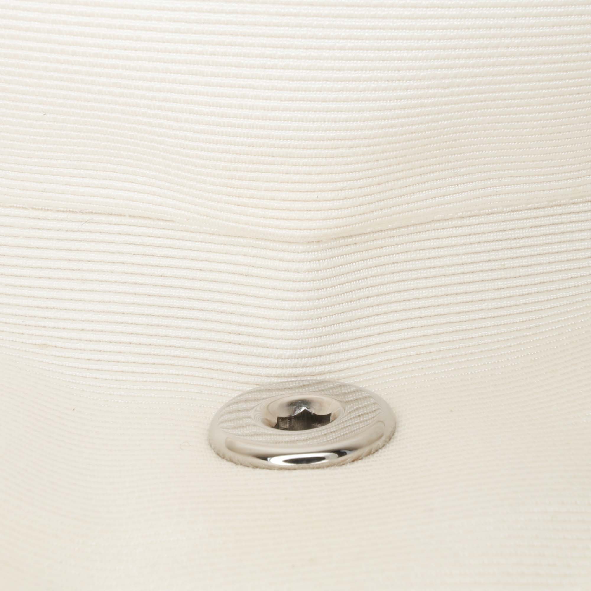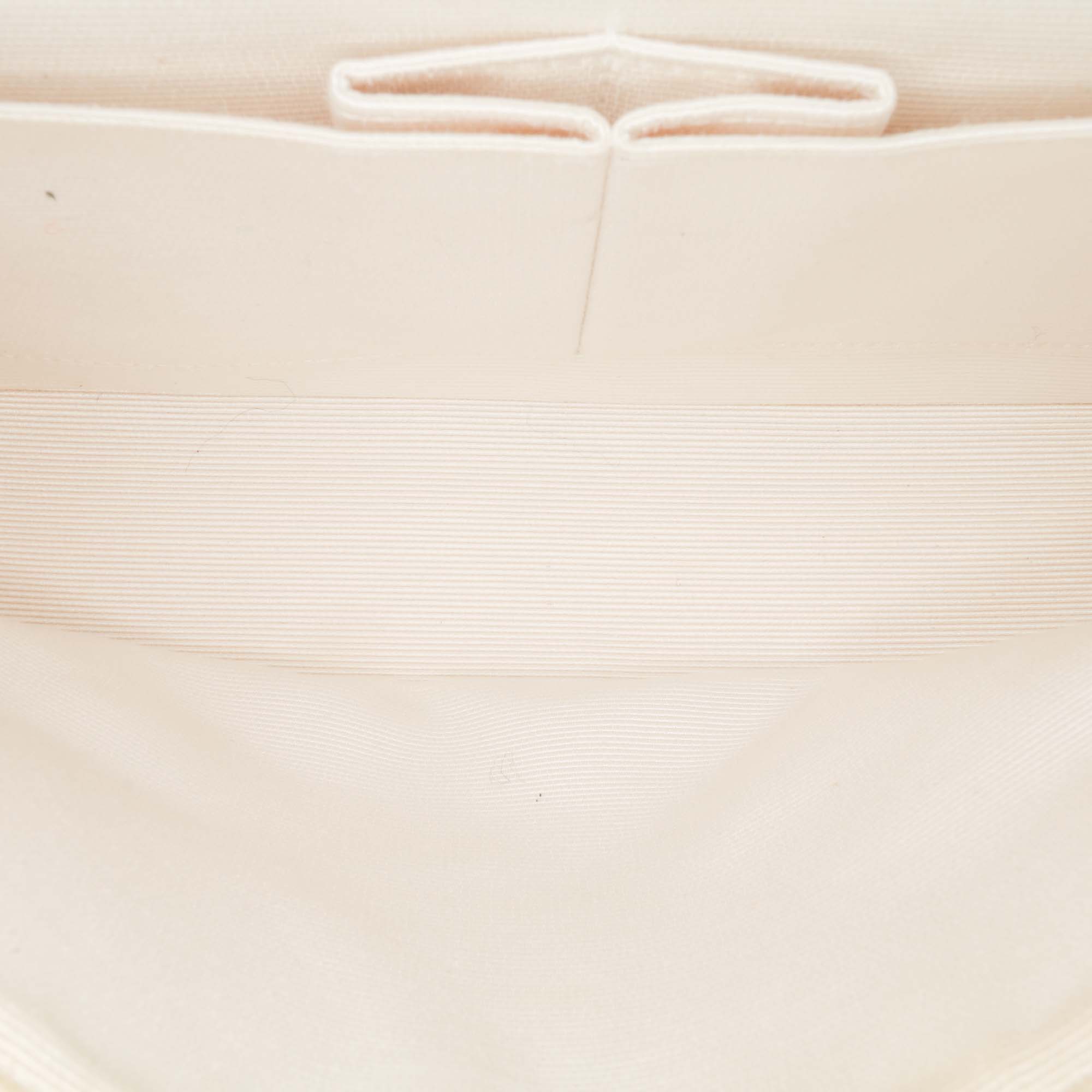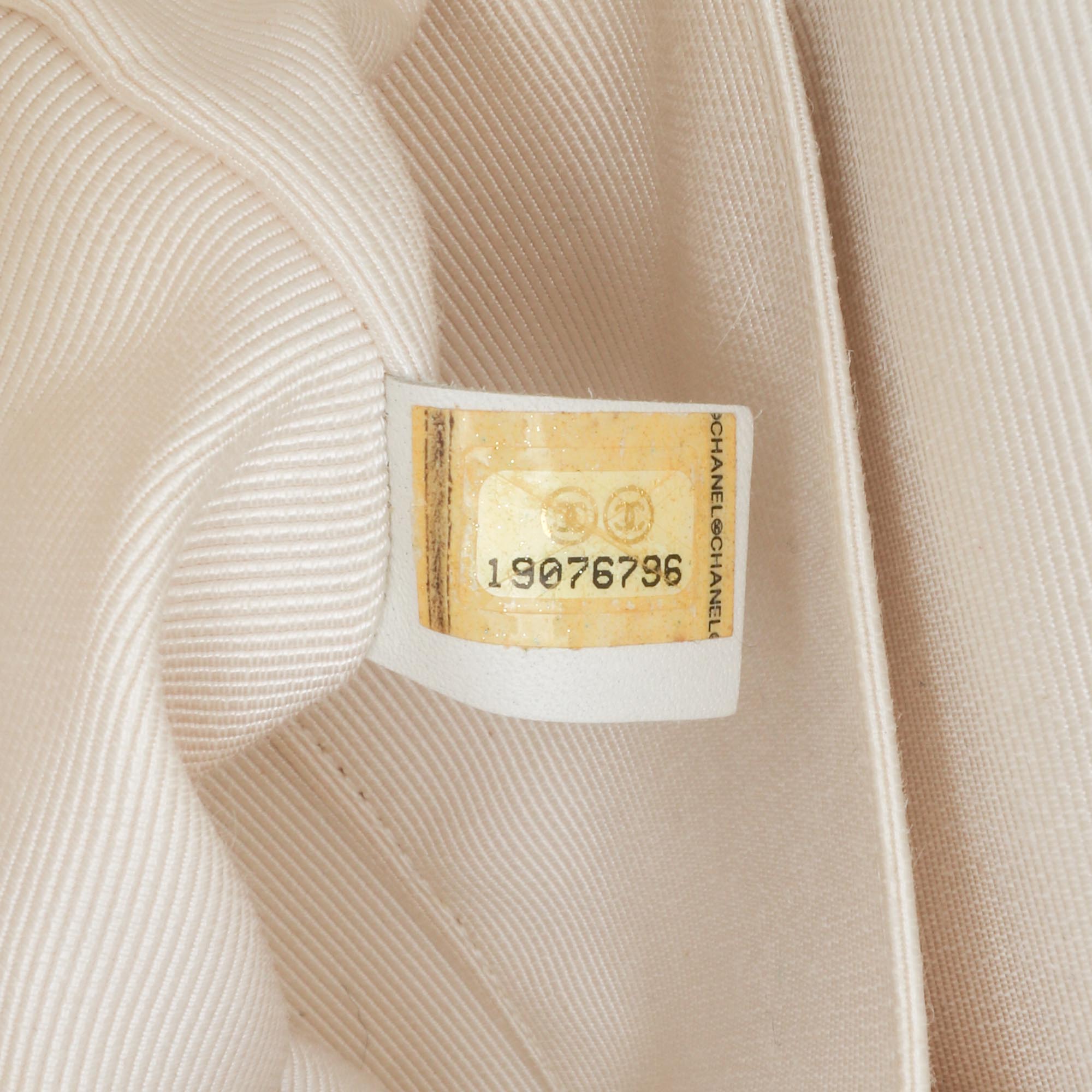 This shoulder bag features a quilted nylon fabric body, fabric woven chain link straps, double front flaps with a CC turn lock closure, an exterior back slip pocket, and interior zip and slip pockets. Retail Price: 4200.00