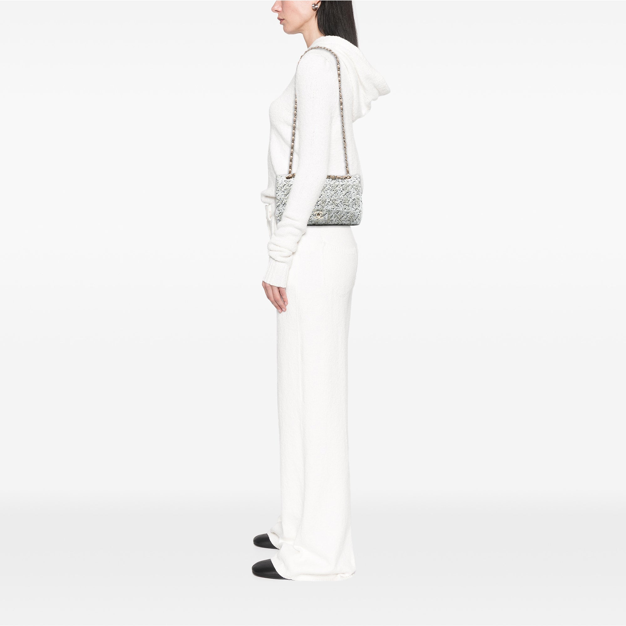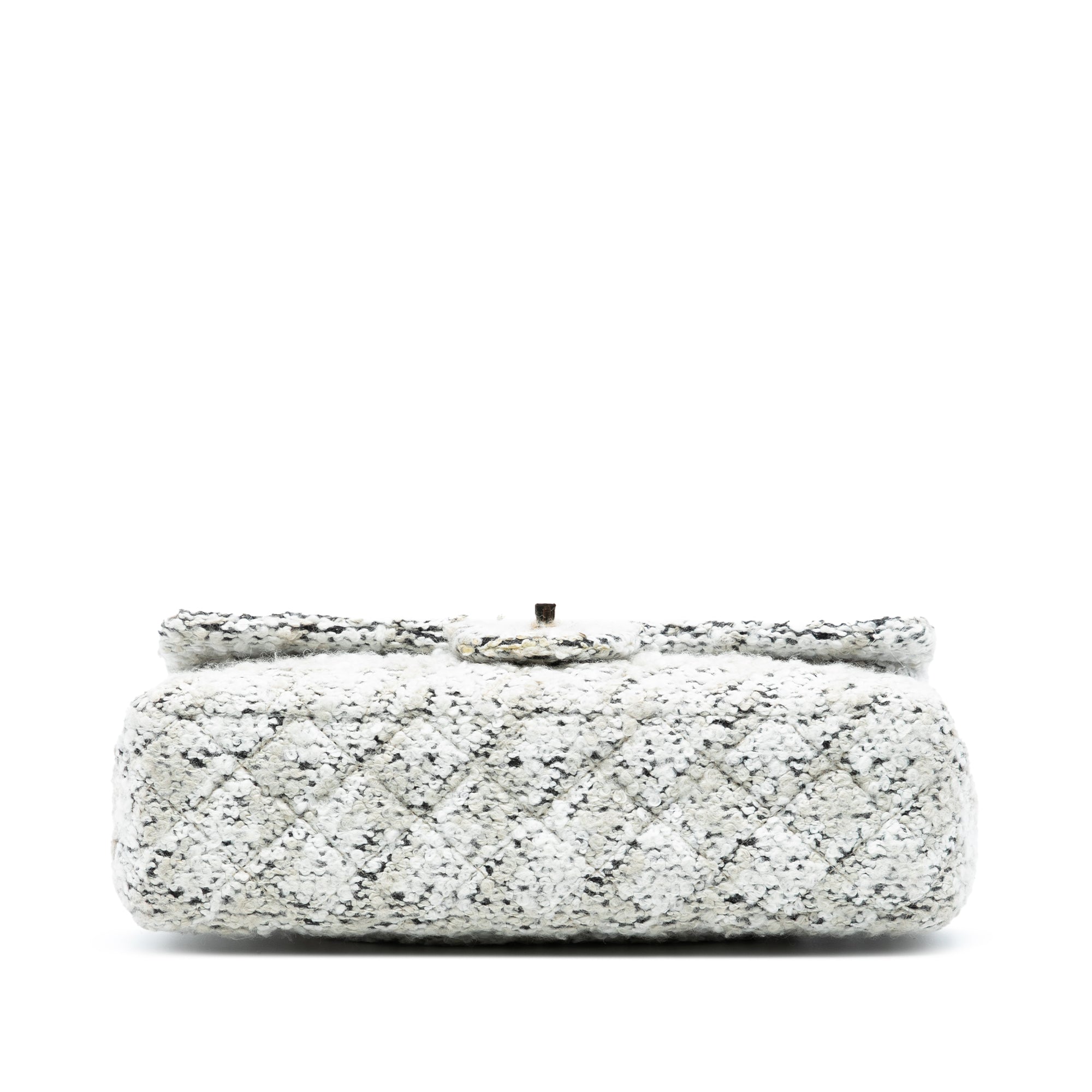 This shoulder bag features a quilted tweed body, leather woven chain-link shoulder straps, front flaps with interlocking Cs and a twist-lock closure, an exterior back slip pocket, and interior zip and slip pockets. Retail Price: 6400.00