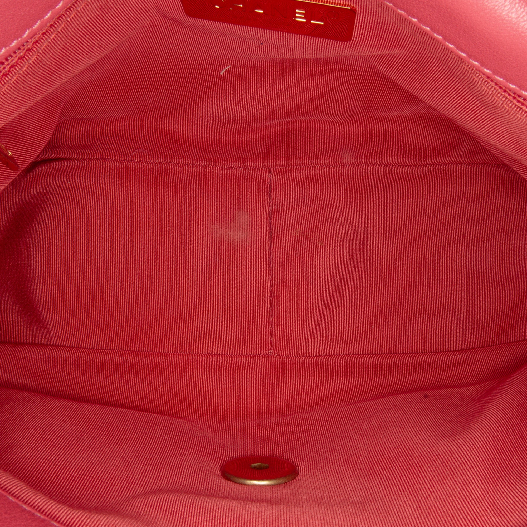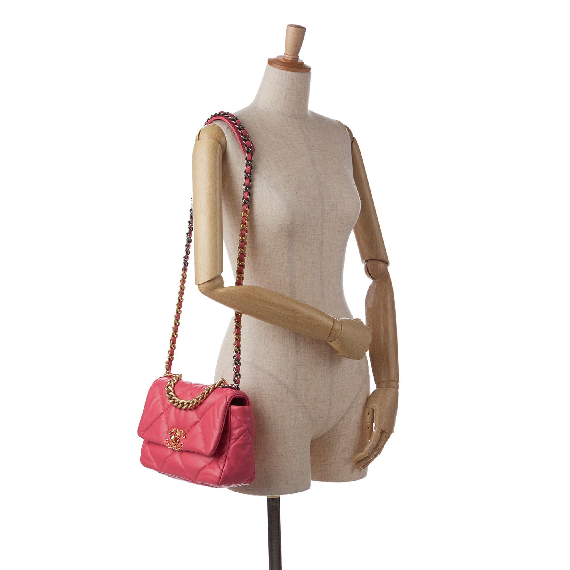 The Medium 19 Flap bag features a quilted lambskin leather body, a chain handle, a leather woven chain shoulder strap, a flap with a CC twist lock closure, an exterior slip pocket, and an interior zip pocket. Inclusion: Dust bag, authenticity card. Retail Price: 6400.00
