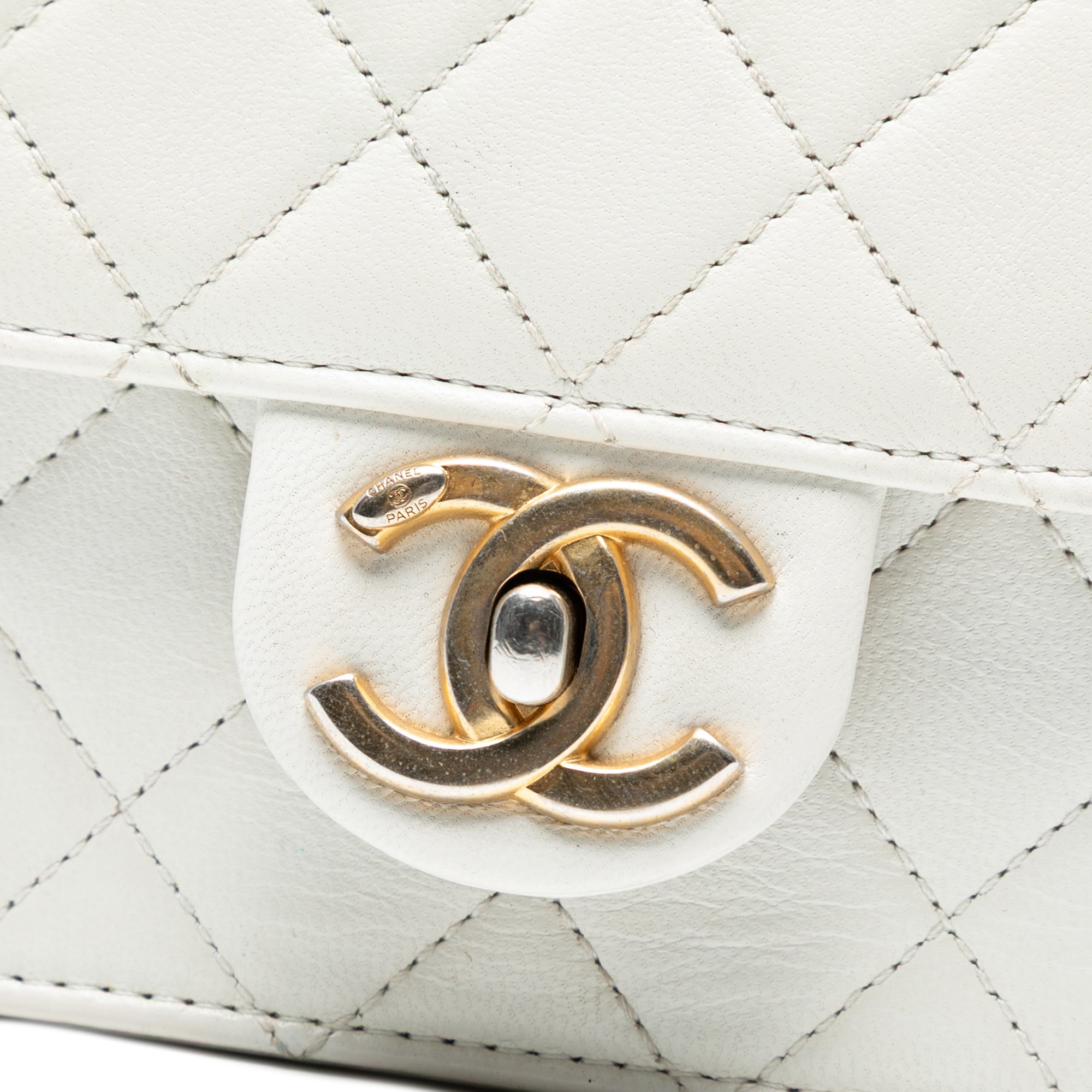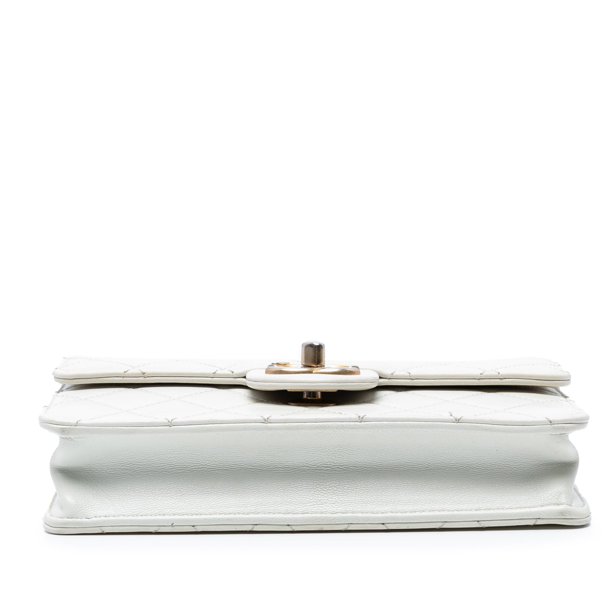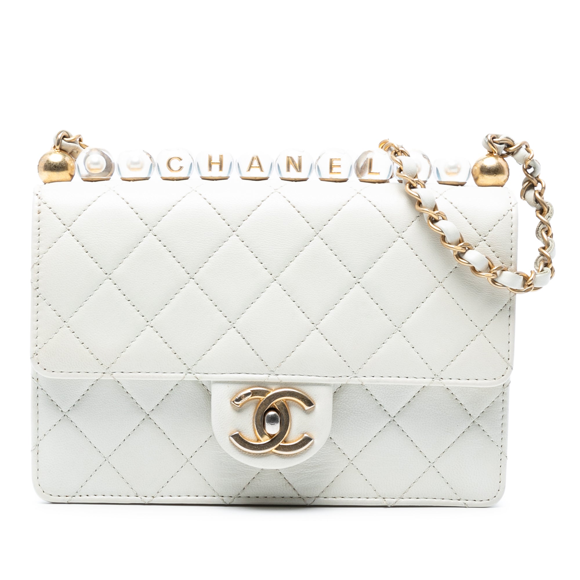 This crossbody bag features a quilted leather body with faux pearl details, a leather woven chain strap, a front flap with a CC turn-lock closure, and interior zip and slip pockets. Retail Price: 4200.00