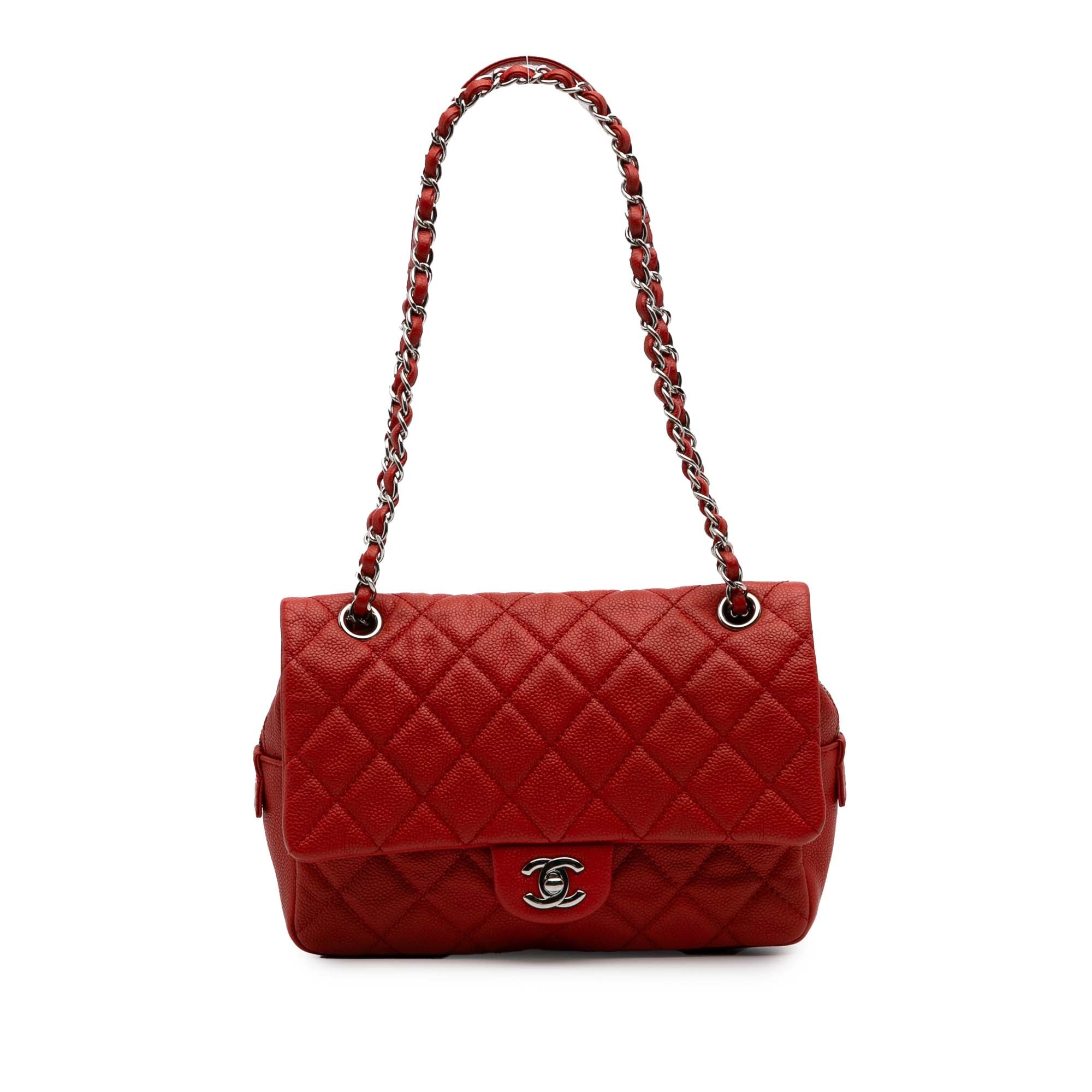 The Easy Flap features a quilted caviar leather body, a leather woven chain shoulder strap with leather shoulder guard, a front flap with double Cs and twist lock closure, a top zip closure, and an interior zip pocket. Inclusion: authenticity card. Retail Price: 4925.00