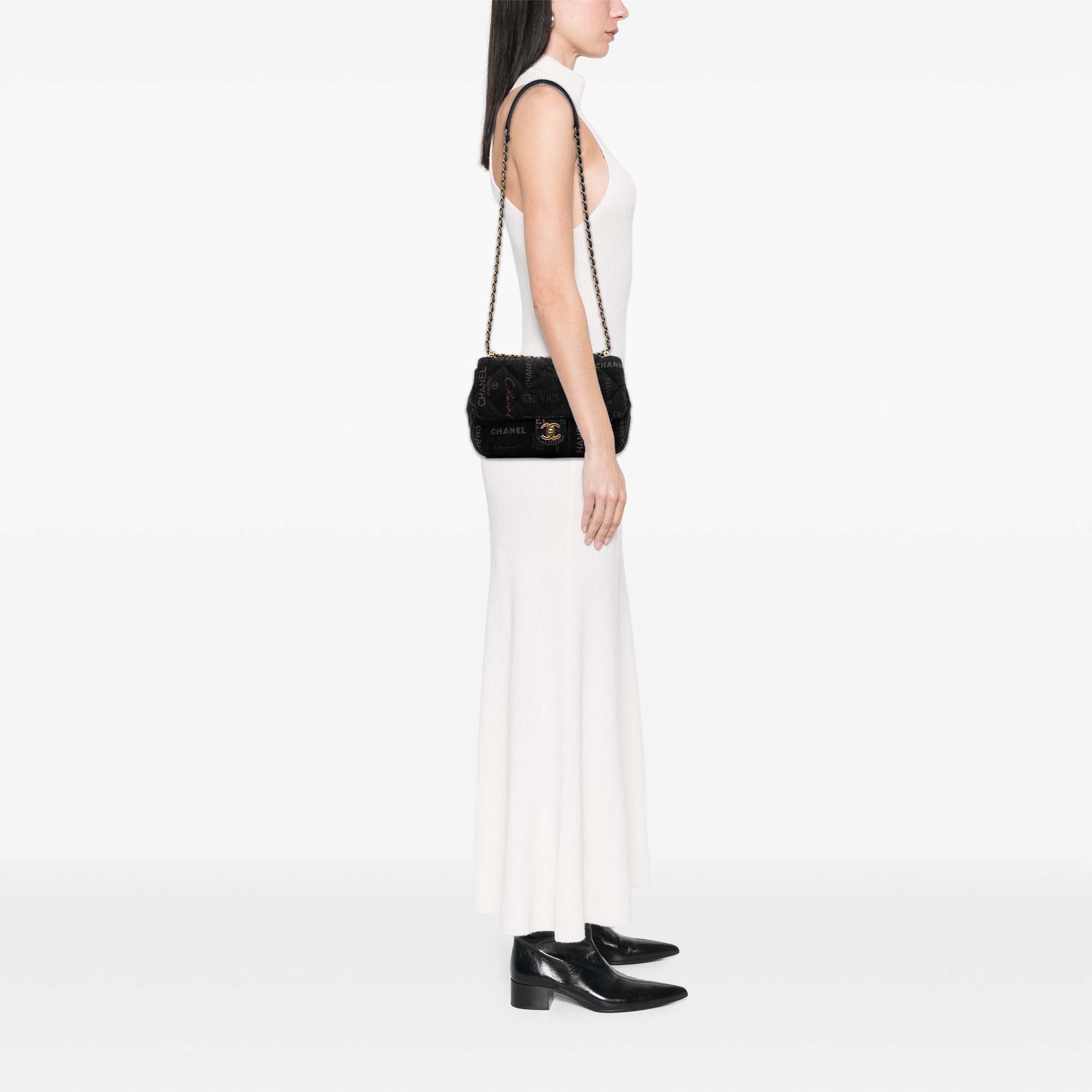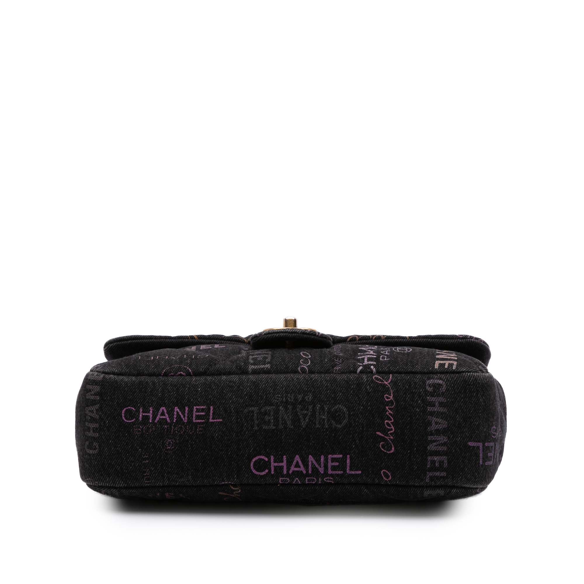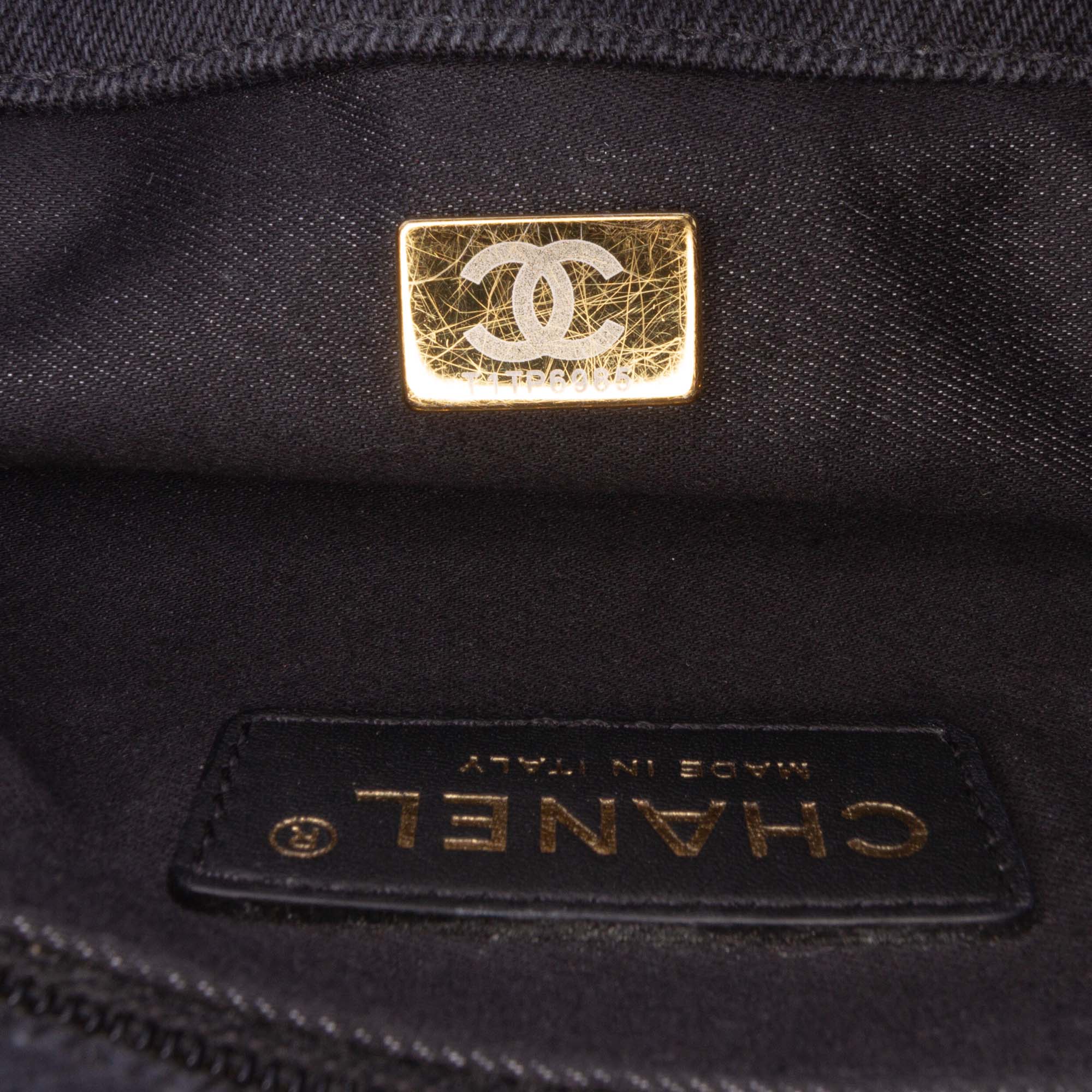 This crossbody bag features a quilted denim body, denim woven chain strap with denim shoulder guard, a front flap with twist lock closure, an exterior back slip pocket, and an interior zip pocket. Retail Price: 6000.00
