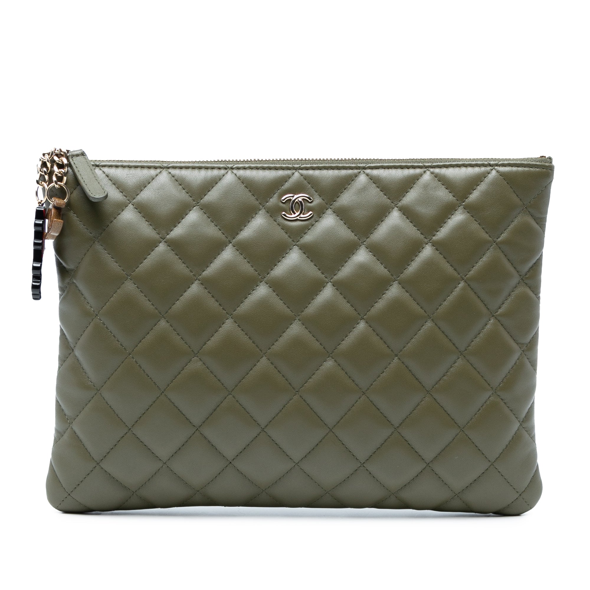 This clutch bag features a quilted lambskin leather body, a top zip closure, an exterior slip pocket, and an interior zip pocket. Inclusion: Dust bag, box. Retail Price: 1100.00
