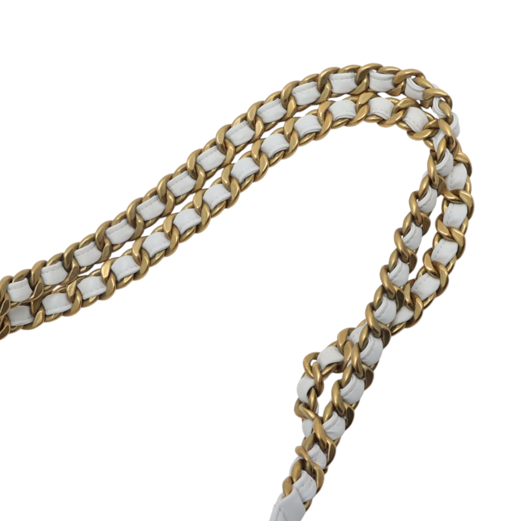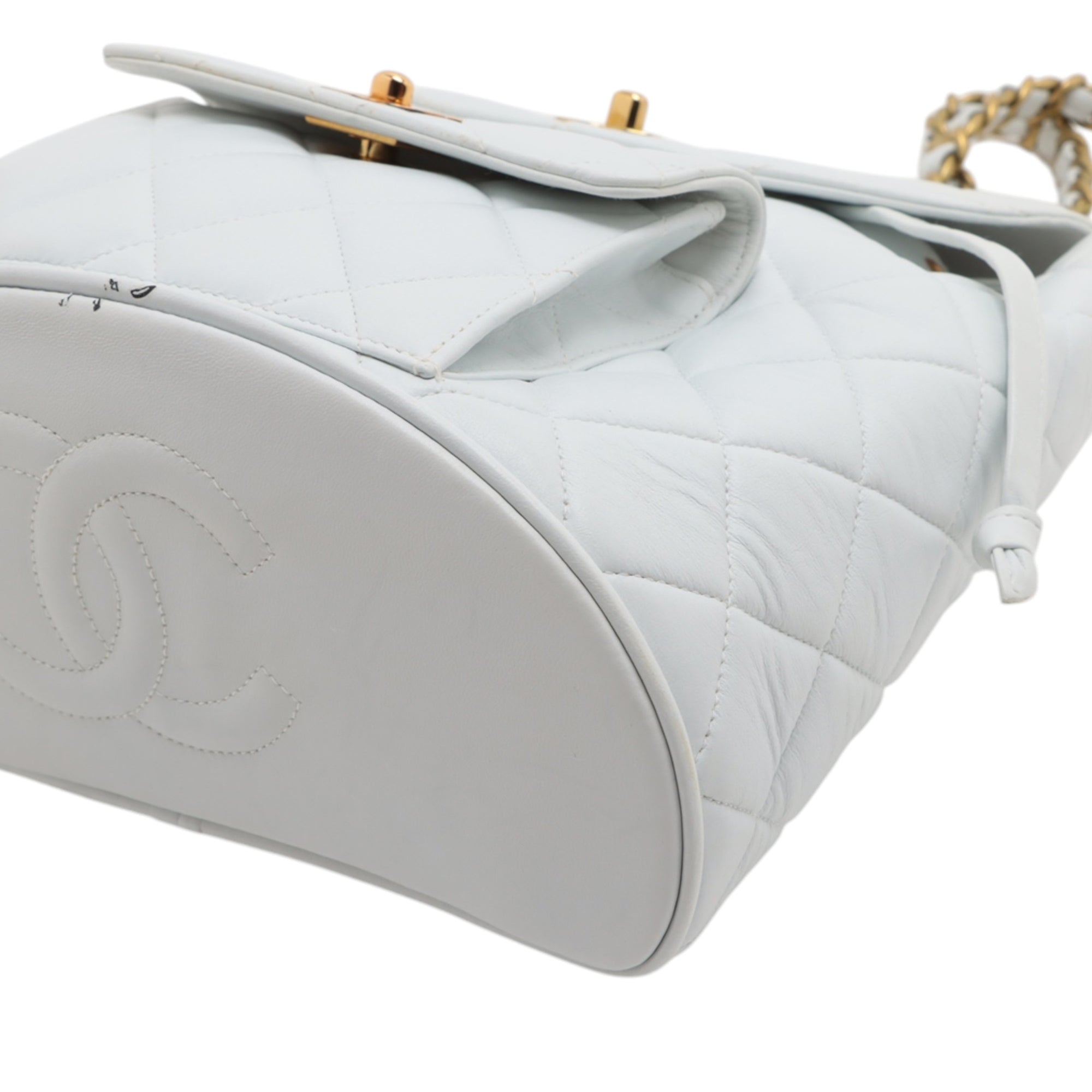 This backpack features a lambskin leather body, adjustable leather woven chain link back straps, a top flap with CC turnlock and drawstring closure, and an exterior front flap pocket. Inclusion: Dust bag, box, authenticity card. Retail Price: 5950.00