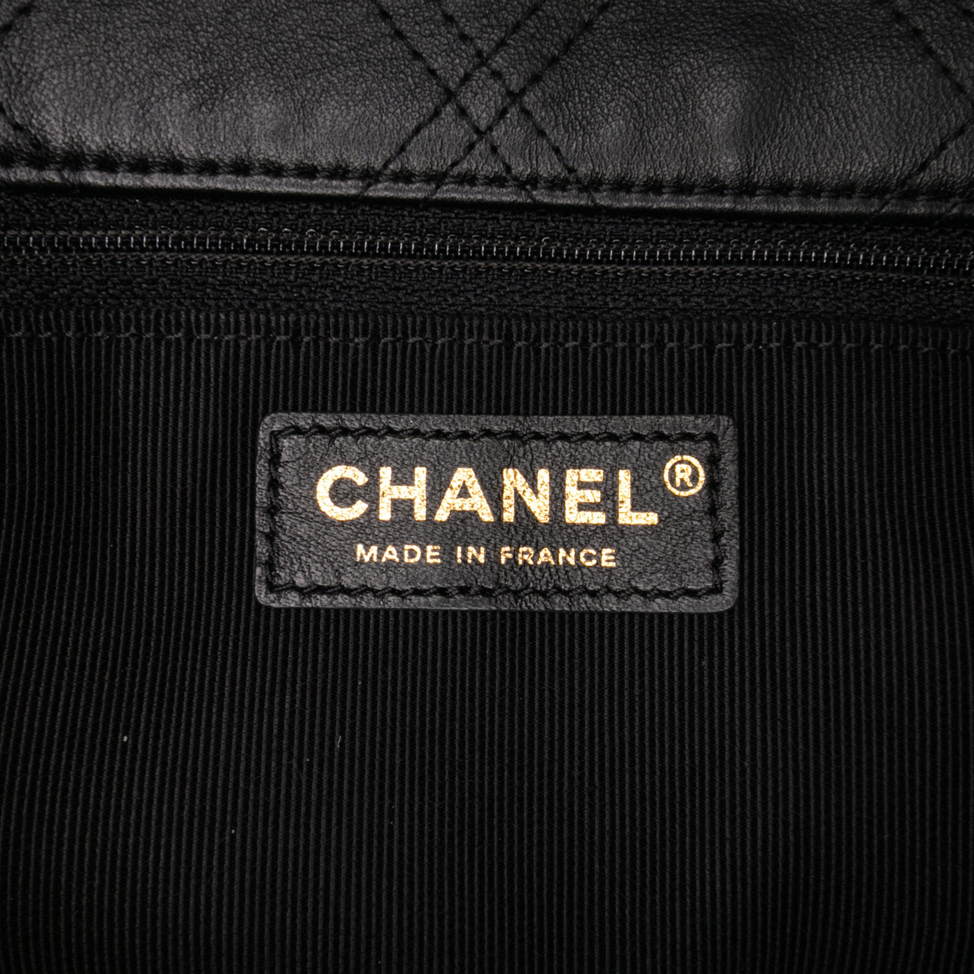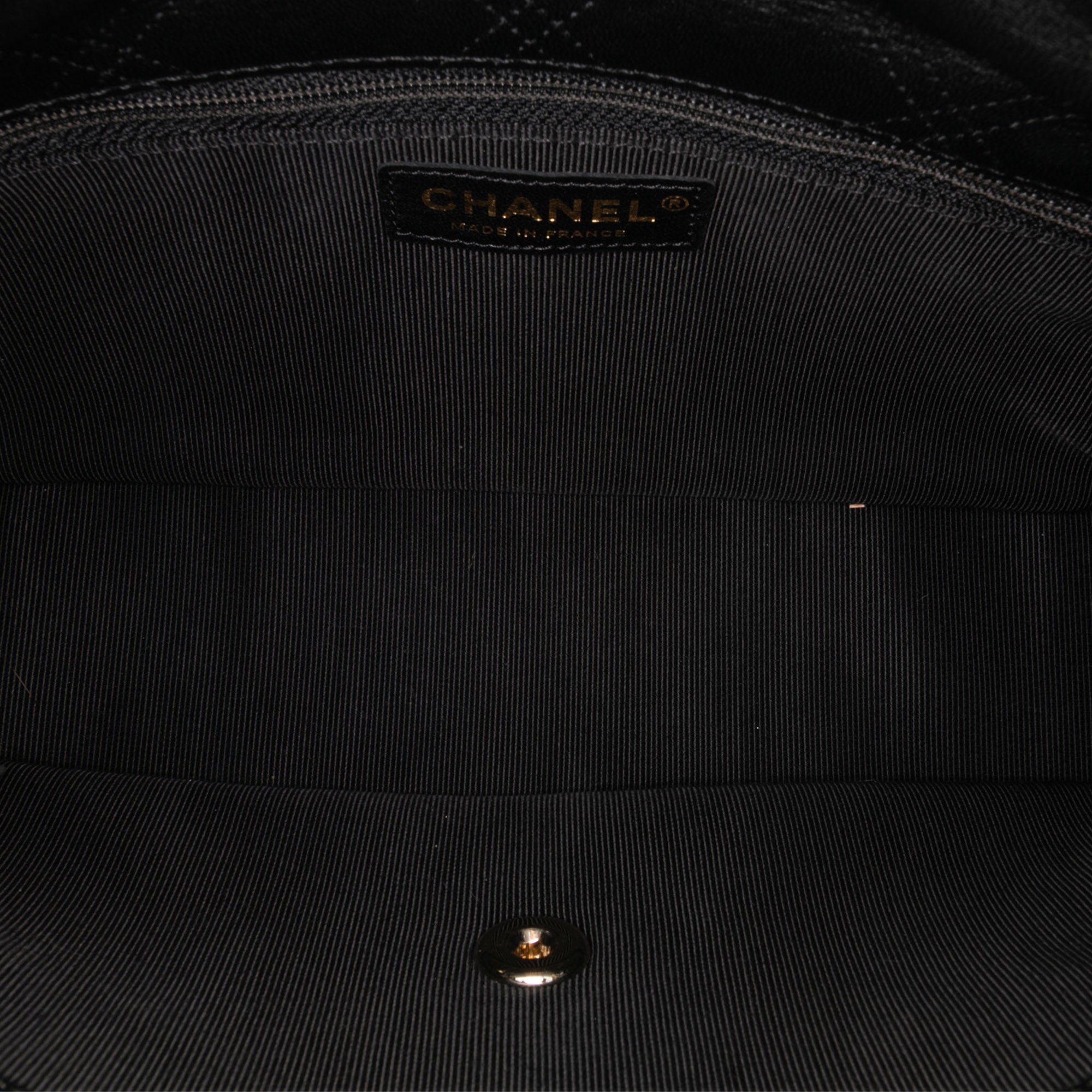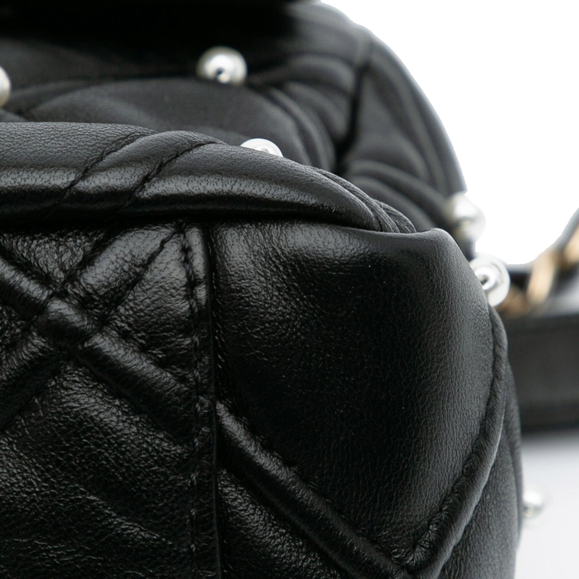 This shoulder bag features a quilted lambskin leather body with pearl studs, leather-woven chain link straps with leather guard, a front flap with a CC turn-lock closure, and an interior zip pocket. Inclusion: authenticity card. Retail Price: 5100.00