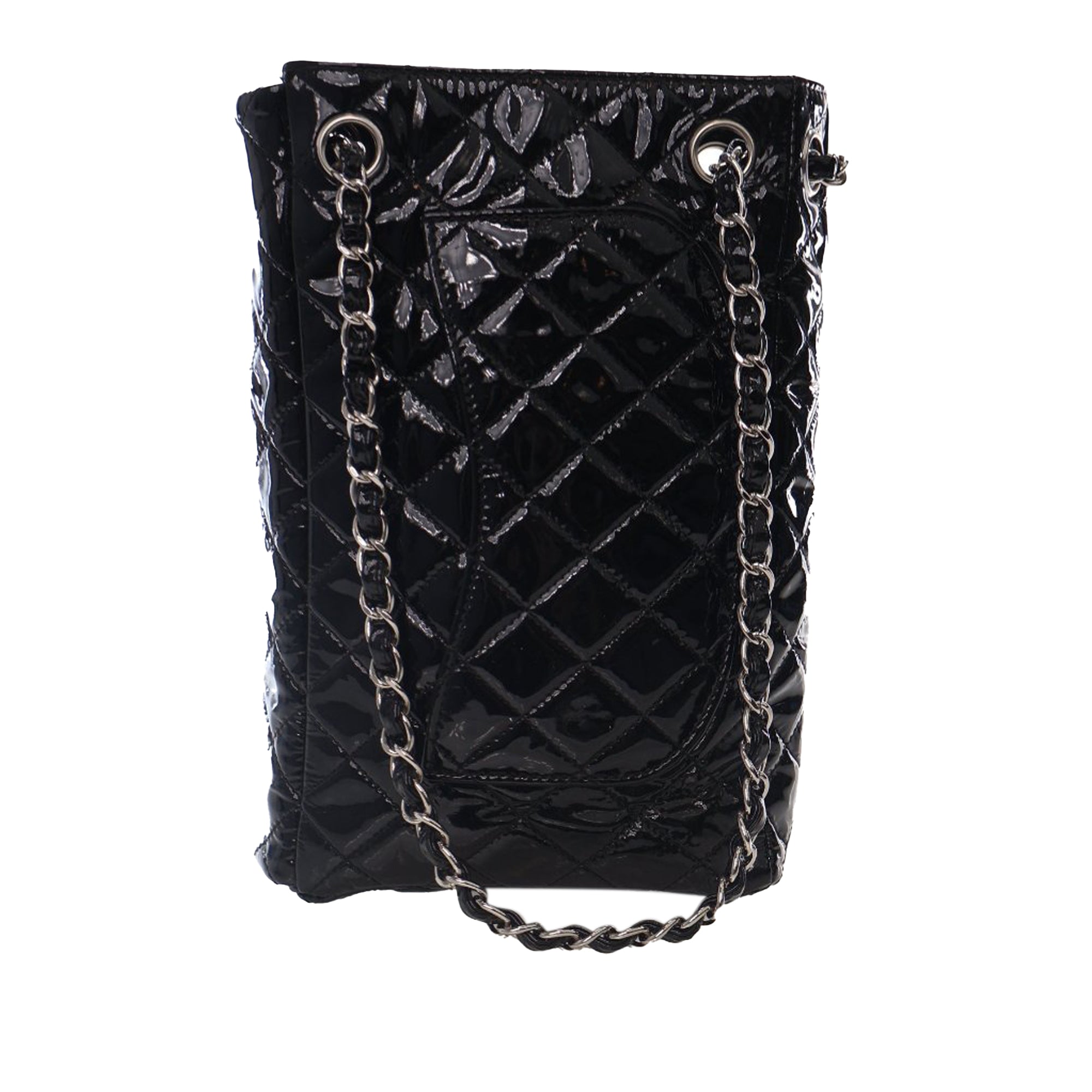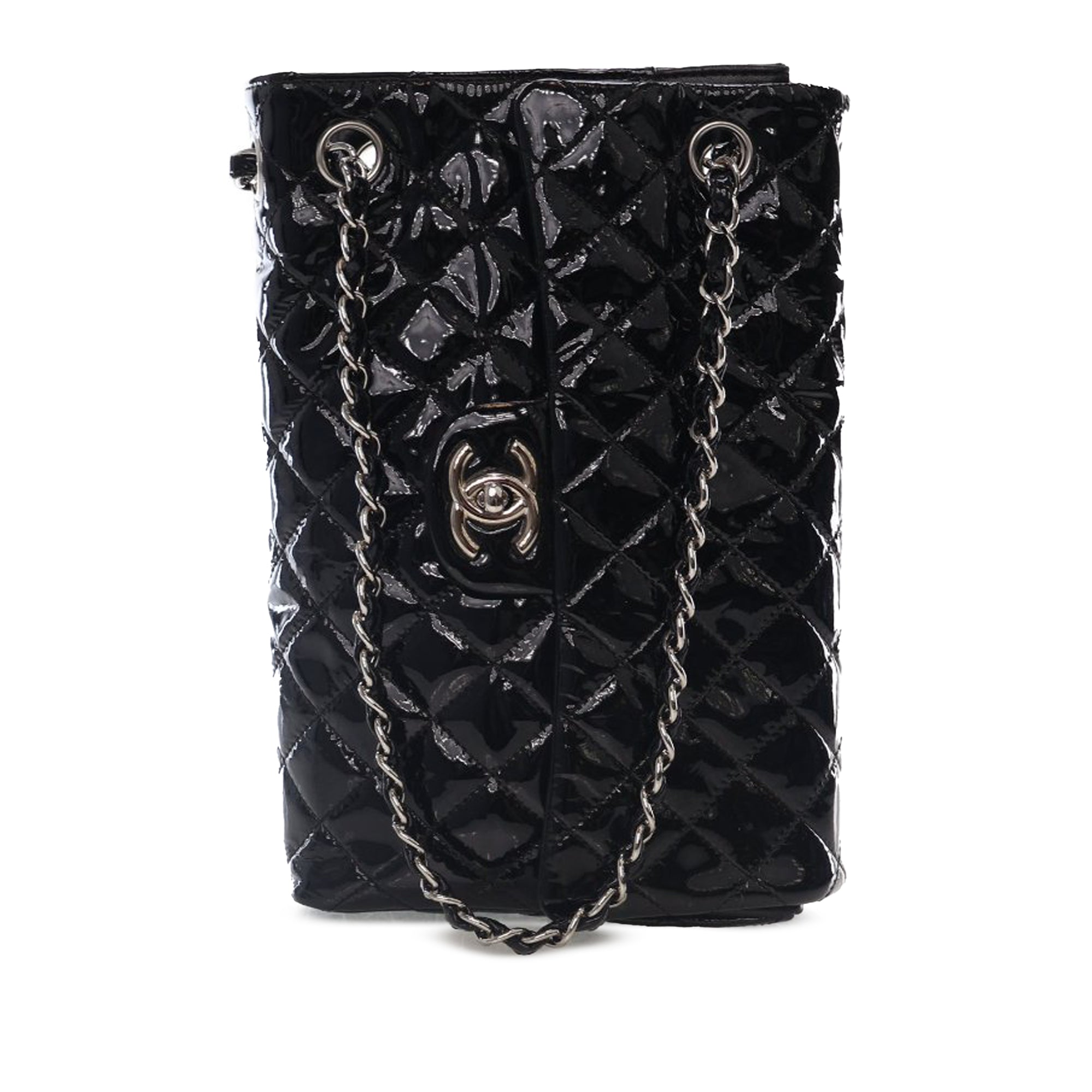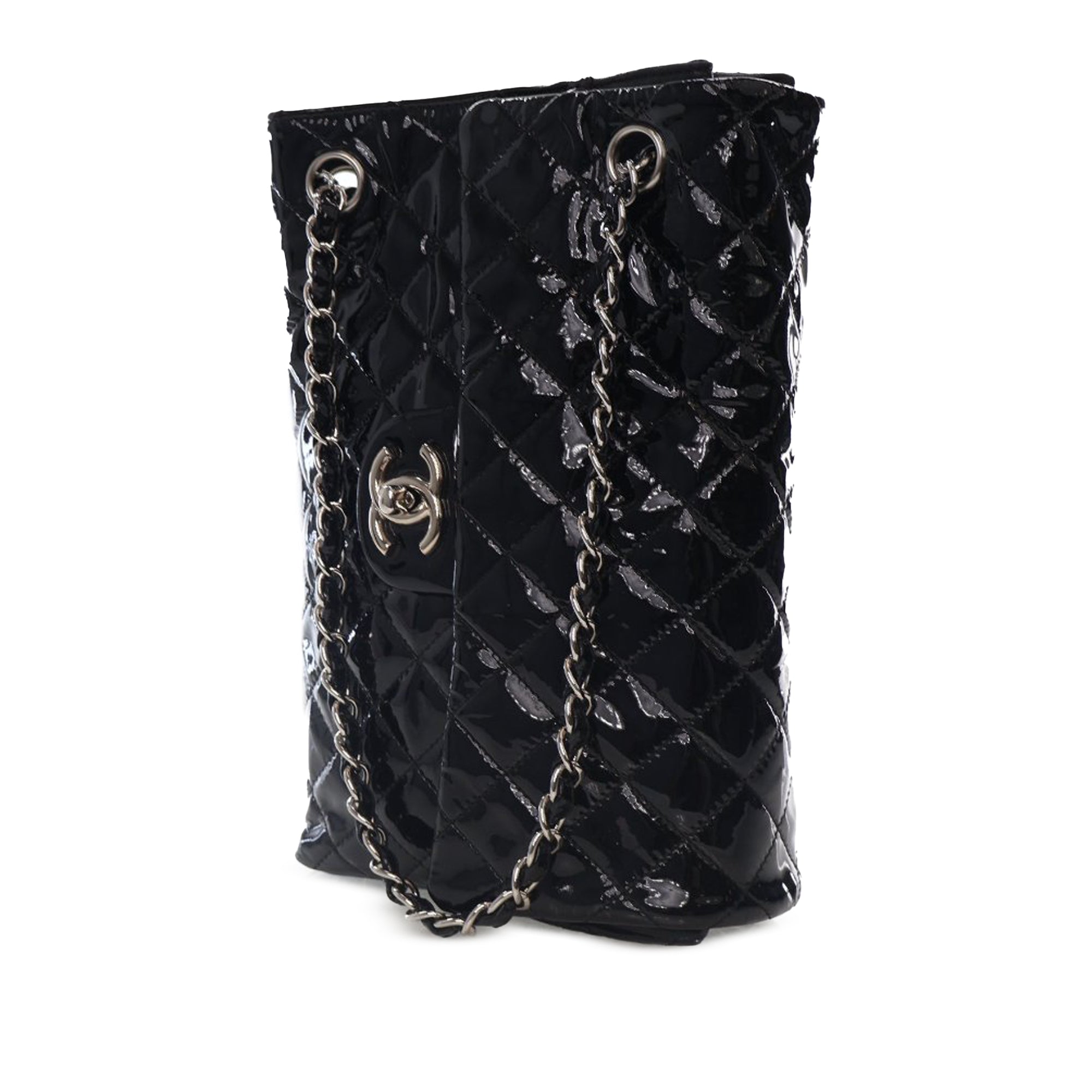 This shoulder bag features a patent leather body, silver-tone woven chain link shoulder straps, a side flap with interlocking CC and a twist-lock closure, an open top, and exterior slip pockets. Inclusion: Dust bag, box. Retail Price: 2675.00