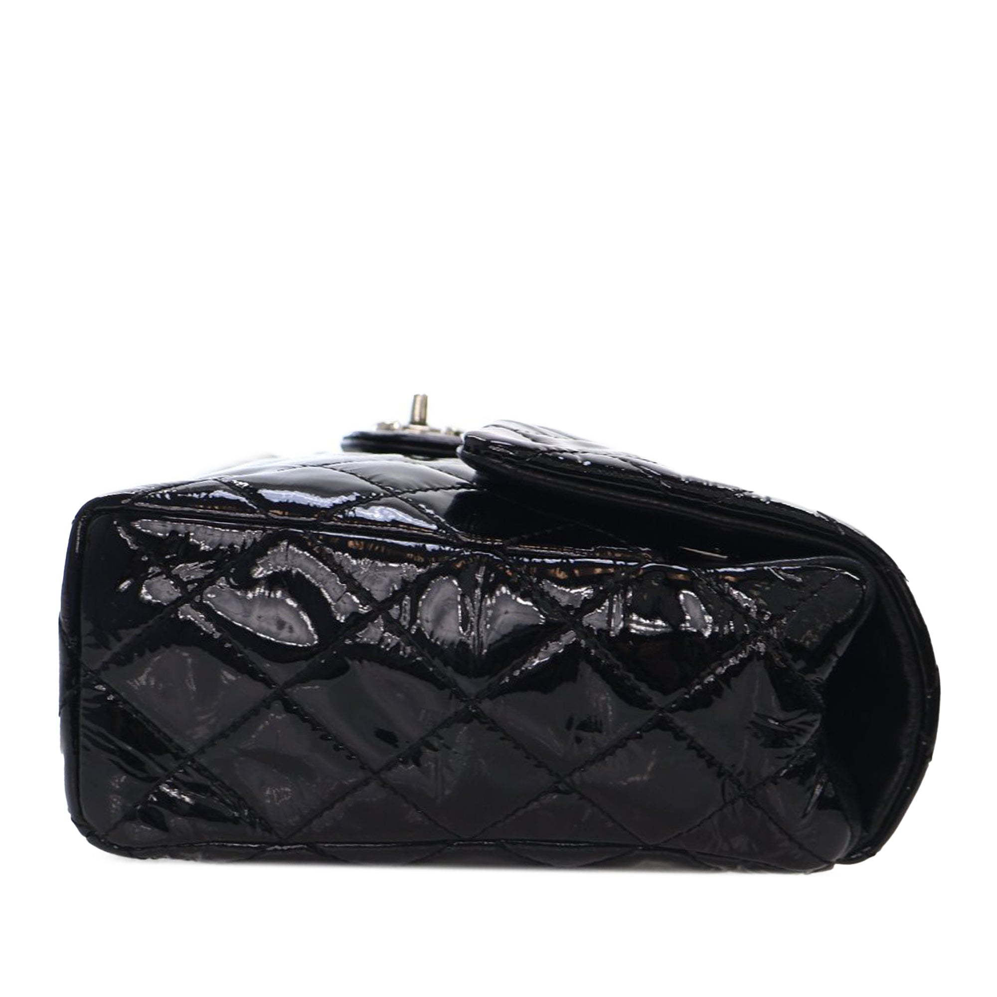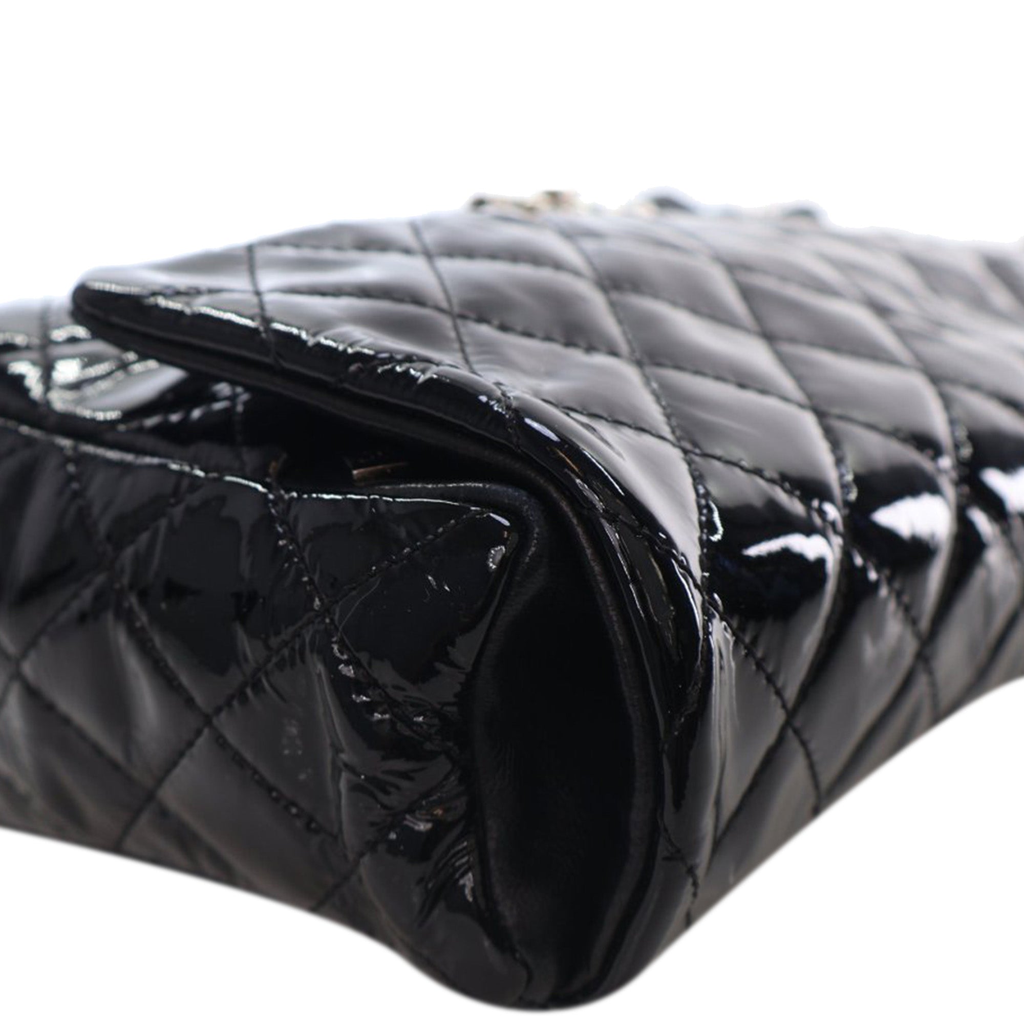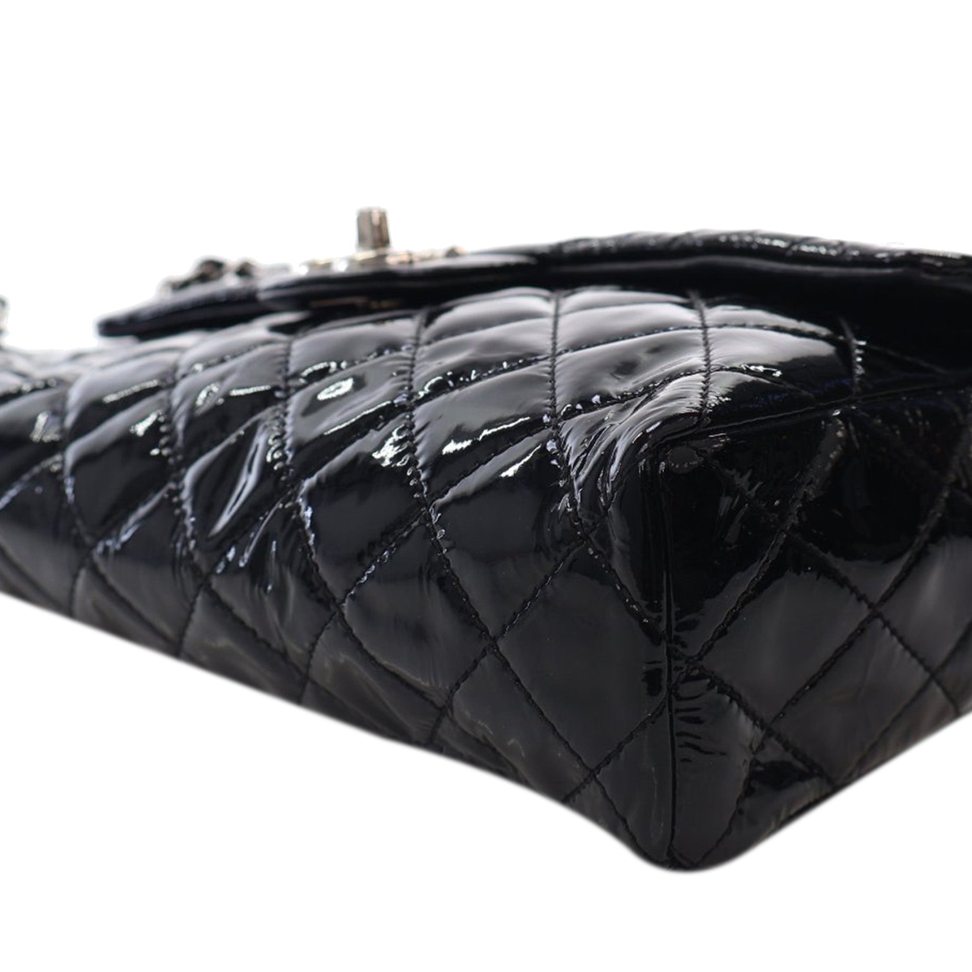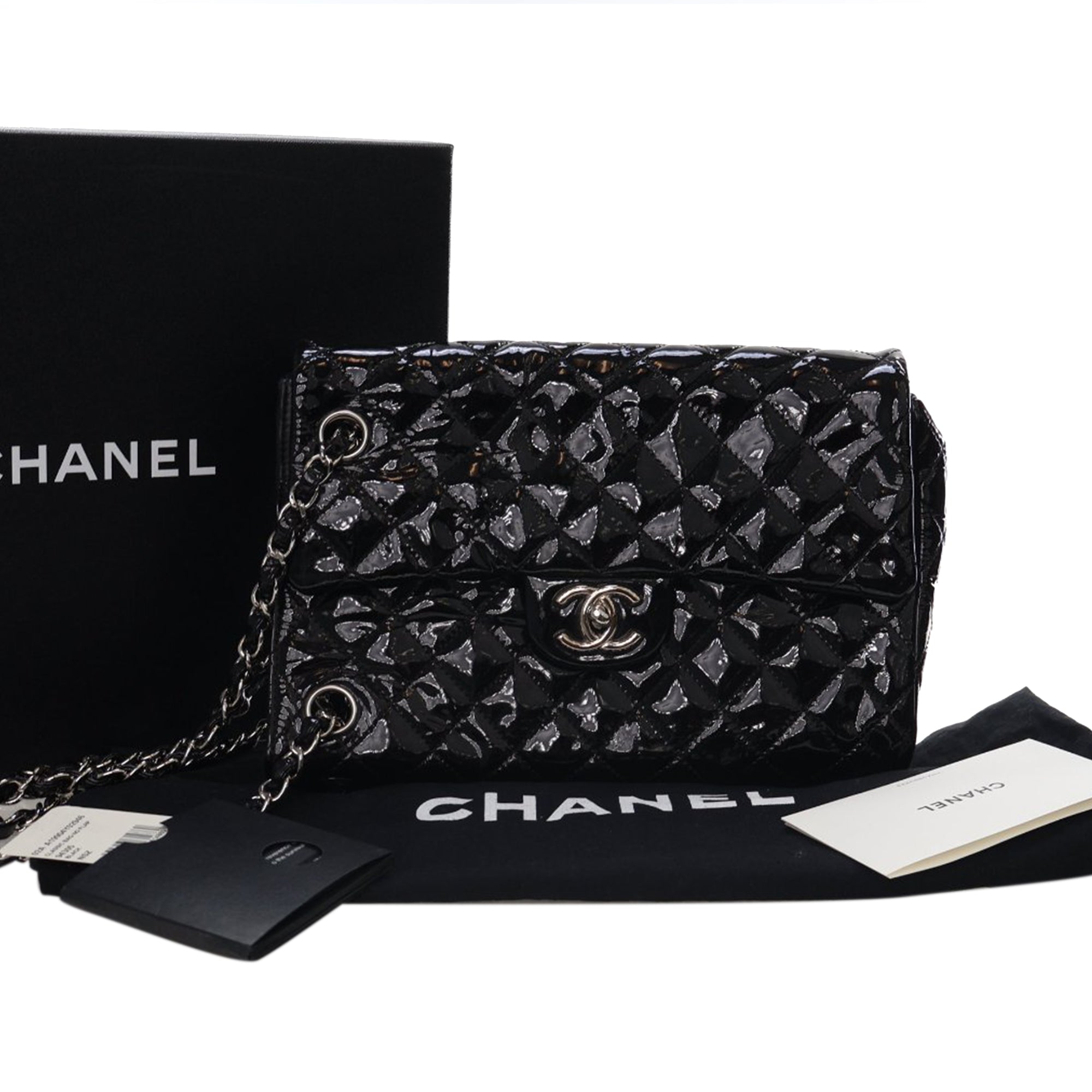 This shoulder bag features a patent leather body, silver-tone woven chain link shoulder straps, a side flap with interlocking CC and a twist-lock closure, an open top, and exterior slip pockets. Inclusion: Dust bag, box. Retail Price: 2675.00