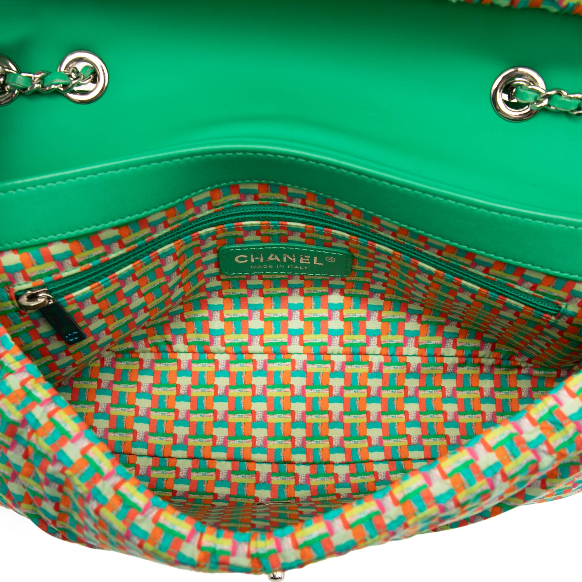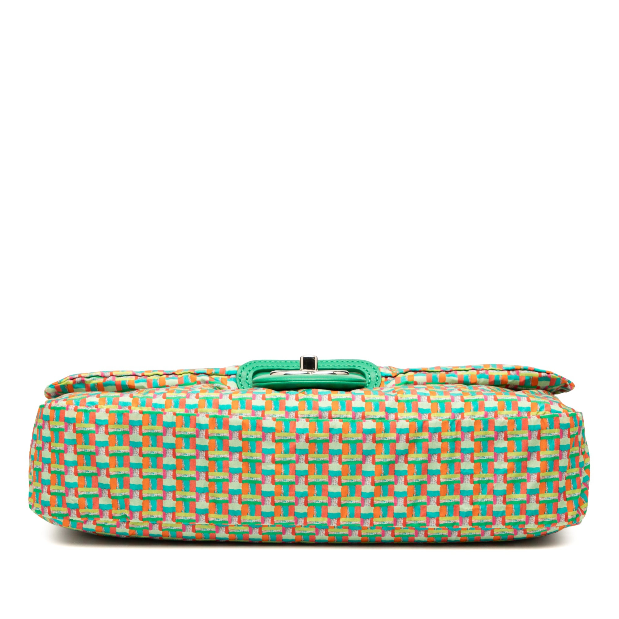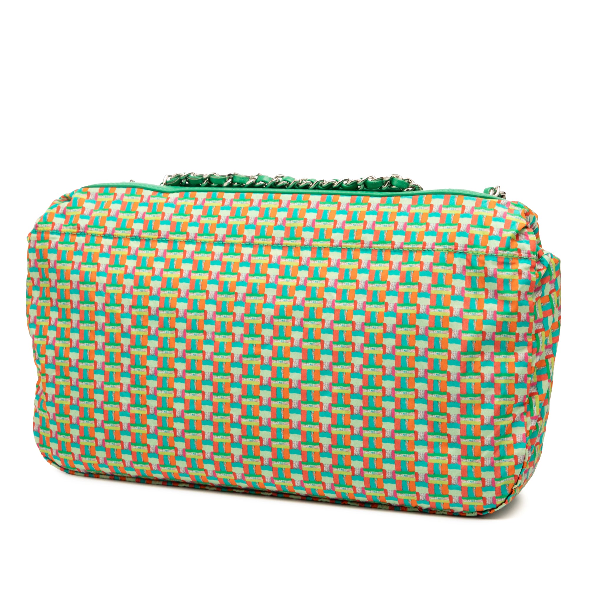 This flap bag features a quilted rubber body, a printed fabric cover, a leather-woven chain link strap with leather guard, a front flap with interlocking Cs and a twist lock closure, an exterior back zip pocket, and an interior zip pocket. Retail Price: 10800.00