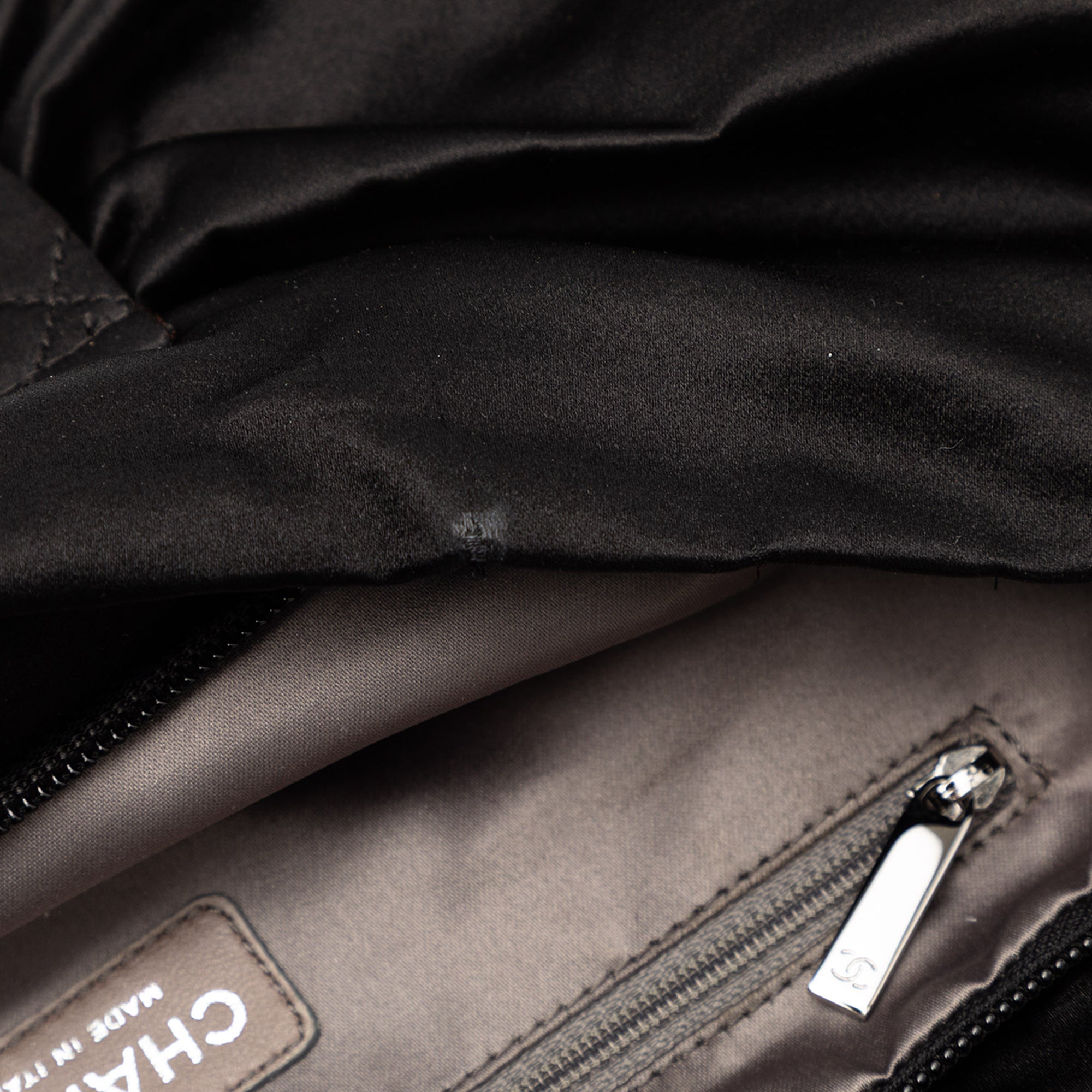 This bag features a quilted satin body, chain link straps, a top zip closure, a front flap tab with twist lock closure, and an interior zip pocket. Retail Price: 3500.00