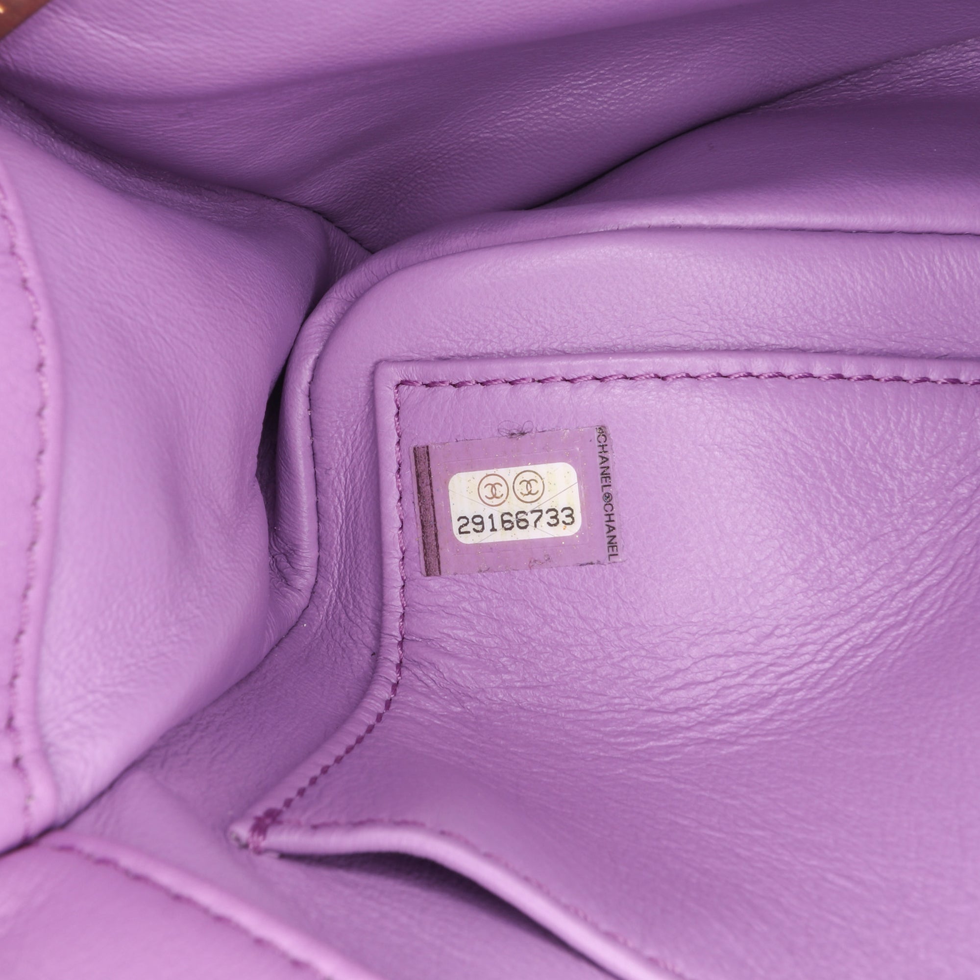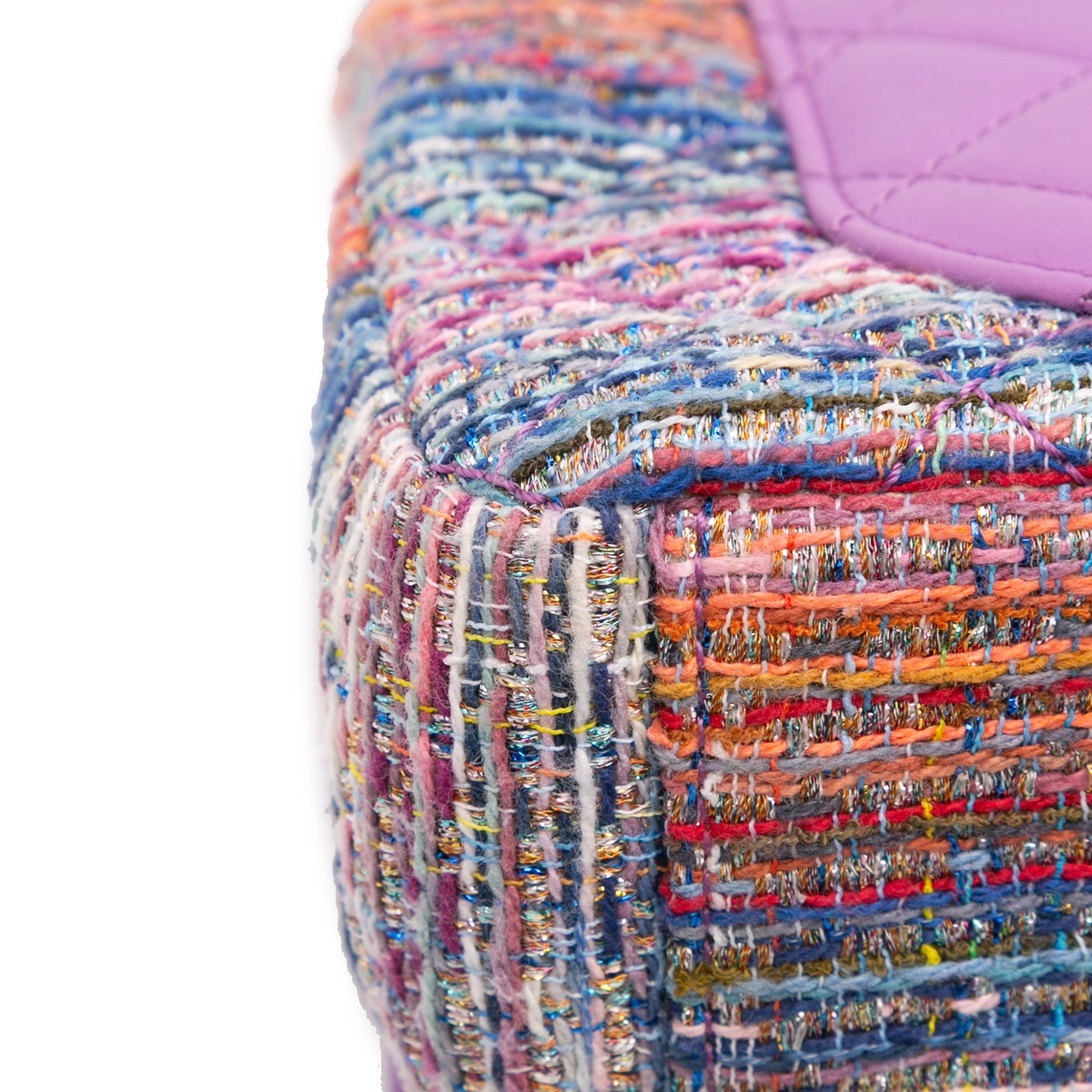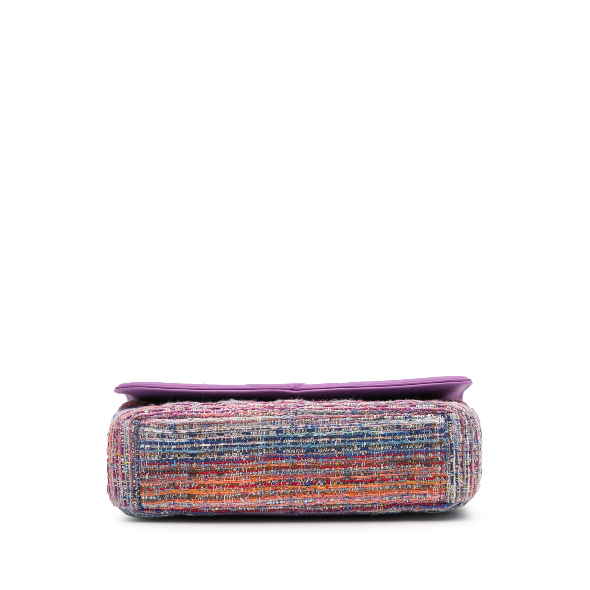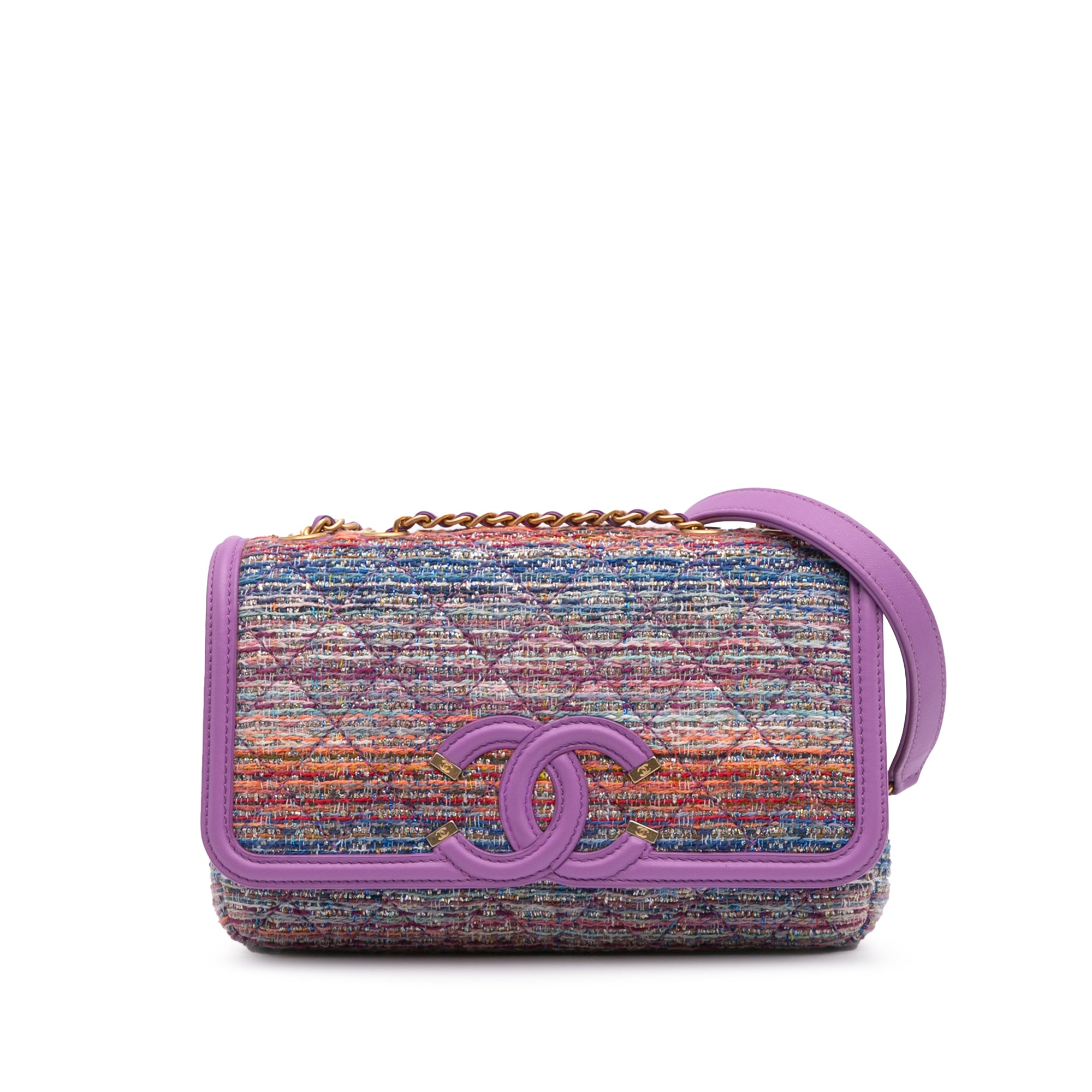 The Filigree Flap features a quilted tweed body with leather trim, a leather woven chain strap with leather guard, a flap with magnetic snap closure, an exterior back slip pocket, and interior zip and slip pockets. Retail Price: 6300.00
