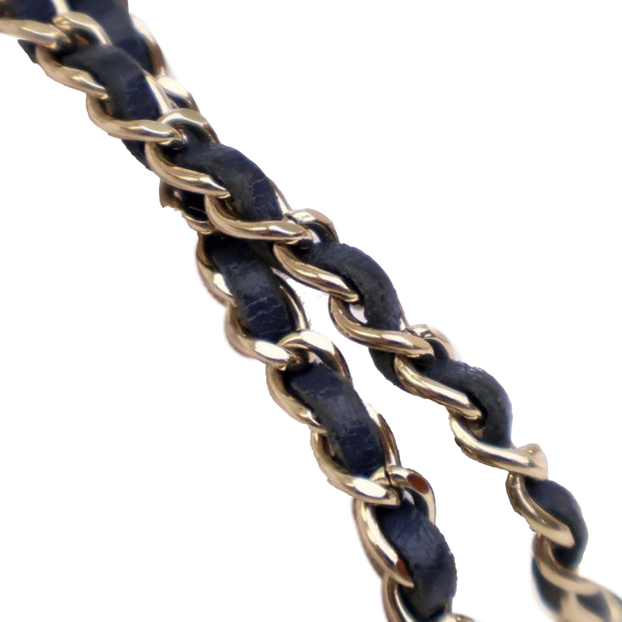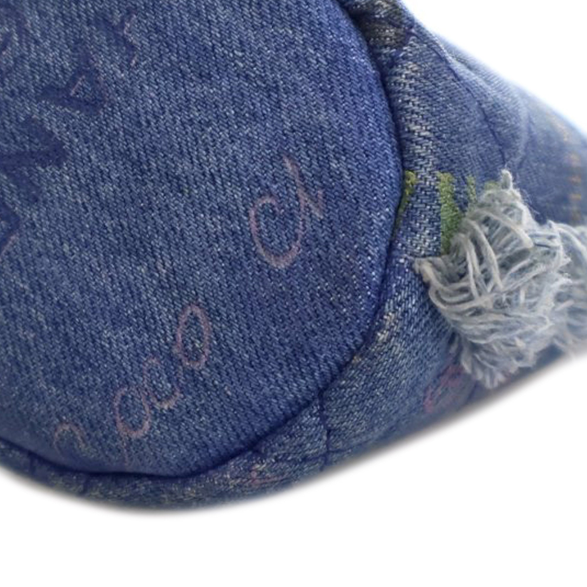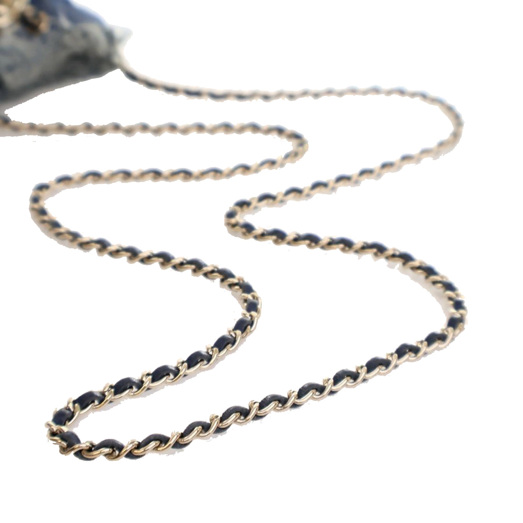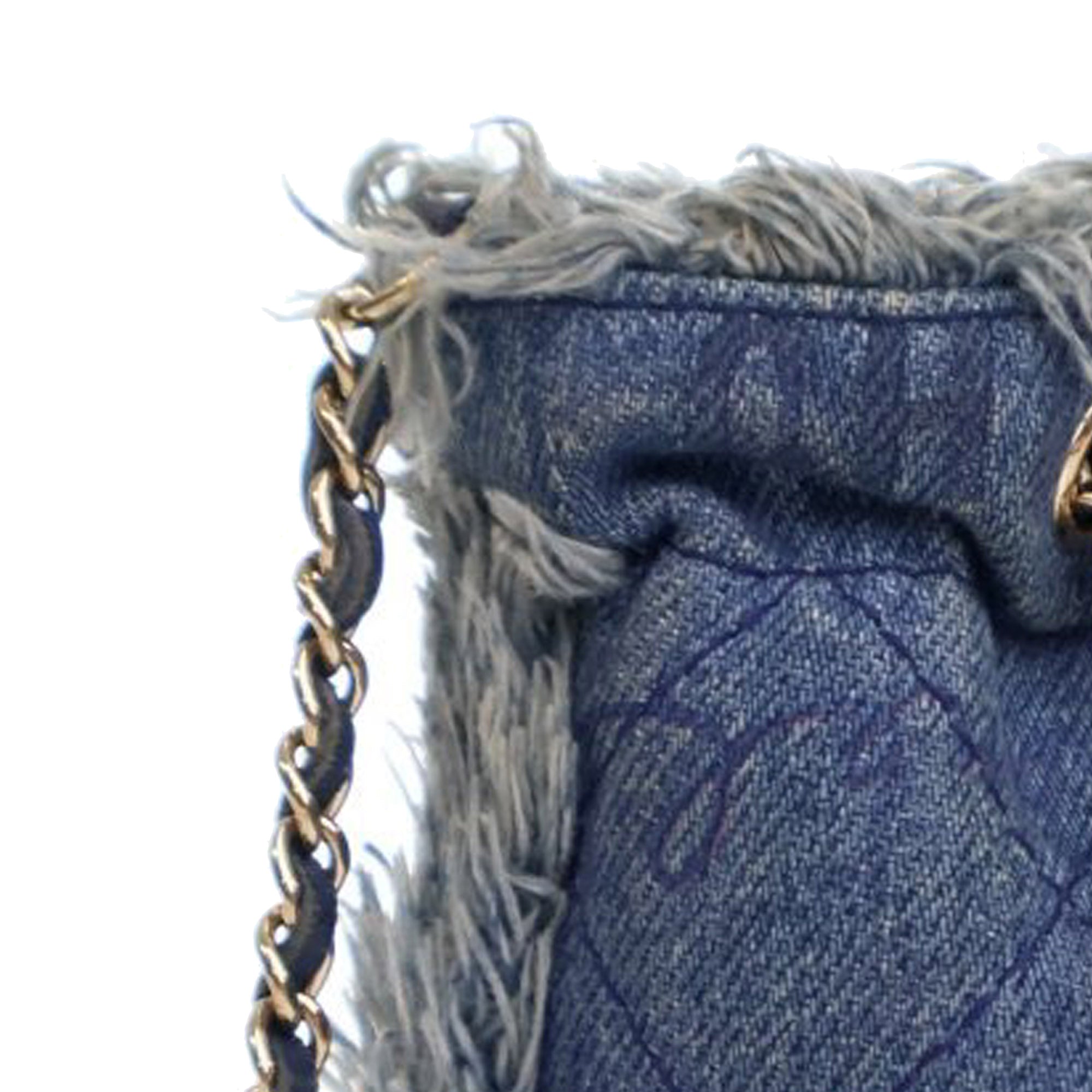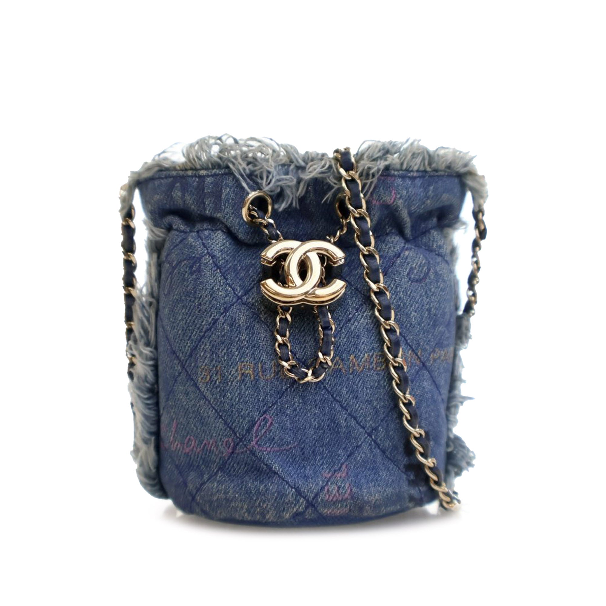 This bucket bag features a quilted denim body, a leather woven chain shoulder strap, and a drawstring chain link with CC embellishment closure. Inclusion: Dust bag, authenticity card. Retail Price: 4000.00