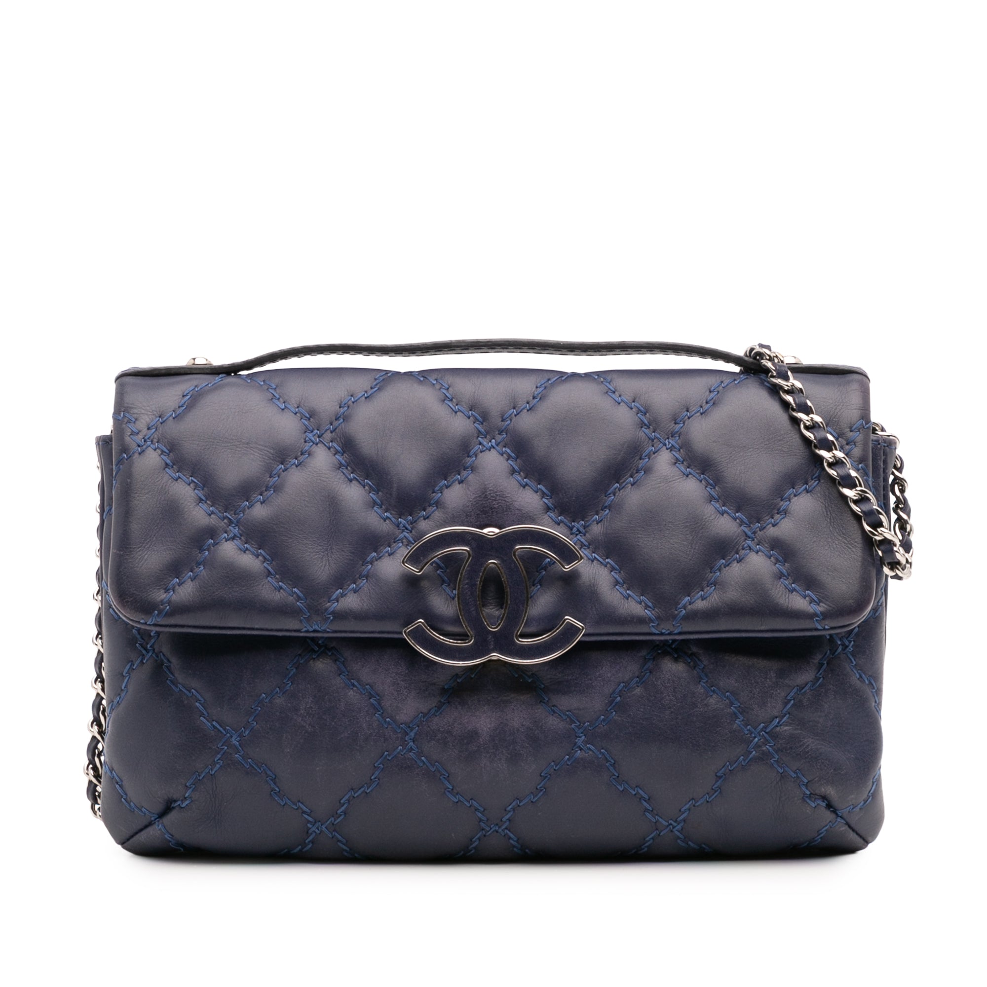 The Mini Double Stitch Hamptons Flap features a quilted leather body, a flat top handle, a woven leather chain strap, a flap with CC and snap closure, and an interior zip pocket. Retail Price: 3500.00