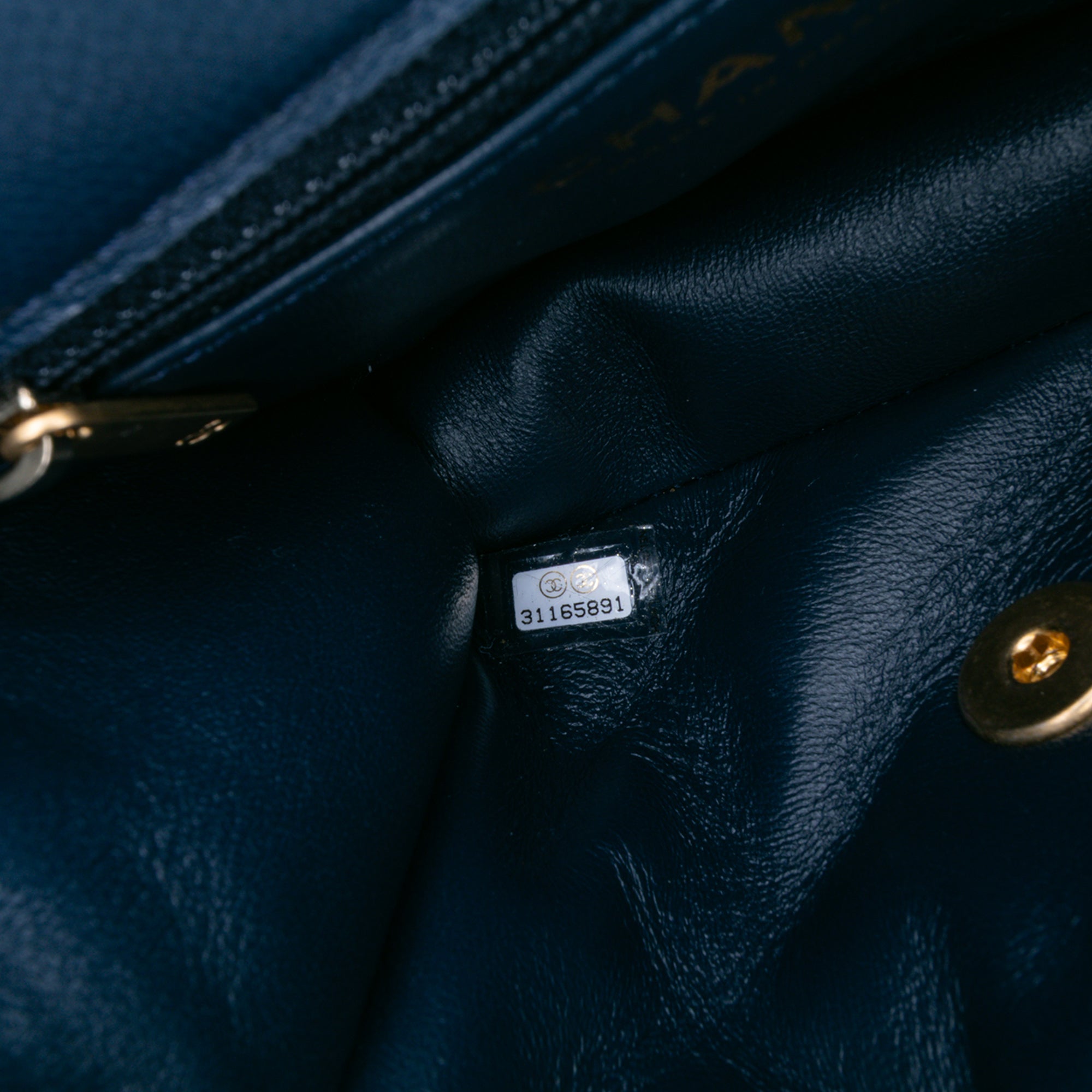 This crossbody bag features a quilted caviar leather body, a leather woven chain link shoulder strap, a front flap with turn-lock closure, an exterior back slip pocket, and an interior zip pocket. Inclusion: authenticity card. Retail Price: 5100.00