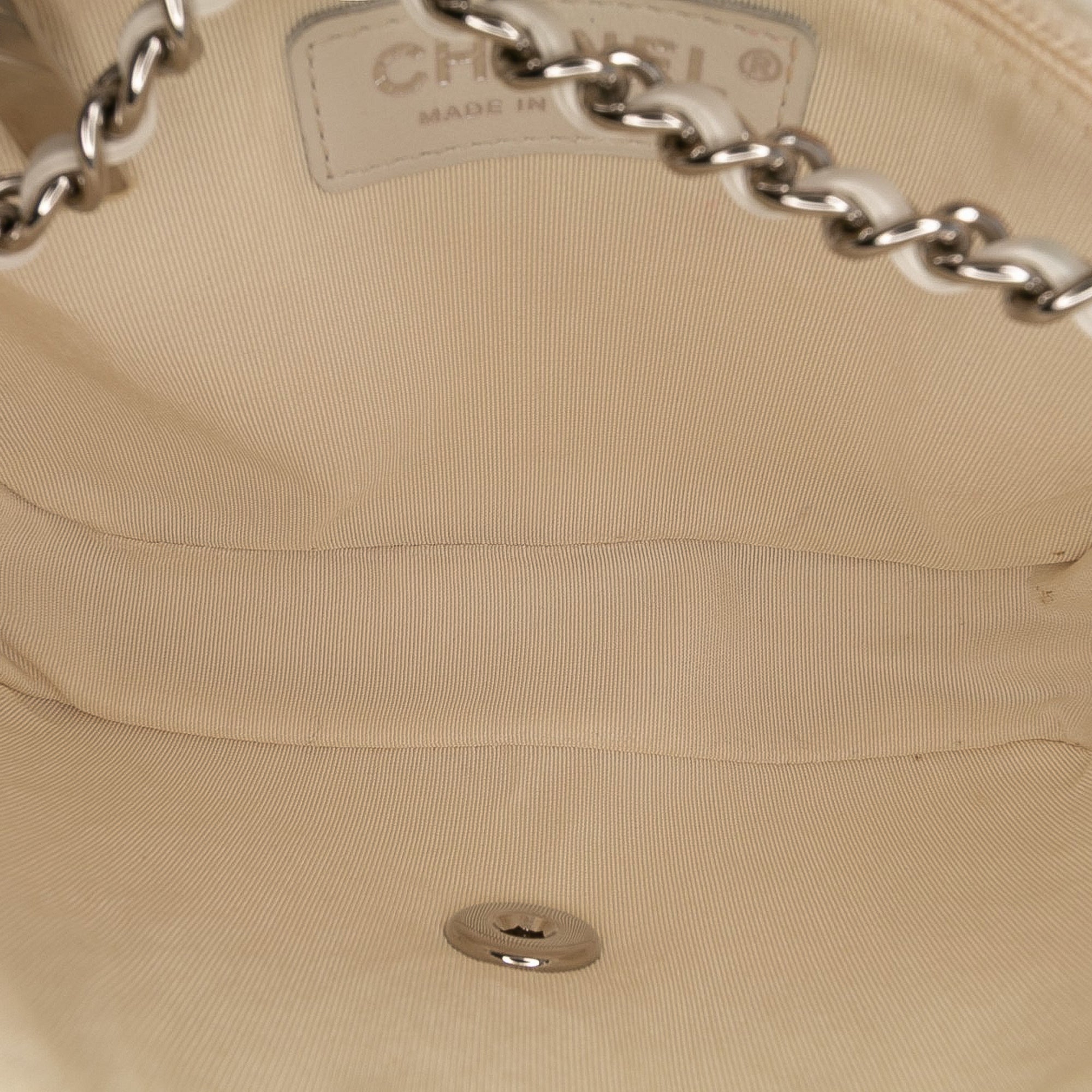 This shoulder bag features quilted lambskin leather with metallic trim border, a leather woven chain link shoulder strap, a front CC turn-lock closure, and an interior zip pocket. Inclusion: authenticity card. Retail Price: 3400.00