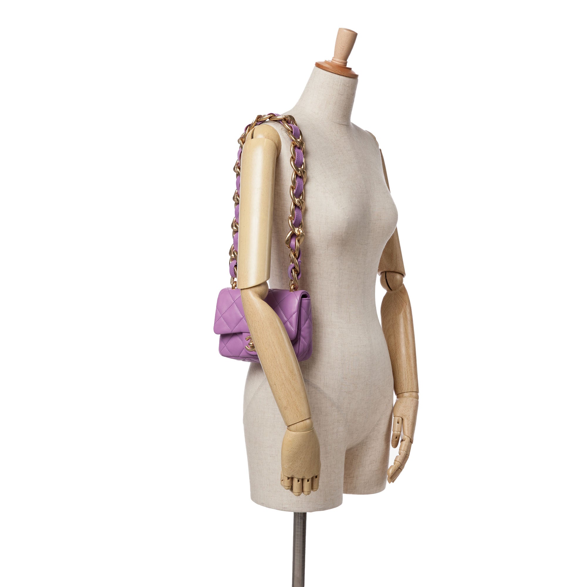 This shoulder bag features a quilted lambskin leather body, a leather woven chain link shoulder strap, a flap with a CC twist-lock closure, an exterior back slip pocket, and an interior slip pocket. Retail Price: 4900.00
