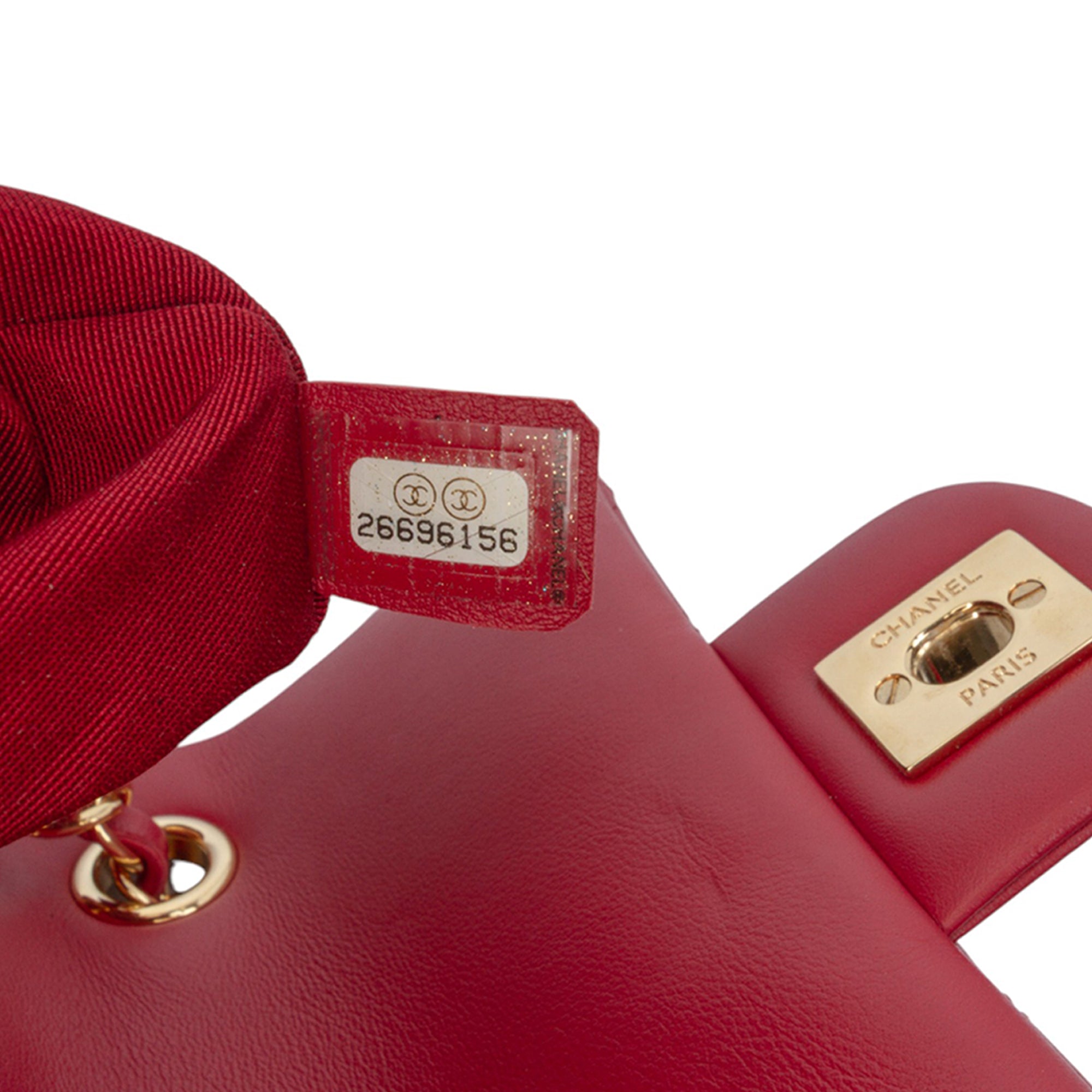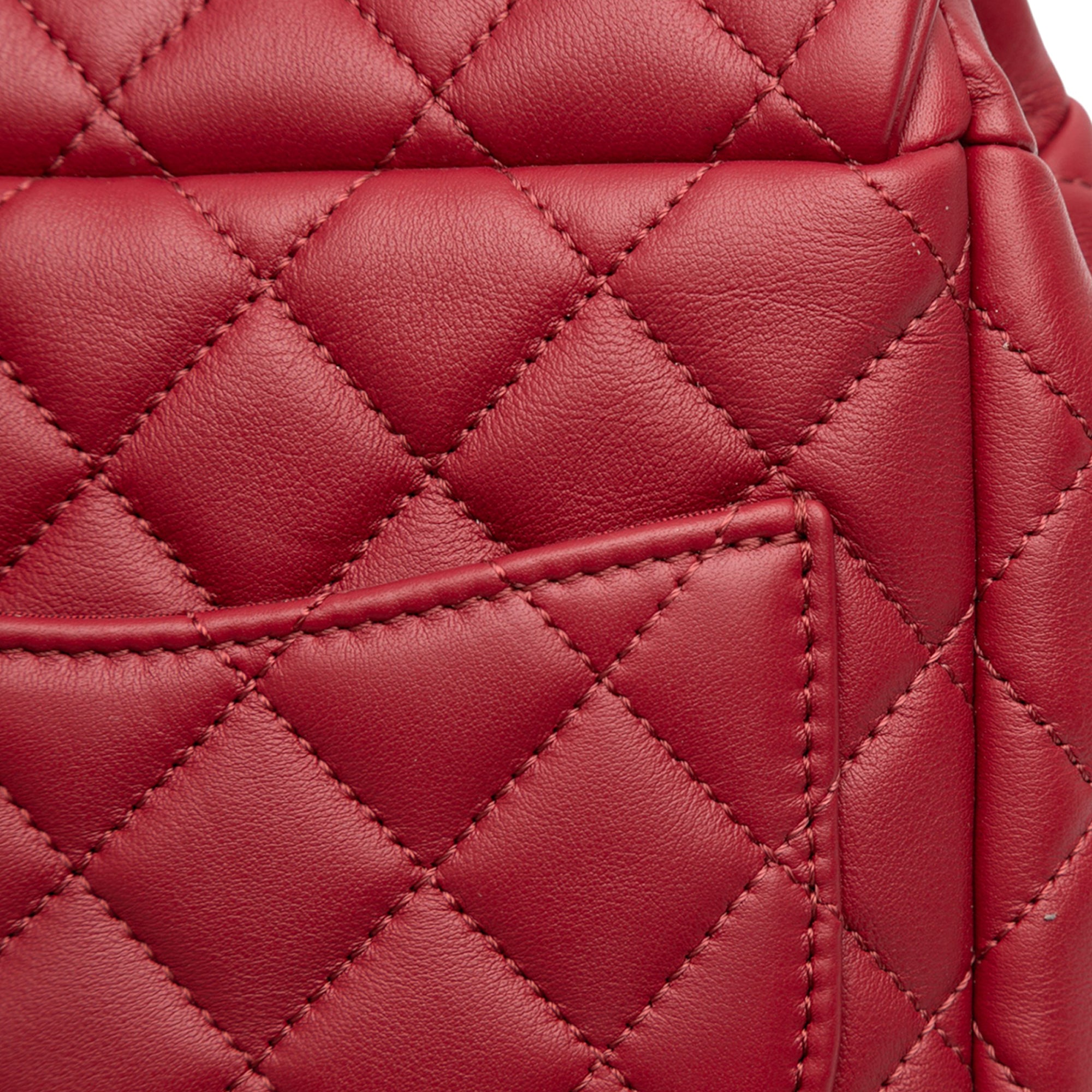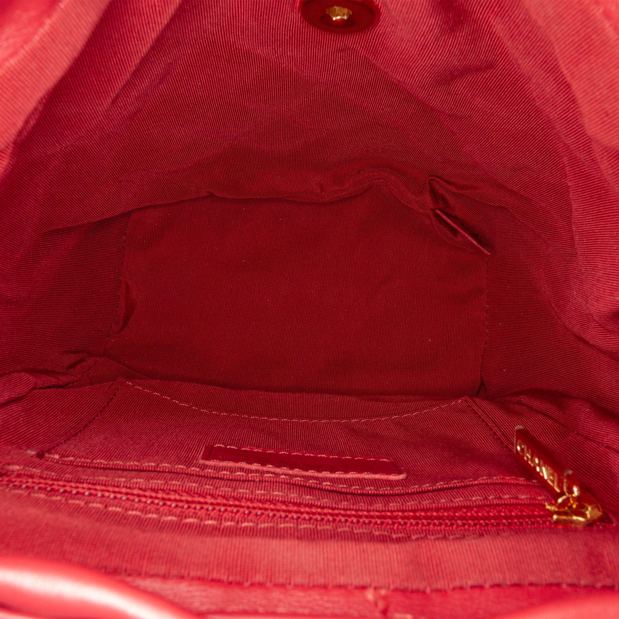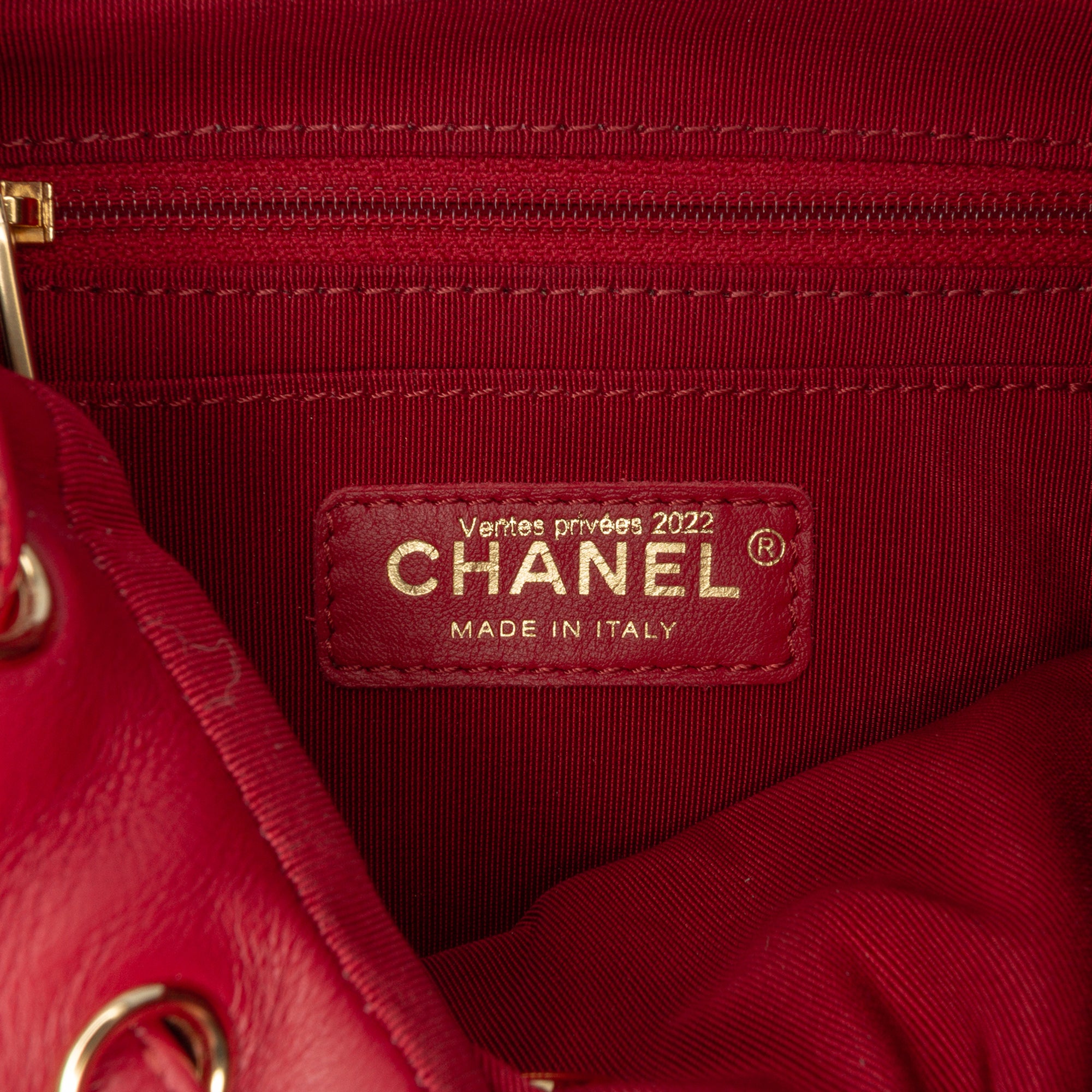 This backpack features a quilted lambskin leather body, a leather-woven chain link handle, adjustable leather back straps, a top flap with interlocking CC twist lock closure, a drawstring closure, an exterior back slip pocket, and interior zip and slip pockets. Inclusion: Dust bag, box. Retail Price: 3900.00