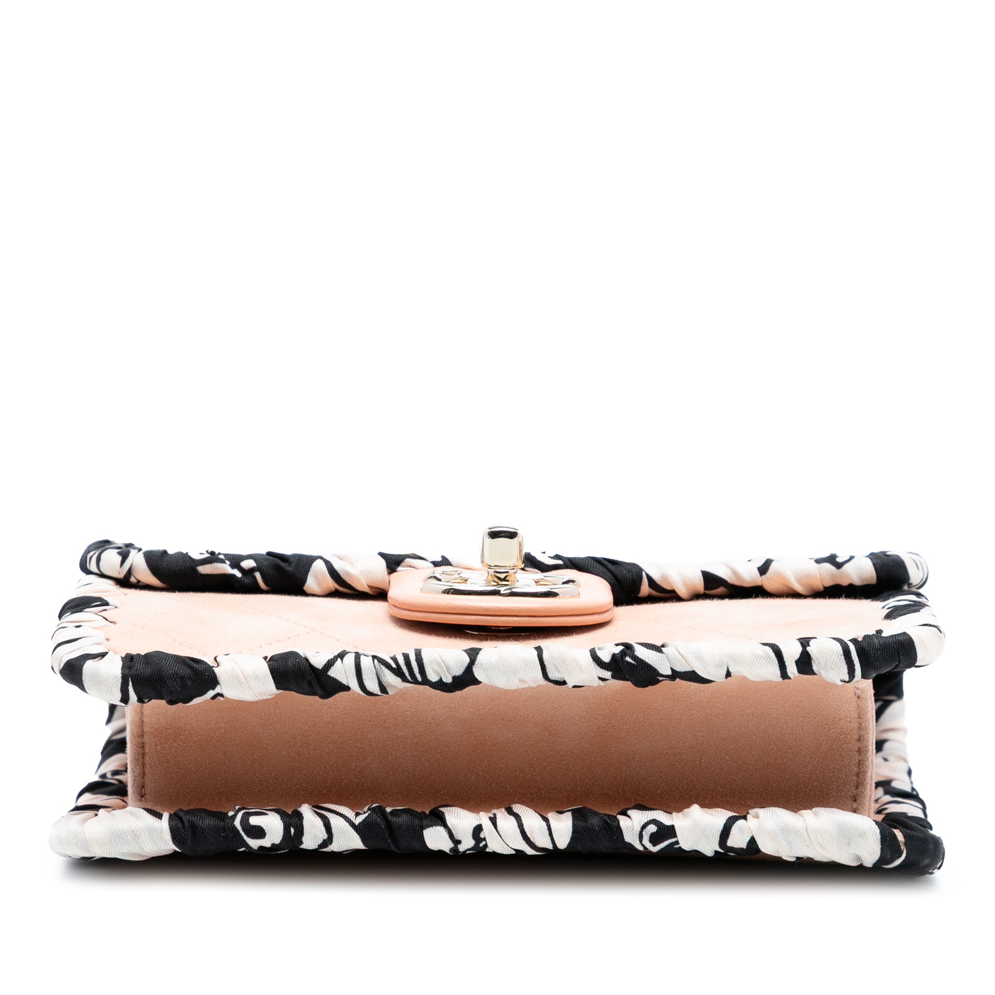 This flap bag features a suede body with printed silk whipstitch details, a silk-woven chain strap with leather shoulder guard, a front flap with CC turn lock closure, and an interior slip pocket. Retail Price: 4900.00