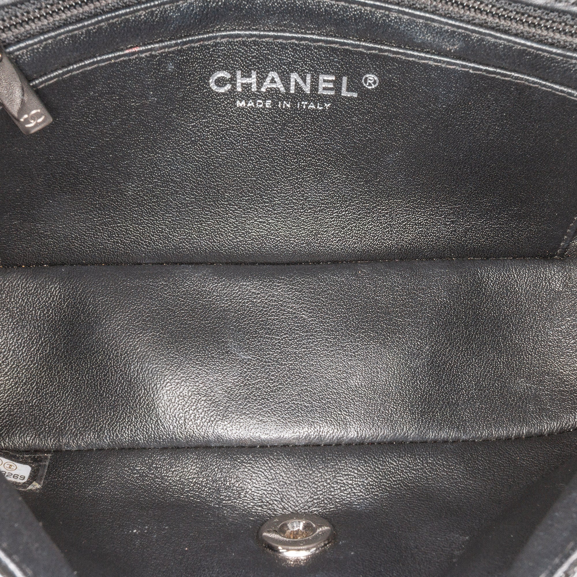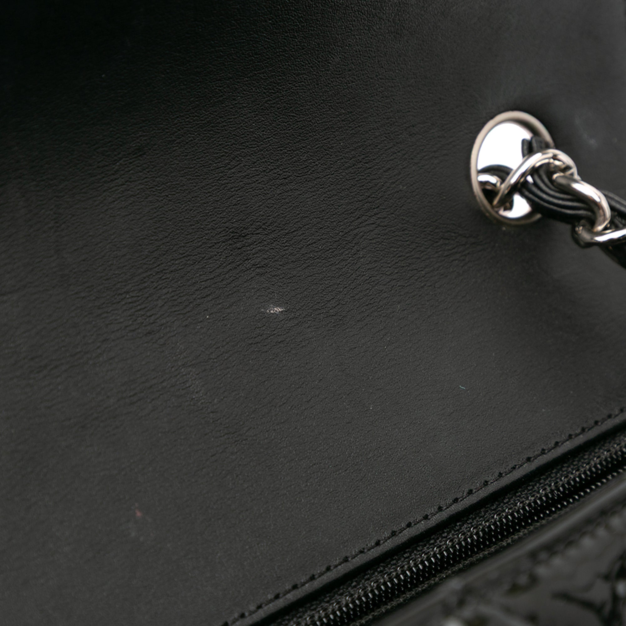 The Mini Rectangular Flap bag features a quilted patent leather body, a leather woven chain strap, a front flap with interlocking Cs and a twist lock closure, exterior back slip pocket, and an interior zip and slip pockets. Retail Price: 6700.00