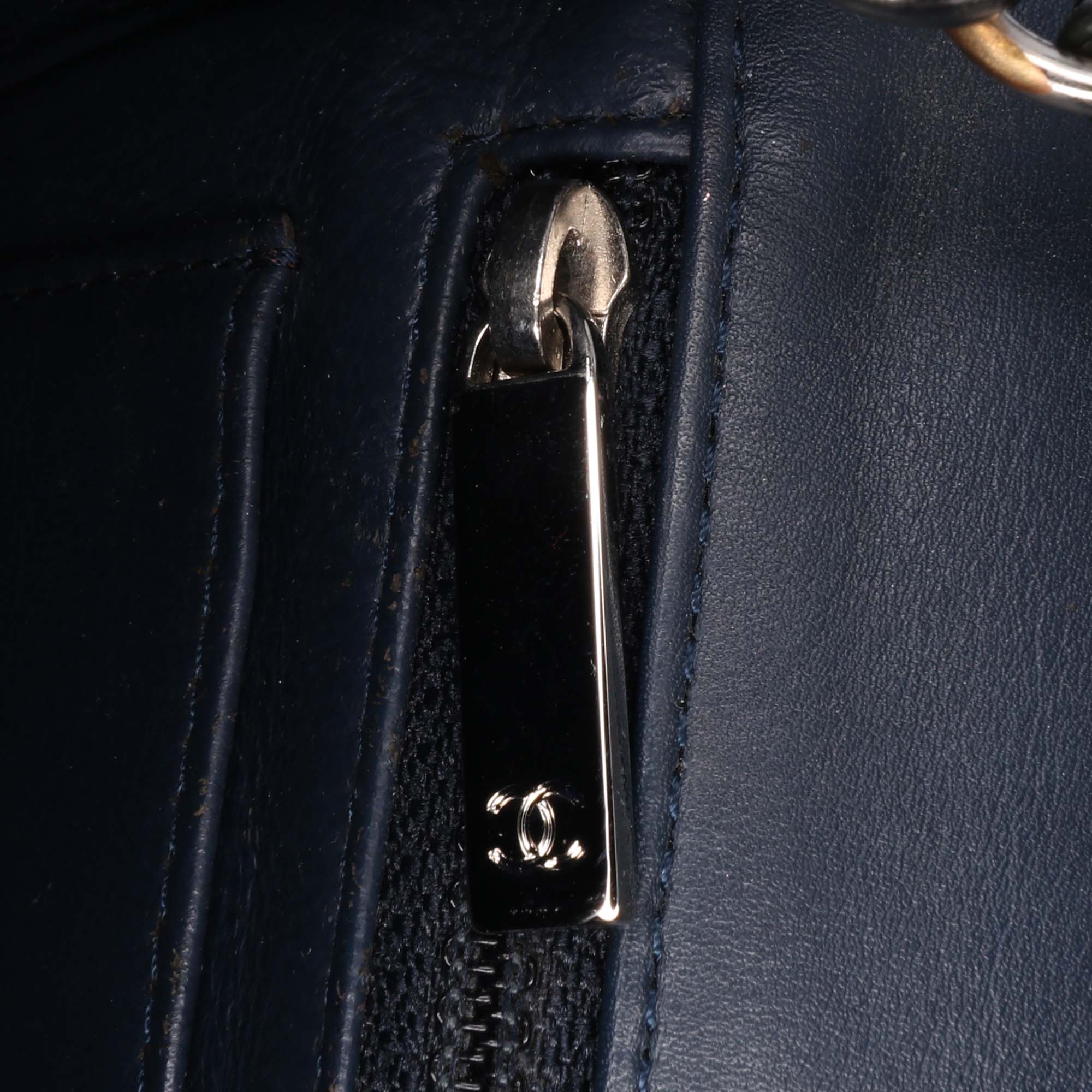 This crossbody bag features a quilted patent leather body, a leather woven chain strap, a front flap with interlocking Cs and a twist lock closure, an exterior back slip pocket, and interior zip and slip pockets. Retail Price: 5200.00