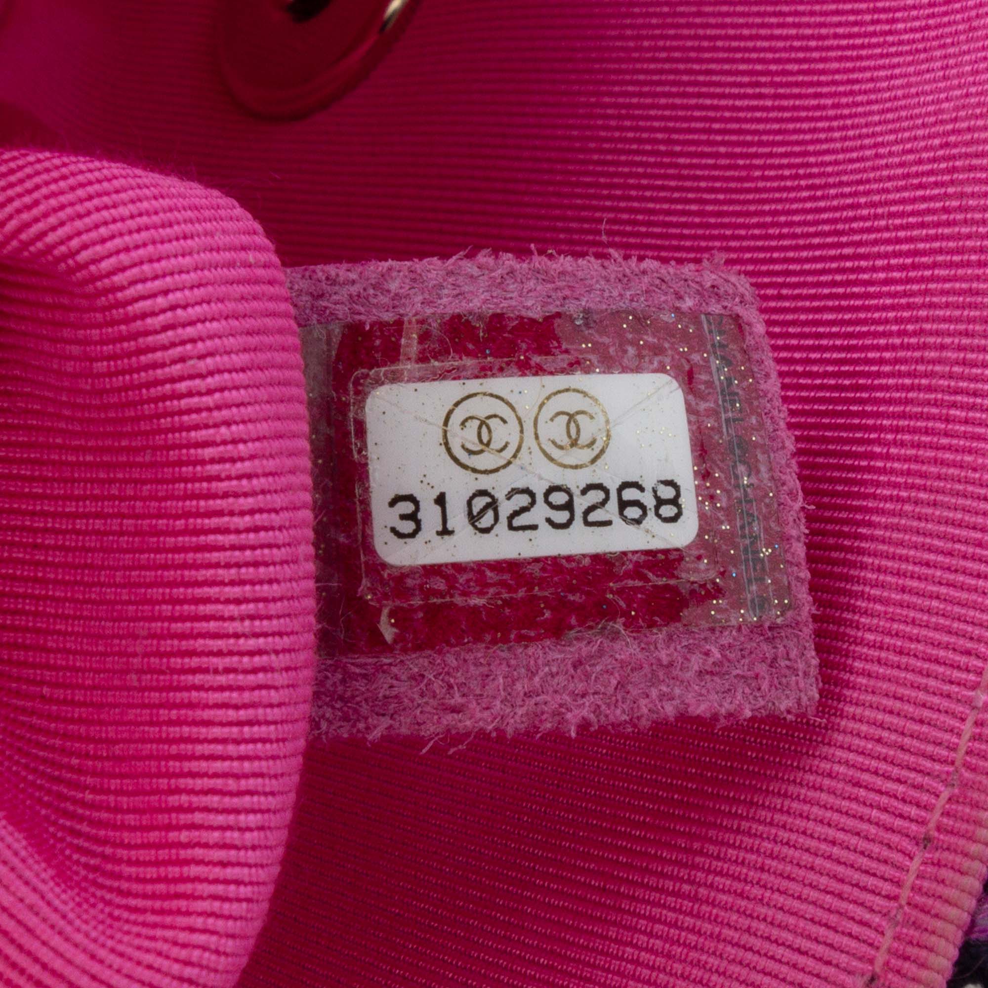 This flap bag features a stitched cotton body, a leather woven chain link shoulder strap, a front flap with interlocking Cs and twist lock closure, an exterior back slip pocket, and interior zip and slip pockets. Inclusion: authenticity card. Retail Price: 5500.00