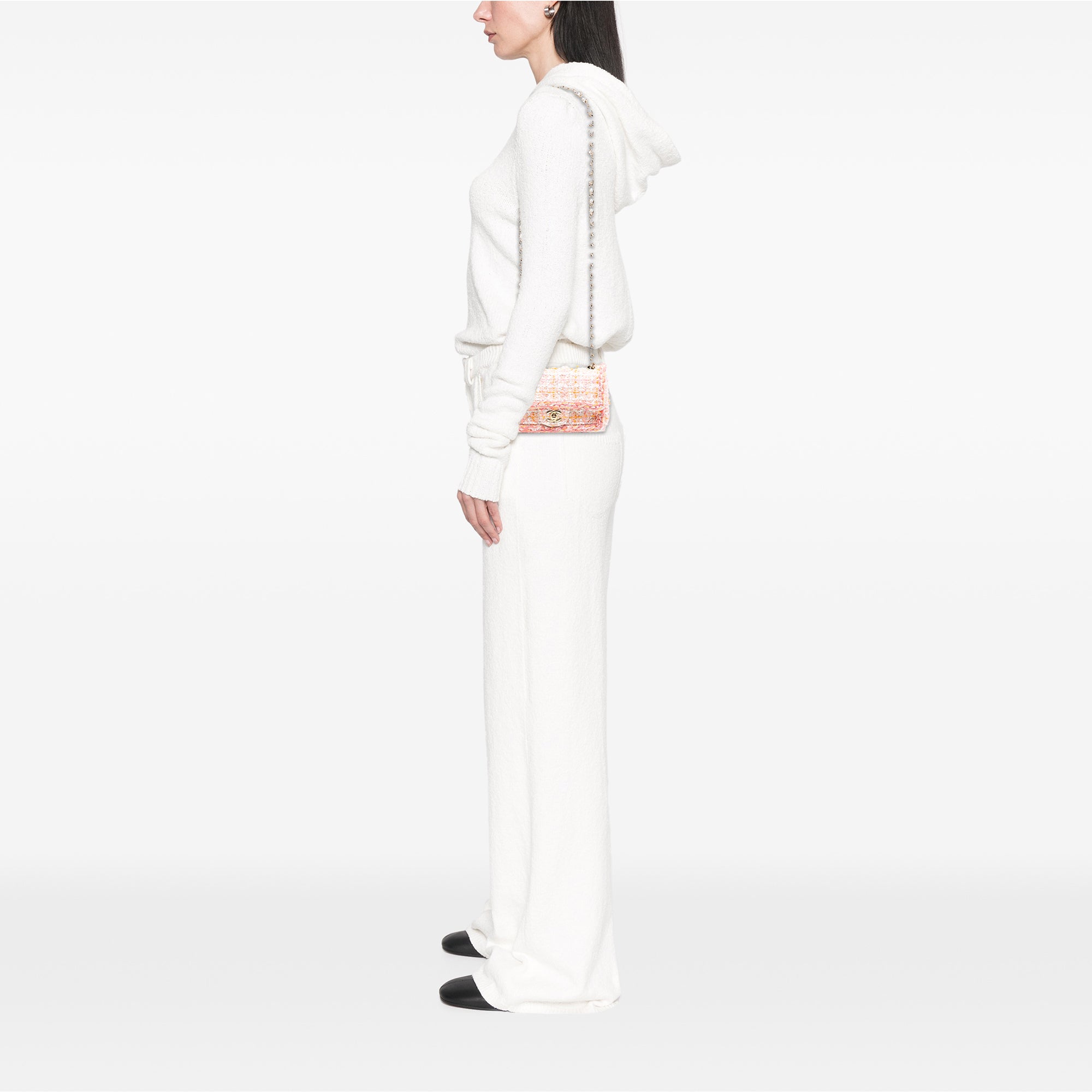 This shoulder bag features a sequin embellished tweed body, fabric woven chain shoulder straps, a front flap with interlocking Cs and twist lock closure, an exterior back slip pocket, and interior slip pockets. Retail Price: 5168.00