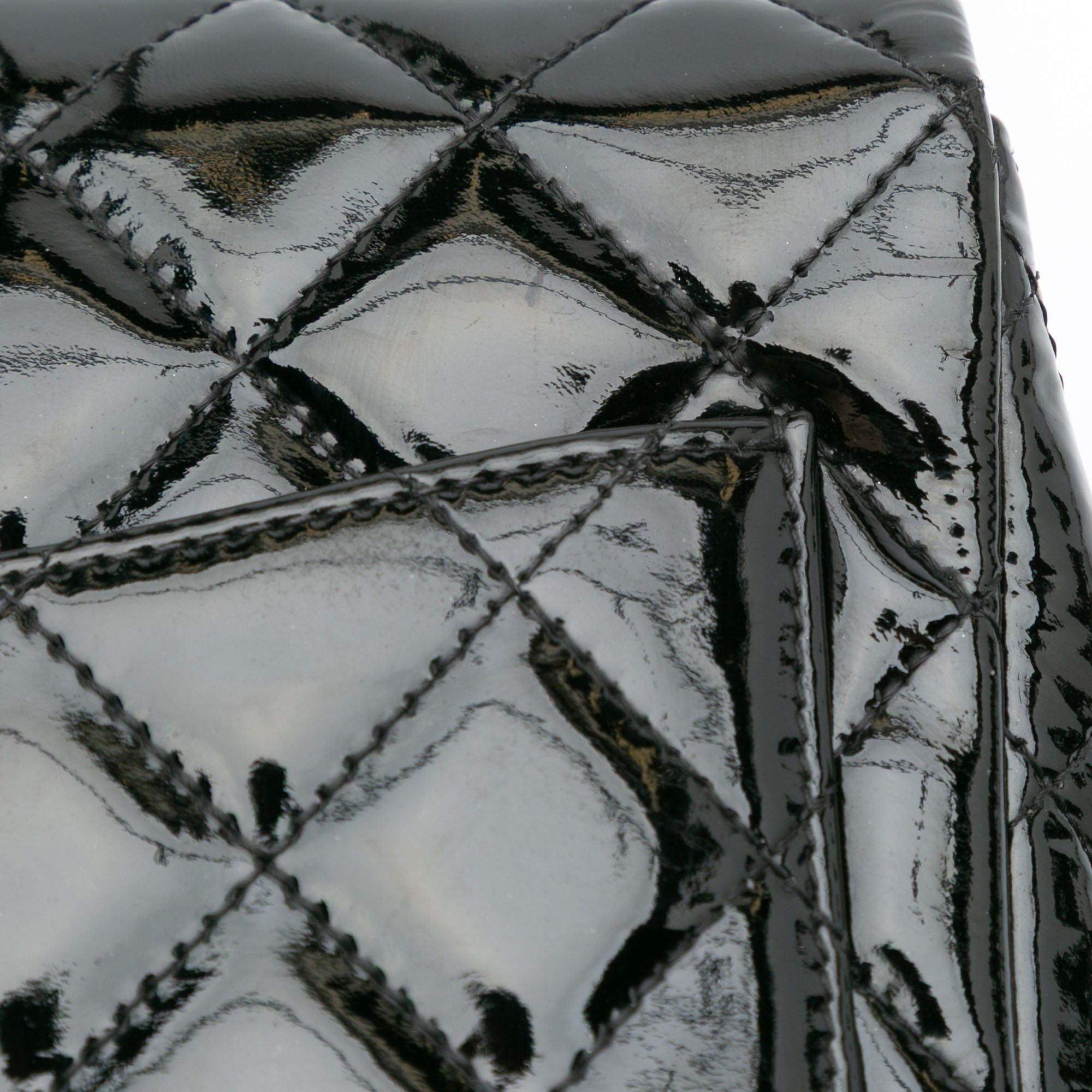 This flap bag features a quilted patent leather body, a leather woven chain shoulder strap, a front flap with interlocking Cs and a twist lock closure, an exterior back slip pocket, and interior zip and slip pockets. Retail Price: 4700.00
