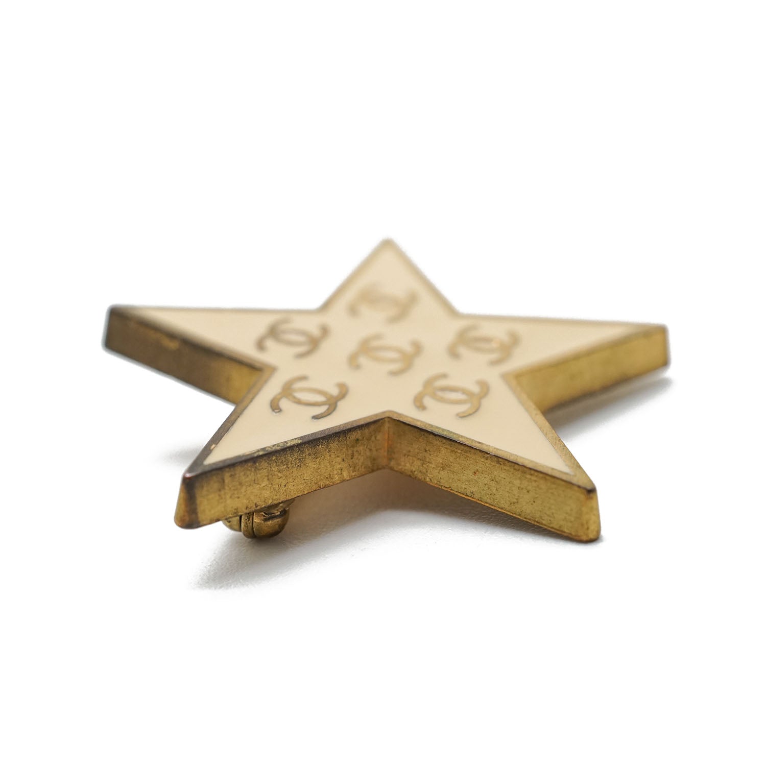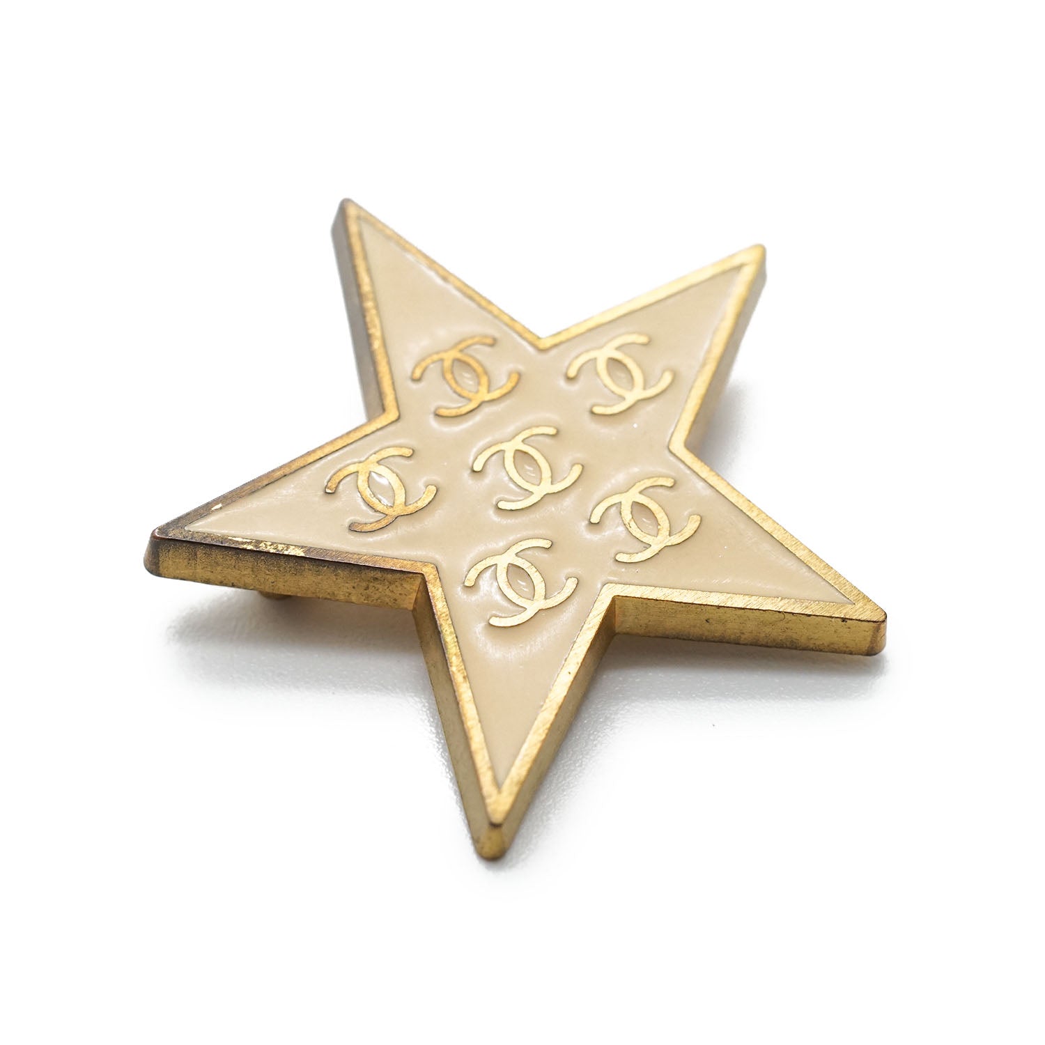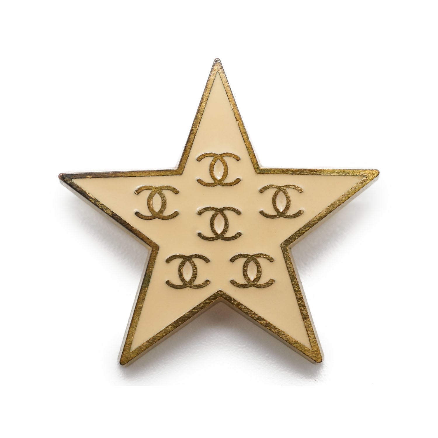 Multiple CC Star Brooch Cream white/Gold BrassDepth: 0.2cmHeight: 3cmWidth: 3.4cmDiscoloration: Some tarnish on the backScratch: Minor scratch on the leftSerial code: 01P