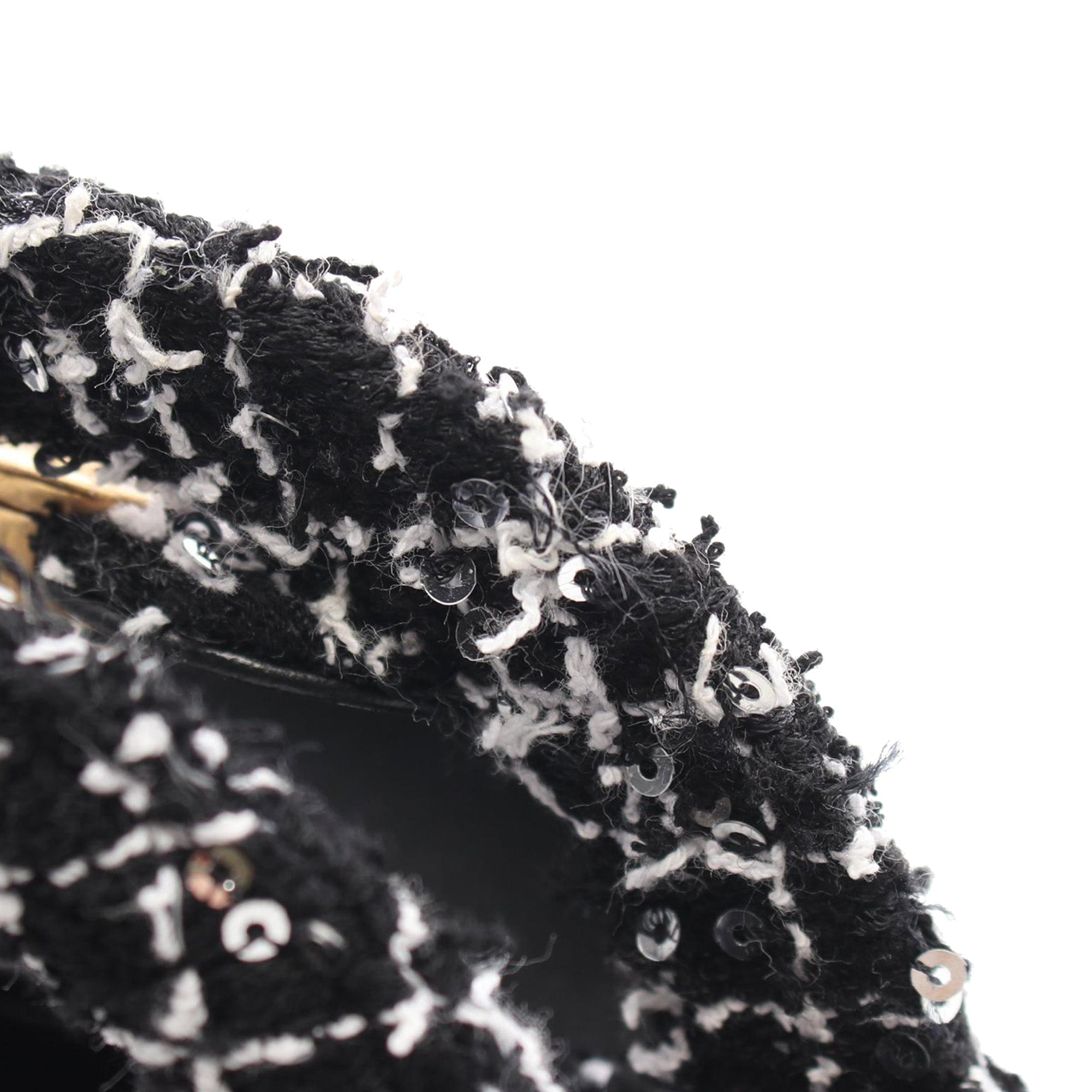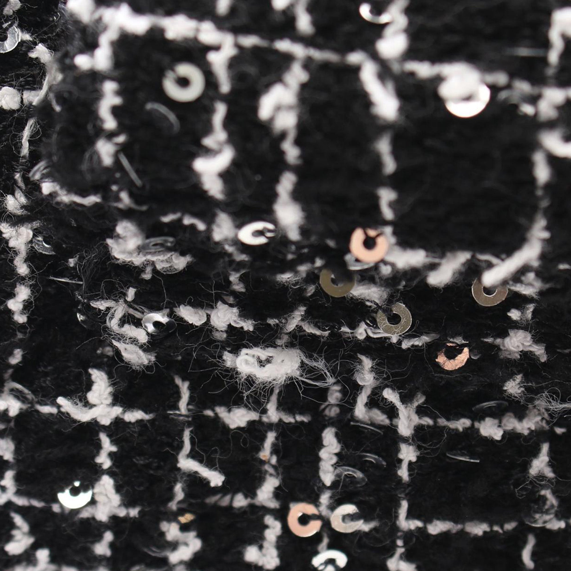 This satchel features a tweed body with sequin embellishments, rolled handles, a leather woven chain link shoulder strap, a top flap with turn lock closure, and an interior slip pocket. Inclusion: Dust bag. Retail Price: 5500.00